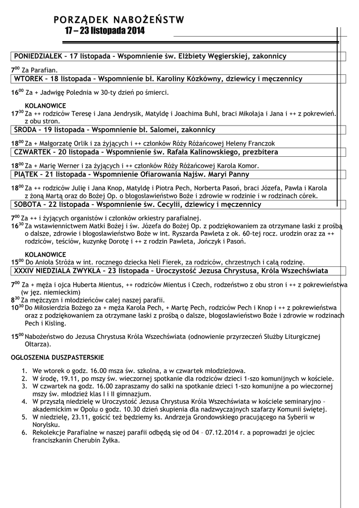 PORZĄDEK NABOŻEŃSTW 17 – 23 listopada 2014 PONIEDZIAŁEK – 17 listopada – Wspomnienie św. Elżbiety Węgierskiej, zakonnicy 700 Za Parafian. WTOREK – 18 listopada – Wspomnienie bł. Karoliny Kózkówny, dziewicy i męczennicy 1600 Za + Jadwigę Polednia w 30-ty dzień po śmierci. KOLANOWICE 17 Za ++ rodziców Teresę i Jana Jendrysik, Matyldę i Joachima Buhl, braci Mikołaja i Jana i ++ z pokrewień. z obu stron. 30 ŚRODA – 19 listopada – Wspomnienie bł. Salomei, zakonnicy 1800 Za + Małgorzatę Orlik i za żyjących i ++ członków Róży Różańcowej Heleny Franczok CZWARTEK – 20 listopada – Wspomnienie św. Rafała Kalinowskiego, prezbitera 1800 Za + Marię Werner i za żyjących i ++ członków Róży Różańcowej Karola Komor. PIĄTEK – 21 listopada – Wspomnienie Ofiarowania Najśw. Maryi Panny 1800 Za ++ rodziców Julię i Jana Knop, Matyldę i Piotra Pech, Norberta Pasoń, braci Józefa, Pawła i Karola z żoną Martą oraz do Bożej Op. o błogosławieństwo Boże i zdrowie w rodzinie i w rodzinach córek. SOBOTA – 22 listopada – Wspomnienie św. Cecylii, dziewicy i męczennicy 700 Za ++ i żyjących organistów i członków orkiestry parafialnej. 1630 Za wstawiennictwem Matki Bożej i św. Józefa do Bożej Op. z podziękowaniem za otrzymane łaski z prośbą o dalsze, zdrowie i błogosławieństwo Boże w int. Ryszarda Pawleta z ok. 60-tej rocz. urodzin oraz za ++ rodziców, teściów, kuzynkę Dorotę i ++ z rodzin Pawleta, Jończyk i Pasoń. KOLANOWICE 1500 Do Anioła Stróża w int. rocznego dziecka Neli Fierek, za rodziców, chrzestnych i całą rodzinę. XXXIV NIEDZIALA ZWYKŁA – 23 listopada – Uroczystość Jezusa Chrystusa, Króla Wszechświata 700 Za + męża i ojca Huberta Mientus, ++ rodziców Mientus i Czech, rodzeństwo z obu stron i ++ z pokrewieństwa (w jęz. niemieckim) 830 Za mężczyzn i młodzieńców całej naszej parafii. 1030 Do Miłosierdzia Bożego za + męża Karola Pech, + Martę Pech, rodziców Pech i Knop i ++ z pokrewieństwa oraz z podziękowaniem za otrzymane łaski z prośbą o dalsze, błogosławieństwo Boże i zdrowie w rodzinach Pech i Kisling. 1500 Nabożeństwo do Jezusa Chrystusa Króla Wszechświata (odnowienie przyrzeczeń Służby Liturgicznej Ołtarza). OGŁOSZENIA DUSZPASTERSKIE 1. We wtorek o godz. 16.00 msza św. szkolna, a w czwartek młodzieżowa. 2. W środę, 19.11, po mszy św. wieczornej spotkanie dla rodziców dzieci 1-szo komunijnych w kościele. 3. W czwartek na godz. 16.00 zapraszamy do salki na spotkanie dzieci 1-szo komunijne a po wieczornej mszy św. młodzież klas I i II gimnazjum. 4. W przyszłą niedzielę w Uroczystość Jezusa Chrystusa Króla Wszechświata w kościele seminaryjno – akademickim w Opolu o godz. 10.30 dzień skupienia dla nadzwyczajnych szafarzy Komunii świętej. 5. W niedzielę, 23.11, gościć też będziemy ks. Andrzeja Grondowskiego pracującego na Syberii w Norylsku. 6. Rekolekcje Parafialne w naszej parafii odbędą się od 04 – 07.12.2014 r. a poprowadzi je ojciec franciszkanin Cherubin Żyłka. PORZĄDEK NABOŻEŃSTW 24 – 30 listopada 2014 PONIEDZIAŁEK – 24 listopada – Wspomnienie św. męczenników Andrzeja Dung-Lac i Towarzyszy 700 Za Parafian. WTOREK – 25 listopada 1600 Do Bożej Op. z podziękowaniem za otrzymane łaski z prośbą o dalsze, błogosławieństwo Boże i zdrowie w rodzinie Tarara oraz za ++ z rodzin Tarara i Slota. KOLANOWICE 1730 Za + męża i ojca Emila Twardon, rodziców Michała i Katarzynę Mathea, teściów Martę i Józefa Twardon, dwie siostry, brata Jana i ++ z rodzin Mathea i Twardon. ŚRODA – 26 listopada 700 Za dusze w czyśćcu cierpiące. CZWARTEK – 27 listopada 1800 W intencji młodzieży całej naszej parafii o potrzebne łaski, błogosławieństwo Boże, zdrowie i dary Ducha Świętego. PIĄTEK – 28 listopada 700 Za prześladowanych katolików o moc wiary, nadziei i miłości oraz o opamiętanie dla prześladowców. SOBOTA – 29 listopada 700 Za ++ z rodzin Muc i Cwajkowski o radość życia wiecznego. KOLANOWICE 1700 Za + męża Andrzeja Piwowarczyka w 20-tą rocz. śmierci, teścia, rodziców i ++ dziadków z obu stron. I NIEDZIALA ADWENTU – 30 listopada 700 Za Parafian. 830 Do Bożej Op. z podziękowaniem za otrzymane łaski z prośbą o zdrowie i błogosławieństwo Boże w rodzinie Józefa Glados, w rodzinach córek oraz za ++ rodziców Józefa i Apolonię Grzesik, ojca Pawła Glados, wnuka Dawida oraz o zdrowie dla Damiana. 1030 Za ++ rodziców Anastazje i Jana Konieczko, ojca Kazimierza Budnik i ++ z pokrewieństwa. 1500 Nabożeństwo Adwentowe. OGŁOSZENIA DUSZPASTERSKIE 1. W czwartek o 16.00, ostatnie w tym roku kalendarzowym spotkanie dla dzieci 1-szo komunijnych. 2. W czwartek po mszy św. wieczornej spotkanie dla młodzieży ponadgimnazjalnej całej nasze parafii. 3. W przyszłą niedzielę przypada I Niedziela Adwentu. Na nabożeństwie adwentowym błogosławieństwo wieńców, świec i lamp adwentowych oraz opłatków, które będzie można już nabyć na nasze wigilijne stoły. 4. W czasie adwentu spotkań w salce dla dzieci i młodzieży nie będzie, ale wszystkich gorąco zapraszamy na msze św. roratnie. Ogłoszenia i intencje można znaleźć w Internecie: www.osowiecslaski.pl lub www.kolanowice.com.pl www.wegry.turawa.pl