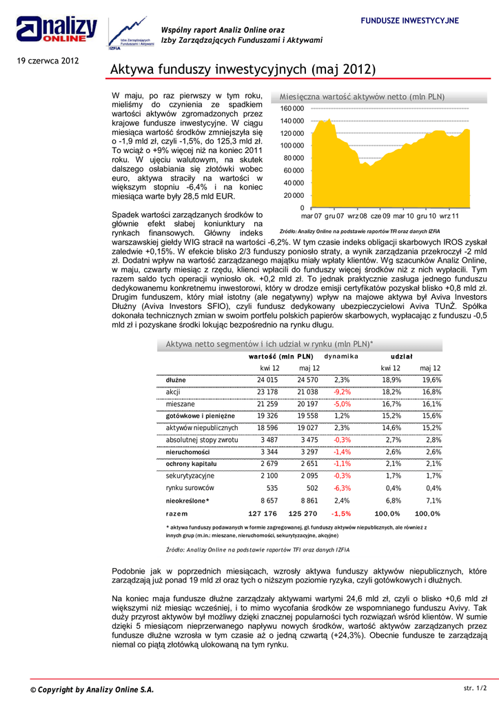 FUNDUSZE INWESTYCYJNE Wspólny raport Analiz Online oraz Izby Zarządzających Funduszami i Aktywami 19 czerwca 2012 Aktywa funduszy inwestycyjnych (maj 2012) W maju, po raz pierwszy w tym roku, mieliśmy do czynienia ze spadkiem wartości aktywów zgromadzonych przez krajowe fundusze inwestycyjne. W ciągu miesiąca wartość środków zmniejszyła się o -1,9 mld zł, czyli -1,5%, do 125,3 mld zł. To wciąż o +9% więcej niż na koniec 2011 roku. W ujęciu walutowym, na skutek dalszego osłabiania się złotówki wobec euro, aktywa straciły na wartości w większym stopniu -6,4% i na koniec miesiąca warte były 28,5 mld EUR. Miesięczna wartość aktywów netto (mln PLN) 160 000 140 000 120 000 100 000 80 000 60 000 40 000 20 000 0 Spadek wartości zarządzanych środków to mar 07 gru 07 wrz 08 cze 09 mar 10 gru 10 wrz 11 głównie efekt słabej koniunktury na Źródło: Analizy Online na podstawie raportów TFI oraz danych IZFiA rynkach finansowych. Główny indeks warszawskiej giełdy WIG stracił na wartości -6,2%. W tym czasie indeks obligacji skarbowych IROS zyskał zaledwie +0,15%. W efekcie blisko 2/3 funduszy poniosło straty, a wynik zarządzania przekroczył -2 mld zł. Dodatni wpływ na wartość zarządzanego majątku miały wpłaty klientów. Wg szacunków Analiz Online, w maju, czwarty miesiąc z rzędu, klienci wpłacili do funduszy więcej środków niż z nich wypłacili. Tym razem saldo tych operacji wyniosło ok. +0,2 mld zł. To jednak praktycznie zasługa jednego funduszu dedykowanemu konkretnemu inwestorowi, który w drodze emisji certyfikatów pozyskał blisko +0,8 mld zł. Drugim funduszem, który miał istotny (ale negatywny) wpływ na majowe aktywa był Aviva Investors Dłużny (Aviva Investors SFIO), czyli fundusz dedykowany ubezpieczycielowi Aviva TUnŻ. Spółka dokonała technicznych zmian w swoim portfelu polskich papierów skarbowych, wypłacając z funduszu -0,5 mld zł i pozyskane środki lokując bezpośrednio na rynku długu. Aktywa netto segmentów i ich udział w rynku (mln PLN)* war t o ść (ml n P LN) d y nami k a u d z i ał kwi 12 maj 12 kwi 12 maj 12 dłużne 24 015 24 570 2,3% 18,9% 19,6% akcji 23 178 21 038 -9,2% 18,2% 16,8% mieszane 21 259 20 197 -5,0% 16,7% 16,1% gotówkowe i pieniężne 19 326 19 558 1,2% 15,2% 15,6% aktywów niepublicznych 18 596 19 027 2,3% 14,6% 15,2% absolutnej stopy zwrotu 3 487 3 475 -0,3% 2,7% 2,8% nieruchomości 3 344 3 297 -1,4% 2,6% 2,6% ochrony kapitału 2 679 2 651 -1,1% 2,1% 2,1% sekurytyzacyjne 2 100 2 095 -0,3% 1,7% 1,7% rynku surowców nieokreślone* r az e m 535 502 -6,3% 0,4% 0,4% 8 657 8 861 2,4% 6,8% 7,1% 127 176 125 270 - 1, 5% 100, 0% 100, 0% * aktywa funduszy podawanych w formie zagregowanej, gł. funduszy aktywów niepublicznych, ale również z innych grup (m.in.: mieszane, nieruchomości, sekurytyzacyjne, akcyjne) Źródło: Analizy On lin e n a pods tawie raportów TFI oraz danych IZFiA Podobnie jak w poprzednich miesiącach, wzrosły aktywa funduszy aktywów niepublicznych, które zarządzają już ponad 19 mld zł oraz tych o niższym poziomie ryzyka, czyli gotówkowych i dłużnych. Na koniec maja fundusze dłużne zarządzały aktywami wartymi 24,6 mld zł, czyli o blisko +0,6 mld zł większymi niż miesiąc wcześniej, i to mimo wycofania środków ze wspomnianego funduszu Avivy. Tak duży przyrost aktywów był możliwy dzięki znacznej popularności tych rozwiązań wśród klientów. W sumie dzięki 5 miesiącom nieprzerwanego napływu nowych środków, wartość aktywów zarządzanych przez fundusze dłużne wzrosła w tym czasie aż o jedną czwartą (+24,3%). Obecnie fundusze te zarządzają niemal co piątą złotówką ulokowaną na tym rynku. © Copyright by Analizy Online S.A. str. 1/2 FUNDUSZE INWESTYCYJNE Wspólny raport Analiz Online oraz Izby Zarządzających Funduszami i Aktywami 19 czerwca 2012 Aktywa funduszy inwestycyjnych (maj 2012) Popularnością wśród klientów cieszą się również fundusze gotówkowe i pieniężne, których aktywa przyrosły w maju o blisko +250 mln zł, czyli o +1,2% do 19,6 mld zł. Pozostałe segmenty rynku zakończyły miesiąc z uszczuplonymi środkami. W największym stopniu spadek aktywów dotknął funduszy akcyjnych, których majątek skurczył się niemal o jedną dziesiątą (-2,1 mld zł). Do spadku wartości aktywów przyczyniły się zarówno bardzo słabe warunki panujące na rynkach, jak również odkupienia klientów, którzy drugi miesiąc z rzędu wypłacili netto kilkaset mln zł. W efekcie wartość zarządzanych środków skurczyła się do 21 mld zł, o -1,6% mniejszymi niż na koniec grudnia zeszłego roku. Fundusze mieszane tracą aktywa już od wielu miesięcy. W maju ubytek przekroczył -1 mld zł, czyli -5%. Na koniec miesiąca wartość środków, którymi zarządzają, zbliżyła się już do 20 mld zł. Znaczny spadek aktywów notują również fundusze rynku surowców. Środki w nich ulokowane skurczyły się od początku roku już o ponad -23% do 0,5 mld zł na koniec maja. W minionym miesiącu spadek aktywów odnotowały także fundusze ochrony kapitału (-1,1%), nieruchomości (-1,4%) oraz po -0,3%: absolutnej stopy zwrotu oraz sekurytyzacyjne. Zespół Analiz Online Spółka Analizy Online jest niezależną firmą analityczną zajmującą się monitoringiem rynku polskich i zagranicznych instytucji zbiorowego lokowania środków: funduszy inwestycyjnych, emerytalnych oraz ubezpieczeniowych funduszy kapitałowych). W zakres analiz rynku funduszy wchodzą między innymi rankingi funduszy, ocena efektywności działań zarządzających oraz analiza ich wpływu na polski rynek finansowy. Działalności firmy obejmuje również monitoring rynku produktów strukturyzowanych, zmian akcjonariatu polskich spółek publicznych oraz analizę rynku polskich papierów dłużnych. Izba Zarządzających Funduszami i Aktywami jest organizacją zrzeszającą, na zasadach dobrowolności, działające w Polsce towarzystwa 