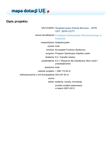 Opis projektu tytuł projektu: Świętokrzyska Szkoła Biznesu - SPIN OFF, SPIN OUTT nazwa beneficjenta: Fundacja Uniwersytetu Ekonomicznego w Krakowie województwo: świętokrzyskie powiat: brak fundusz: Europejski Fundusz Społeczny program: Program Operacyjny Kapitał Ludzki działanie: 8.2. Transfer wiedzy poddziałanie: 8.2.1 Wsparcie dla współpracy sfery nauki i przedsiębiorstw dziedzina: brak wartość projektu: 1 098 173.92 zł dofinansowanie z Unii Europejskiej: 933 447.83 zł ocena: sektor: badania, rozwój, innowacje punktor projekt realizowany w latach 2007-2013