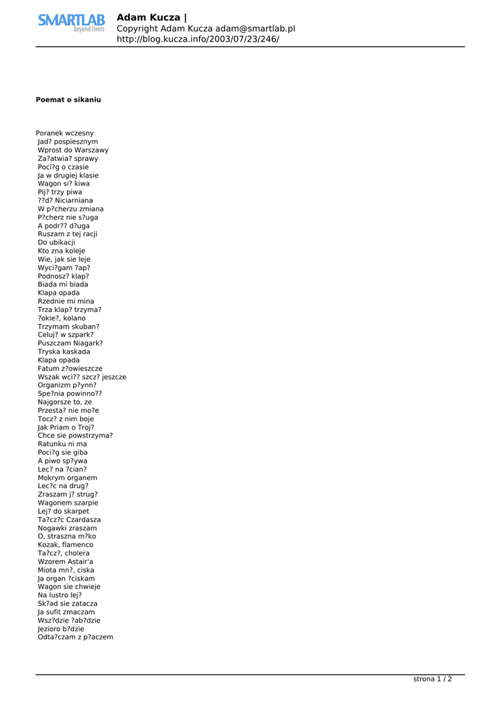 Adam Kucza | Copyright Adam Kucza [email protected] http://blog.kucza.info/2003/07/23/246/ Poemat o sikaniu Poranek wczesny Jad? pospiesznym Wprost do Warszawy Za?atwia? sprawy Poci?g o czasie Ja w drugiej klasie Wagon si? kiwa Pij? trzy piwa ??d? Niciarniana W p?cherzu zmiana P?cherz nie s?uga A podr?? d?uga Ruszam z tej racji Do ubikacji Kto zna koleje Wie, jak sie leje Wyci?gam ?ap? Podnosz? klap? Biada mi biada Klapa opada Rzednie mi mina Trza klap? trzyma? ?okie?, kolano Trzymam skuban? Celuj? w szpark? Puszczam Niagark? Tryska kaskada Klapa opada Fatum z?owieszcze Wszak wci?? szcz? jeszcze Organizm p?ynn? Spe?nia powinno?? Najgorsze to, ze Przesta? nie mo?e Tocz? z nim boje Jak Priam o Troj? Chce sie powstrzyma? Ratunku ni ma Poci?g sie giba A piwo sp?ywa Lec? na ?cian? Mokrym organem Lec?c na drug? Zraszam j? strug? Wagonem szarpie Lej? do skarpet Ta?cz?c Czardasza Nogawki zraszam O, straszna m?ko Kozak, flamenco Ta?cz?, cholera Wzorem Astair'a Miota mn?, ciska Ja organ ?ciskam Wagon sie chwieje Na lustro lej? Sk?ad sie zatacza Ja sufit zmaczam Wsz?dzie ?ab?dzie Jezioro b?dzie Odta?czam z p?aczem strona 1 / 2 Adam Kucza | Copyright Adam Kucza [email protected] http://blog.kucza.info/2003/07/23/246/ La Kukaracz? Zwrotnica, podskok Spryskuj? okno Nier?wne z??cza Buty nas?czam Poci?g hamuje Drzwi obsikuj? I pasa?era Co drzwi otwiera Plus dawka spora Na konduktora Resztka mi kapie Na skr?t PKP Wreszcie poma?u Brn? do przedzia?u Pasa?erowie Patrz? spod powiek Pytania sk?pe Gdzie pan wzi?? k?piel?" Warszawa, Bo?e! Nareszcie dworzec! Chwilo szcz??liwa Na peron sp?ywam Walizk? trzymam Odzie? wy?ymam Ach, urlop b?ogi Od fizjologii Ulga bezbrze?na Poci?g odje?d?a Rusza maszyna Hen w dal Po szczy... Po szynach strona 2 / 2