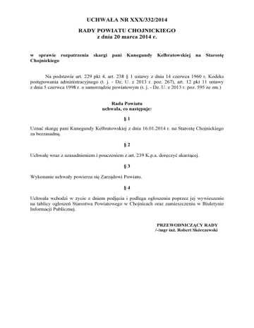 UCHWAŁA NR XXX/332/2014 RADY POWIATU CHOJNICKIEGO z dnia 20 marca 2014 r. w sprawie rozpatrzenia skargi pani Kunegundy Kelbratowskiej na Starostę Chojnickiego Na podstawie art. 229 pkt 4, art. 238 § 1 ustawy z dnia 14 czerwca 1960 r. Kodeks postępowania administracyjnego (t. j. - Dz. U. z 2013 r. poz. 267), art. 12 pkt 11 ustawy z dnia 5 czerwca 1998 r. o samorządzie powiatowym (t. j. - Dz. U. z 2013 r. poz. 595 ze zm.) Rada Powiatu uchwala, co następuje: §1 Uznać skargę pani Kunegundy Kelbratowskiej z dnia 16.01.2014 r. na Starostę Chojnickiego za bezzasadną. §2 Uchwałę wraz z uzasadnieniem i pouczeniem z art. 239 K.p.a. doręczyć skarżącej. §3 Wykonanie uchwały powierza się Zarządowi Powiatu. §4 Uchwała wchodzi w życie z dniem podjęcia i podlega ogłoszeniu poprzez jej wywieszenie na tablicy ogłoszeń Starostwa Powiatowego w Chojnicach oraz zamieszczeniu w Biuletynie Informacji Publicznej. PRZEWODNICZĄCY RADY /-/mgr inż. Robert Skórczewski 2 UZASADNIENIE Zgodnie z art. 229 pkt 4 ustawy z dnia 14 czerwca 1960 r. - Kodeks postępowania administracyjnego (t. j. - Dz. U. z 2013 r. poz. 267) organem właściwym do rozpatrzenia skargi dotyczącej zadań lub działalności zarządu powiatu oraz starosty jest rada powiatu. Komisja Rewizyjna Rady Powiatu Chojnickiego po zapoznaniu się ze skargą i wyjaśnieniami pani dyrektor Wydziału Ochrony Środowiska, Rolnictwa i Leśnictwa Starostwa Powiatowego w Chojnicach stwierdziła, że: Postępowanie administracyjne prowadzone przez Wydział Ochrony Środowiska, Rolnictwa i Leśnictwa w sprawie utrzymania urządzeń melioracji wodnych szczegółowych w miejscowości Gotelp, gmina Czersk na działkach 191, 190/1, 187, 141/3, 143, 139, 179/1, 177/2, 180, 140, 144, 213/1, 177/3, 175/7, 260/2, 172/1, 168, 171/1, 164/1 jest prowadzone prawidłowo. Rów melioracyjny położony w miejscowości Gotelp, gmina Czersk został zakwalifikowany zgodnie z art. 73 ust. 1 pkt 1 ustawy z dnia 18 lipca 2001 r. Prawo wodne (t. j. - Dz. U. z 2012 r. poz. 145 ze zm.), jako urządzenie melioracji wodnych szczegółowych. Zgodnie z art. 70 ust. 1 ustawy Prawo wodne – melioracje wodne polegają na regulacji stosunków wodnych w celu polepszenia zdolności produkcyjnej gleby, ułatwienia jej uprawy oraz na ochronie użytków rolnych przed powodziami. Rów melioracyjny położony w Gotelpiu służy powyższym celom, gdyż odwadnia grunty rolne (łąki, pastwiska, pola uprawne). Zgodnie z art. 77 ustawy Prawo wodne zostały wydane stosowne decyzje administracyjne zobowiązujące właścicieli użytków rolnych odnoszących korzyści z przedmiotowego rowu melioracji wodnych szczegółowych do jego konserwacji określając termin, zakres oraz sposób jej przeprowadzenia, gdyż na tym terenie nie działa żadna spółka wodna, która byłaby zobowiązana do właściwego utrzymania urządzenia melioracji wodnych szczegółowych. Od decyzji służy stronie prawo wniesienia odwołania do Dyrektora Regionalnego Zarządu Gospodarki Wodnej w Gdańsku w terminie 14 dni. W przypadku prowadzonego postępowania żadna ze stron z tego prawa nie skorzystała. Po terminie wyznaczonym do wykonania konserwacji przeprowadza się oględziny i w przypadku nie wywiązania się z tego obowiązku prowadzi się postępowanie egzekucyjne na podstawie ustawy z dnia 17 czerwca 1966 r. o postępowaniu egzekucyjnym w administracji (t. j. - Dz. U. z 2012 r. poz. 1015). W prowadzonym postępowaniu znak: OS.6331.6.2013 z wniosku z dnia 28 maja 2013 r. taka sytuacja miała miejsce, co skutkowało przesunięciem terminu zakończenia konserwacji pierwszego odcinka – do dnia 29 listopada 2013 r. Nadal prowadzone jest postępowanie znak: OS.6331.16.2013 w sprawie dalszej konserwacji urządzenia melioracji wodnych szczegółowych w Gotelpiu – drugi etap. Postępowanie prowadzone jest na podstawie art. 77 ustawy Prawo wodne z zachowaniem terminów. Wykonanie konserwacji przez strony zgodnie z wydanymi decyzjami administracyjnymi na konserwację urządzenia melioracji wodnych szczegółowych w Gotelpiu spowoduje stworzenie właściwych stosunków wodnych na gruncie, polepszenie zdolności produkcyjnej gleby, ułatwienie jej uprawy oraz służyć będzie ochronie użytków rolnych przed powodziami. Nie jest więc tak, jak pisze pani Kunegunda Kelbratowska, że „Starostwo Powiatowe w Chojnicach nie rozwiązało od czerwca 2013 r. po dzień dzisiejszy problemu odwodnienia wsi”. Również stwierdzenie pani Kelbratowskiej, że „Starostwo także nie załatwiło sprawy odkopania rowu na działce właściciela i wzdłuż szosy od pompy (studni) wiejskiej do przepustu po drugiej stronie szosy naprzeciwko mojego domu” jest nieuzasadnione, gdyż nie jest to przedmiotem rozpoznania w prowadzonym przez wydział OS postępowaniu. Zgodnie z 3 ustaleniami z oględzin i na podstawie zebranych dowodów w sprawie na działce nr 213/1 (po drugiej stronie drogi powiatowej położonej na działce nr 145) nie ma możliwości wydania decyzji administracyjnych zgodnie z art. 77 ust. 1 i 2 ustawy z dnia 18 lipca 2001 r. Prawo wodne (t. j. - Dz. U. z 2012 r. poz.145 ze zm.), gdyż na mapach ewidencyjnych nie występują żadne urządzenia melioracji wodnych szczegółowych, które wpływałyby na stworzenie właściwych stosunków wodnych w celu polepszenia zdolności produkcyjnej gleby. Zainteresowany wykonaniem urządzenia wodnego na w/w działce winien wystąpić do Starosty z wnioskiem o wydanie pozwolenia wodno prawnego, załączając operat wodno prawny i inne uzgodnienia wymagane w przepisach prawa zgodnie z art. 122 ust. 1 pkt 3 ustawy z dnia 18 lipca 2001 r. Prawo wodne (t. j. - Dz. U. z 2012 r. poz.145 ze zm.). Zawilgocenie, a także pękanie ścian (piwnicy) budynków znajdujących się na działce nr 191 należałoby rozważyć pod względem budowlanym, tj. czy w budynku jest izolacja przeciwwilgociowa fundamentów, czy przy sporządzaniu projektu budowlanego uwzględniono wysoki poziom w