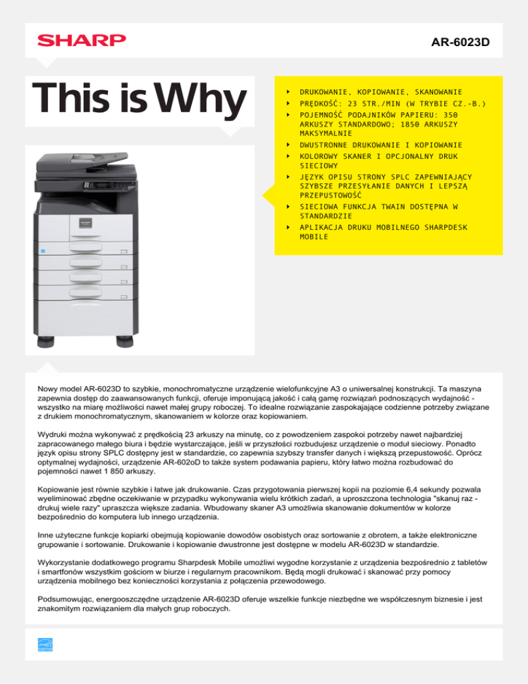 AR-6023D DRUKOWANIE, KOPIOWANIE, SKANOWANIE PRĘDKOŚĆ: 23 STR./MIN (W TRYBIE CZ.-B.) POJEMNOŚĆ PODAJNIKÓW PAPIERU: 350 ARKUSZY STANDARDOWO; 1850 ARKUSZY MAKSYMALNIE DWUSTRONNE DRUKOWANIE I KOPIOWANIE KOLOROWY SKANER I OPCJONALNY DRUK SIECIOWY JĘZYK OPISU STRONY SPLC ZAPEWNIAJĄCY SZYBSZE PRZESYŁANIE DANYCH I LEPSZĄ PRZEPUSTOWOŚĆ SIECIOWA FUNKCJA TWAIN DOSTĘPNA W STANDARDZIE APLIKACJA DRUKU MOBILNEGO SHARPDESK MOBILE Nowy model AR-6023D to szybkie, monochromatyczne urządzenie wielofunkcyjne A3 o uniwersalnej konstrukcji. Ta maszyna zapewnia dostęp do zaawansowanych funkcji, oferuje imponującą jakość i całą gamę rozwiązań podnoszących wydajność wszystko na miarę możliwości nawet małej grupy roboczej. To idealne rozwiązanie zaspokajające codzienne potrzeby związane z drukiem monochromatycznym, skanowaniem w kolorze oraz kopiowaniem. Wydruki można wykonywać z prędkością 23 arkuszy na minutę, co z powodzeniem zaspokoi potrzeby nawet najbardziej zapracowanego małego biura i będzie wystarczające, jeśli w przyszłości rozbudujesz urządzenie o moduł sieciowy. Ponadto język opisu strony SPLC dostępny jest w standardzie, co zapewnia szybszy transfer danych i większą przepustowość. Oprócz optymalnej wydajności, urządzenie AR-602oD to także system podawania papieru, który łatwo można rozbudować do pojemności nawet 1 850 arkuszy. Kopiowanie jest równie szybkie i łatwe jak drukowanie. Czas przygotowania pierwszej kopii na poziomie 6,4 sekundy pozwala wyeliminować zbędne oczekiwanie w przypadku wykonywania wielu krótkich zadań, a uproszczona technologia "skanuj raz drukuj wiele razy" upraszcza większe zadania. Wbudowany skaner A3 umożliwia skanowanie dokumentów w kolorze bezpośrednio do komputera lub innego urządzenia. Inne użyteczne funkcje kopiarki obejmują kopiowanie dowodów osobistych oraz sortowanie z obrotem, a także elektroniczne grupowanie i sortowanie. Drukowanie i kopiowanie dwustronne jest dostępne w modelu AR-6023D w standardzie. Wykorzystanie dodatkowego programu Sharpdesk Mobile umożliwi wygodne korzystanie z urządzenia bezpośrednio z tabletów i smartfonów wszystkim gościom w biurze i regularnym pracownikom. Będą mogli drukować i skanować przy pomocy urządzenia mobilnego bez konieczności korzystania z połączenia przewodowego. Podsumowując, energooszczędne urządzenie AR-6023D oferuje wszelkie funkcje niezbędne we współczesnym biznesie i jest znakomitym rozwiązaniem dla małych grup roboczych. KOPIARKA OGÓLNE Szybkość urządzenia, tryb cz.-b. w str./min (A4): 23 Szybkość urządzenia, tryb cz.-b. w str./min (A3): 12 Format papieru: min.- maks.: A6R - A3 Gramatura papieru (g/m²): 55 - 200 Pojemność: standardowa (arkuszy): 350 Pojemność: maks. (arkuszy): 1850 Czas nagrzewania (w sekundach): 25 Pamięć ogólna min./maks. (MB): 64 - 192 Dupleks: STD Wymagania dotyczące źródła zasilania - sieciowe napięcie lokalne (Hz): 220 - 240V, 50/60Hz Pobór mocy (kW): 1,2 Wymiary (mm): 599 x 612 x 511 Waga (kg): 28,2 PODAJNIK DOKUMENTÓW Pojemność podajnika oryginałów (kartek): OPT 100 Format oryginału (maks.): A3 Czas pierwszej kopii cz.-b. (sek.): 6,4 Sorter elektroniczny (standard): Kopiowanie ciągłe (maks. kopii): 999 Rozdzielczość skanowania w trybie cz.-b. (dpi): 600 x 600 Rozdzielczość druku (dpi): 600 x 600 Gradacja (liczba odcieni) - tryb czarno-biały: 256 Zakres regulacji skali (%): 25 - 400 Zaprogramowane skale kopiowania: 10 SKANER Skaner sieciowy (std./opcja): OPT Skanowanie w trybach "pull scan" i "push scan": Rozdzielczość w trybie "push scan" (dpi): 50 - 9600 Rozdzielczość w trybie "pull scan" (dpi): 75,100, 150,200, 300,400, 600 Formaty plików: TIFF, PDF, JPG, BMP Narzędzia skanera: Sharpdesk (OPT) Skanowanie na pulpit: Skanowanie do pamięci USB: DRUKARKA OPCJE WYKAŃCZANIA Rozdzielczość (dpi): 600 x 600 Drukarka sieciowa (std./opcja): Opcja Interfejs standardowy/opcjonalny: Standard: 10Base-T/100Base-TX Obsługiwane systemy operacyjne - standardowo: Windows Server 2003, Windows Server 2003R2, Windows Server 2008, Windows Server 2008R2, Windows Server 2012, Windows Server 2012R2, Windows Vista, Windows 7, Windows 8, Windows 8.1 Obsługiwane systemy operacyjne - opcjonalnie: Mac OS X 10.4,10.5,10.6,10.7,10.8,10.9,10.10 Protokoły sieciowe: protokół TCP/IP Protokoły druku: LPR, Raw TCP, IPP (opcja) PDL std./opcja: Std:SPLC, PCL6 emulation, Opt: PostScript® 3 ™ emulation Dostępne czcionki: 80 fonts for PCL, 136 fonts for PostScript® 3™ emulation www.sharp.pl Powered by TCPDF (www.tcpdf.org) Maksymalna wydajność wyjściowa: 250 sheets SHARP ELECTRONICS (EUROPE) GMBH SPółKA Z O. O. ODDZIAł W POLSCE UL. POLECZKI 33 BUDYNEK A2 02-822 WARSZAWA TEL.: +48 22 545 81 00 FAKS: +48 22 545 81 00 FAKS: +48 22 545 81 05 WWW.SHARP.PL