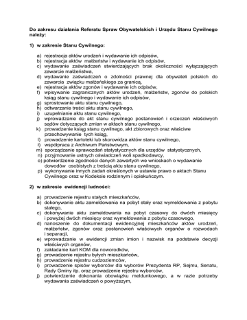 Do zakresu działania Referatu Spraw Obywatelskich i Urzędu Stanu Cywilnego należy: 1) w zakresie Stanu Cywilnego: a) rejestracja aktów urodzeń i wydawanie ich odpisów, b) rejestracja aktów małżeństw i wydawanie ich odpisów, c) wydawanie zaświadczeń stwierdzających brak okoliczności wyłączających zawarcie małżeństwa, d) wydawanie zaświadczeń o zdolności prawnej dla obywateli polskich do zawarcia związku małżeńskiego za granicą, e) rejestracja aktów zgonów i wydawanie ich odpisów, f) wpisywanie zagranicznych aktów urodzeń, małżeństw, zgonów do polskich ksiąg stanu cywilnego i wydawanie ich odpisów, g) sprostowanie aktu stanu cywilnego, h) odtwarzanie treści aktu stanu cywilnego, i) uzupełnianie aktu stanu cywilnego, j) wprowadzanie do akt stanu cywilnego postanowień i orzeczeń właściwych sądów dotyczących zmian w aktach stanu cywilnego, k) prowadzenie ksiąg stanu cywilnego, akt zbiorowych oraz właściwe przechowywanie tych ksiąg, l) prowadzenie kartoteki lub skorowidza aktów stanu cywilnego, ł) współpraca z Archiwum Państwowym, m) sporządzanie sprawozdań statystycznych dla urzędów statystycznych, n) przyjmowanie ustnych oświadczeń woli spadkodawcy, o) potwierdzenie zgodności danych zawartych we wnioskach o wydawanie dowodów osobistych z treścią aktu stanu cywilnego, p) wykonywanie innych zadań określonych w ustawie prawo o aktach Stanu Cywilnego oraz w Kodeksie rodzinnym i opiekuńczym. 2) w zakresie ewidencji ludności: a) prowadzenie rejestru stałych mieszkańców, b) dokonywanie aktu zameldowania na pobyt stały oraz wymeldowania z pobytu stałego, c) dokonywanie aktu zameldowania na pobyt czasowy do dwóch miesięcy i powyżej dwóch miesięcy oraz wymeldowania z pobytu czasowego, d) nanoszenie do dokumentacji ewidencyjnej mieszkańców aktów urodzeń, małżeństw, zgonów oraz postanowień właściwych organów o rozwodach i separacji, e) wprowadzanie w ewidencji zmian imion i nazwisk na podstawie decyzji właściwych organów, f) zakładanie kart KOM dla noworodków, g) prowadzenie rejestru byłych mieszkańców, h) prowadzenie rejestru cudzoziemców, i) prowadzenie spisów wyborców dla wyborów Prezydenta RP, Sejmu, Senatu, Rady Gminy itp. oraz prowadzenie rejestru wyborców, j) potwierdzenie dokonania obowiązku meldunkowego, a w razie potrzeby wydawania zaświadczeń o powyższym, k) sporządzanie list i zestawień ludności dla potrzeb organów zdrowia, komend wojskowych, szkół i innych organów, l) współpraca z MSWiA w nadawaniu numeru ewidencyjnego PESEL dla noworodków, cudzoziemców oraz wymianie numeru ewidencyjnego, przesyłanie zameldowań na pobyt stały w przypadku wystąpienia migracji, m) współpraca z Wojewódzką Stacją Łączności Komputerowej w sprawach upowszechniania numerów ewidencyjnych, wyjaśniania rozbieżności pomiędzy LBD i WBD oraz sporządzanie sprawozdań. 3) w zakresie obsługi Rady Gminy i jej organów: a) b) c) d) kompletowanie i wysyłanie radnym materiałów na Sesję Rady Gminy, protokołowanie obrad Sesji Rady Gminy i jej Komisji, prowadzenie rejestru uchwał Rady Gminy, gromadzenie dokumentacji z działalności Rady Gminy, Komisji Rady oraz rad sołeckich, e) organizowanie obiegu informacji pomiędzy radnymi a organami Gminy, f) prowadzenie rejestru skarg, wniosków i interpelacji, g) obsługa kancelaryjno-techniczna Przewodniczącego Rady Gminy. 4) w zakresie działalności gospodarczej: a) prowadzenie ewidencji działalności gospodarczej, b) prowadzenie spraw dotyczących wydawania i cofania zezwoleń na sprzedaż napojów c) alkoholowych, d) prowadzenie spraw związanych z opłatami za zezwolenia na sprzedaż napojów alkoholowych, e) przygotowywanie projektów uchwał dotyczących usytuowania miejsc i warunków sprzedaży napojów alkoholowych. 5) w zakresie spraw obywatelskich: a) b) c) d) wydawanie dowodów osobistych, gromadzenie kopert osobowych, prowadzenie ewidencji wydanych i unieważnionych dowodów osobistych, prowadzenie dokumentacji wydawanych dowodów osobistych – koperty osobowe, e) prowadzenie dokumentacji dotyczącej pośrednictwa w wydawaniu dowodów osobistych,