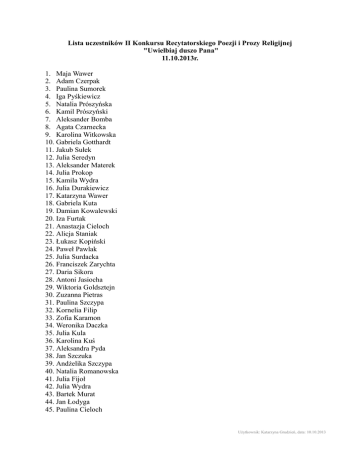 Lista uczestników II Konkursu Recytatorskiego Poezji i Prozy Religijnej "Uwielbiaj duszo Pana" 11.10.2013r. 1. Maja Wawer 2. Adam Czerpak 3. Paulina Sumorek 4. Iga Pyśkiewicz 5. Natalia Prószyńska 6. Kamil Prószyński 7. Aleksander Bomba 8. Agata Czarnecka 9. Karolina Witkowska 10. Gabriela Gotthardt 11. Jakub Sułek 12. Julia Seredyn 13. Aleksander Materek 14. Julia Prokop 15. Kamila Wydra 16. Julia Durakiewicz 17. Katarzyna Wawer 18. Gabriela Kuta 19. Damian Kowalewski 20. Iza Furtak 21. Anastazja Cieloch 22. Alicja Staniak 23. Łukasz Kopiński 24. Paweł Pawlak 25. Julia Surdacka 26. Franciszek Zarychta 27. Daria Sikora 28. Antoni Jasiocha 29. Wiktoria Goldsztejn 30. Zuzanna Pietras 31. Paulina Szczypa 32. Kornelia Filip 33. Zofia Karamon 34. Weronika Daczka 35. Julia Kula 36. Karolina Kuś 37. Aleksandra Pyda 38. Jan Szczuka 39. Andżelika Szczypa 40. Natalia Romanowska 41. Julia Fijoł 42. Julia Wydra 43. Bartek Murat 44. Jan Łodyga 45. Paulina Cieloch Użytkownik: Katarzyna Grudzień, data: 10.10.2013 46. Bartek Biernat 47. Aleksandra Godziszewska 48. Kinga Wołyńska 49. Julia Stefaniuk 50. Karolina Grzesiak 51. Anna Gębala 52. Aleksandra Capała 53. Aneta Cybula 54. Sebastian Maciocha 55. Weronika Adamczyk 56. Kinga Sawicka 57. Angelika Wargocka 58. Paulina Mróz 59. Dominika Misiewicz 60. Maciej Synowiec 61. Nina Stawska 62. Łukasz Śliwka 63. Bartłomiej Kurpiel 64. Paulina Kuta Użytkownik: Katarzyna Grudzień, data: 10.10.2013