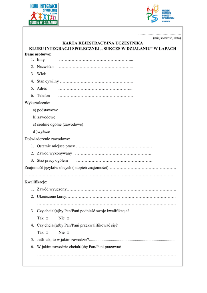 ………………………………. (miejscowość, data) KARTA REJESTRACYJNA UCZESTNIKA KLUBU INTEGRACJI SPOŁECZNEJ „ SUKCES W DZIAŁANIU” W ŁAPACH Dane osobowe: 1. Imię ……………………………………………... 2. Nazwisko ……………………………………………... 3. Wiek ……………………………………………… 4. Stan cywilny …………………………………………….. 5. Adres ……………………………………………... 6. Telefon ……………………………………………… Wykształcenie: a) podstawowe b) zawodowe c) średnie ogólne (zawodowe) d )wyższe Doświadczenie zawodowe: 1. Ostatnie miejsce pracy …………………………………………….… 2. Zawód wykonywany ………………………………………………. 3. Staż pracy ogółem ………………………………………………. Znajomość języków obcych ( stopień znajomości)…………………………………………. ……………………………………………………………………………………………… Kwalifikacje: 1. Zawód wyuczony……………………………………………………………………. 2. Ukończone kursy……………………………………………………………………. ………………………………………………………………………………………. 3. Czy chciał(a)by Pan/Pani podnieść swoje kwalifikacje? Tak □ Nie □ 4. Czy chciał(a)by Pan/Pani przekwalifikować się? Tak □ Nie □ 5. Jeśli tak, to w jakim zawodzie?................................................................................... 6. W jakim zawodzie chciał(a)by Pan/Pani pracować ………………………………………………………………………………………. Dodatkowe informacje: 1. Czy jest Pan/Pani zrejestrowany(a) w Powiatowym Urzędzie Pracy jako osoba bezrobotna? Tak □ Nie □ 2. Jak długo jest Pan/Pani osobą bezrobotną?.................................................................. 3. Czy korzysta Pan/Pani ze świadczeń pomocy społecznej? Tak □ Nie □ 4. Jeśli tak, to w jakiej formie?.......................................................................................... Wyrażam zgodę na przetwarzanie moich danych osobowych zawartych w karcie dla potrzeb niezbędnych do rejestracji i uczestnictwa w KIS zgodnie z ustawą z dn. 29.08.1997r. o Ochronie Danych Osobowych (Dz.U. z 2014 r, poz. 1182 z późn. zm.) …………………………………………….. (podpis pracownika KIS) ………………………………………... ( data i podpis uczestnika KIS)