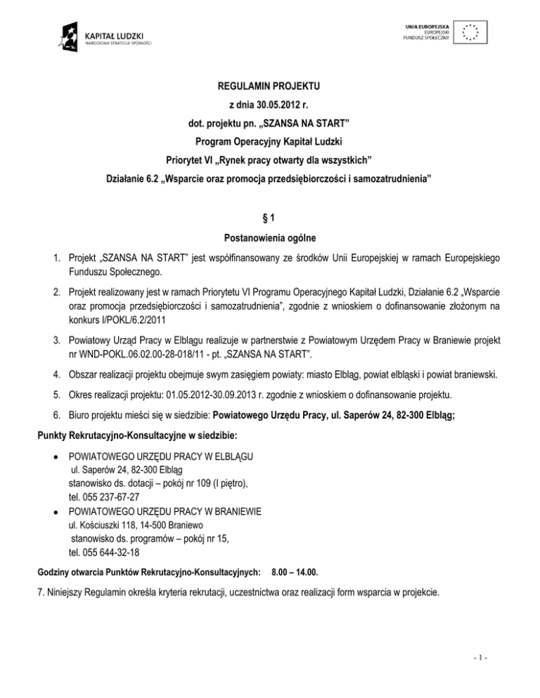 REGULAMIN PROJEKTU z dnia 30.05.2012 r. dot. projektu pn. „SZANSA NA START” Program Operacyjny Kapitał Ludzki Priorytet VI „Rynek pracy otwarty dla wszystkich” Działanie 6.2 „Wsparcie oraz promocja przedsiębiorczości i samozatrudnienia” §1 Postanowienia ogólne 1. Projekt „SZANSA NA START” jest współfinansowany ze środków Unii Europejskiej w ramach Europejskiego Funduszu Społecznego. 2. Projekt realizowany jest w ramach Priorytetu VI Programu Operacyjnego Kapitał Ludzki, Działanie 6.2 „Wsparcie oraz promocja przedsiębiorczości i samozatrudnienia”, zgodnie z wnioskiem o dofinansowanie złożonym na konkurs I/POKL/6.2/2011 3. Powiatowy Urząd Pracy w Elblągu realizuje w partnerstwie z Powiatowym Urzędem Pracy w Braniewie projekt nr WND-POKL.06.02.00-28-018/11 - pt. „SZANSA NA START”. 4. Obszar realizacji projektu obejmuje swym zasięgiem powiaty: miasto Elbląg, powiat elbląski i powiat braniewski. 5. Okres realizacji projektu: 01.05.2012-30.09.2013 r. zgodnie z wnioskiem o dofinansowanie projektu. 6. Biuro projektu mieści się w siedzibie: Powiatowego Urzędu Pracy, ul. Saperów 24, 82-300 Elbląg; Punkty Rekrutacyjno-Konsultacyjne w siedzibie: POWIATOWEGO URZĘDU PRACY W ELBLĄGU ul. Saperów 24, 82-300 Elbląg stanowisko ds. dotacji – pokój nr 109 (I piętro), tel. 055 237-67-27 POWIATOWEGO URZĘDU PRACY W BRANIEWIE ul. Kościuszki 118, 14-500 Braniewo stanowisko ds. programów – pokój nr 15, tel. 055 644-32-18 Godziny otwarcia Punktów Rekrutacyjno-Konsultacyjnych: 8.00 – 14.00. 7. Niniejszy Regulamin określa kryteria rekrutacji, uczestnictwa oraz realizacji form wsparcia w projekcie. -1- §2 Definicje Używane w ramach niniejszego Regulaminu określenia każdorazowo oznaczają: 1) Projekt - projekt pt. „SZANSA NA START” realizowany przez Gminę Miasto Elbląg/Powiatowy Urząd Pracy w Elblągu w partnerstwie z Powiatem Braniewskim/Powiatowym Urzędem Pracy w Braniewie; 2) Instytucja Pośrednicząca II stopnia (Instytucja Wdrażająca, IP2 – Wojewódzki Urząd Pracy w Olsztynie; 3) Beneficjent – Powiatowy Urząd Pracy w Elblągu, ul. Saperów 24 82-300 Elbląg, tel. 55 237-67-00, fax 55 2376799, www.elblag.up.gov.pl; 4) Partner – Powiatowy Urząd Pracy w Braniewie, ul. Kościuszki 118, 14-500 Braniewo, Tel. 55 644-32-22, fax 55 644-3224, www.pupbraniewo.pl; 5) Kandydat – osoba bezrobotna, starająca się o udział w Projekcie, która zamierza rozpocząć działalność gospodarczą i złożyła dokumenty rekrutacyjne. Osoba bezrobotna – oznacza osobę bezrobotną w rozumieniu Ustawy z dnia 20 kwietnia 2004 r. o promocji zatrudnienia i instytucjach rynku pracy (Dz. U. z 2008 r. Nr 69, poz. 415, z późn. zm.), w szczególności osobę, która jednocześnie jest osobą: niezatrudnioną i niewykonującą innej pracy zarobkowej, zdolną i gotową do podjęcia zatrudnienia w pełnym wymiarze czasu pracy obowiązującym w danym zawodzie lub służbie albo innej pracy zarobkowej, nieuczącą się w szkole, za wyjątkiem szkół dla dorosłych lub szkół wyższych w systemie wieczorowym albo zaocznym, zarejestrowaną we właściwym dla miejsca zameldowania stałego lub czasowego powiatowym urzędzie pracy oraz poszukującą zatrudnienia lub innej pracy zarobkowej, która ukończyła 18 lat i nie ukończyła 60 lat w przypadku kobiet lub 65 lat w przypadku mężczyzn, która nie nabyła prawa do emerytury lub renty z tytułu niezdolności do pracy, renty szkoleniowej, renty socjalnej, renty rodzinnej, która nie jest właścicielem lub posiadaczem samoistnym lub zależnym nieruchomości rolnej, o powierzchni użytków rolnych przekraczającej 2 ha przeliczeniowe. 6) Uczestnik/czka projektu – kandydat, który zostanie zakwalifikowany do Projektu zgodnie z zasadami określonymi w niniejszym Regulaminie, podpisze deklarację uczestnictwa w projekcie i skorzysta z form wsparcia zaproponowanych w Projekcie; 7) Beneficjent pomocy – uczestnik projektu, który rozpoczął prowadzenie działalności gospodarczej w ramach danego projektu oraz otrzymał pomoc publiczną de minimis; 8) Komisja Oceny Wniosków Beneficjentów Pomocy (KOW BP) – Komisja kwalifikująca i przyznająca środki na rozwój przedsiębiorczości - zespół oceniający wnioski rekrutacyjne oraz wnioski na otrzymanie jednorazowej -2- dotacji na rozpoczęcie działalności gospodarczej; 9) Szkolenie – usługa szkolenia grupowego z zakresu prowadzenia działalności gospodarczej „ABC przedsiębiorczości”, umożliwiająca zdobycie wiedzy i umiejętności w zakresie prowadzenia działalności gospodarczej. Warunkiem ukończenia szkolenia jest uzyskanie certyfikatu (udział w min. 80% zajęć); 10) Jednorazowa dotacja na rozpoczęcie działalności gospodarczej – bezzwrotna pomoc finansowa (dotacja), udzielana uczestnikowi projektu w formie dofinansowania podjęcia działalności gospodarczej w wysokości do 20.000,00 złotych na osobę; 11) Dzień przystąpienia do projektu – dzień podpisania przez kandydata deklaracji udziału w projekcie; 12) Wykonawca – osoba fizyczna, osoba prawna albo jednostka organizacyjna nieposiadająca osobowości prawnej, która zawarła umowę w sprawie realizacji zamówienia zaplanowanego w ramach Projektu. §3 Sposób informowania o Projekcie 1. Promocja projektu prowadzona będzie przez Powiatowy Urząd Pracy w Elblągu i Powiatowy Urząd Pracy w Braniewie. 2. Informacje o Projekcie dostępne będą: a) na stronach internetowych Beneficjenta i Partnera: PUP w Elblągu – www.elblag.up.gov.pl PUP w Braniewie – www.pupbraniewo.pl b) w Biurze Projektu i Punktach Rekrutacyjno-Konsultacyjnych wskazanych w §1 pkt. 6; c) na materiałach promocyjno – informacyjnych (plakaty, ulotki, informacje w gablotach promujące projekt). §4 Uczestnicy projektu 1. Uczestnikiem projektu jest osoba bezrobotna, która: a) zamieszkuje w rozumieniu Kodeksu Cywilnego na obszarze realizacji projektu, wskazanym w § 1 ust. 4, b) zamierza zarejest