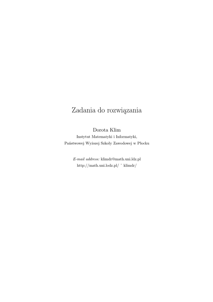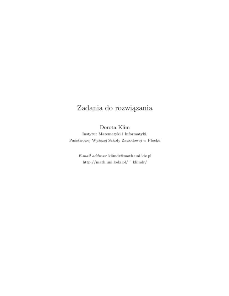 Zadania do rozwiązania Dorota Klim Instytut Matematyki i Informatyki, Państwowej Wyższej Szkoły Zawodowej w Płocku E-mail address: [email protected] http://math.uni.lodz.pl/ ˜ klimdr/ Zadanie 1 Jaką kwotę utworzy po czterech latach kapitał 5400 jp w modelu oprocentowania a) prostego b) składanego rocznego c) składanego miesięcznego przy stopie nominalnej 2, 5%? Zadanie 2 Jaka kwota utworzy po pięciu miesiącach kapitał o wartości 1200 jp przy prostym naliczaniu odsetek, jeśli miesięczna stopa procentowa wynosi 2%? Zadanie 3 Po podwyżce o 3% cena telewizora wynosi 3 tys. zł. Jaka była cena telewizora przed podwyżką? Zadanie 4 Po ilu dniach kapitał 27 jp podwoi swoją wartość w modelu oprocentowania a) prostego b) składanego dziennego przy dziennej stopie procentowej 0, 1%? Zadanie 5 Przy jakiej stopie rocznej r kapitał 120 zł wygeneruje odsetki w wysokości 55 zł w ciągu trzech lat w modelu oprocentowania a) prostego? b) składanego rocznego? Zadanie 6 Wyznaczyć wielkość rocznego współczynnika akumulacji w modelu oprocentowania kwartalnego a) prostego b) składanego przy stopie nominalnej 12%. Zadanie 7 Jeżeli roczny współczynnik akumulacji wynosi 1, 15, to jakiej wielkości odsetki zostaną wygenerowane przez kapitał 1000 jp po dwóch latach w modelu kapitalizacji rocznej. Zadanie 8 Ustalić stan książeczki oszczędnościowej po 14 latach w modelu kapitalizacji prostej przy rocznej stopie procentowej 12%, jeśli dokonano w niej następujących operacji finansowych: na początku wpłacono 13 jp, po siedmiu latach wpłacono 30 jp, po następnym roku wypłacono 15 jp. Zadanie 9 Przy jakiej rocznej stopie procentowej r i rocznej kapitalizacji odsetek kapitał 58 jp wygeneruje odsetki w wysokości 5 jp w ciągu dwóch lat? 1 Zadanie 10 Po 30% podwyższce cen telewizor kosztuje 1200 zł. Ustalić poprzednią cenę telewizora oraz kwotę podwyższki. Zadanie 11 Dysponujemy kapitałem w wysokości 3000 zł. Za dwa lata chcemy uzyskać 6000 zł. Na jaki procent składany miesięczny musimy ulokować kapitał? Zadanie 12 Ile wynosi 1. miesięczny 2. kwartalny czynnik akumulacji, jeżeli po pół roku kapitał 400 jp wygenerował odsetki 100 jp przy dziennej kapitalizacji odsetek? Zadanie 13 Ustalić stan konta po 20 miesiącach, jeżeli dokonano następujących operacji: na początku wpłacono 10 jp, następnie po ośmiu miesiącach wpłacono 8 jp, po kolejnych sześciu miesiącach wypłacono 30 jp. Bank stosuje model oprocentowania miesięcznego składanego przy stopie 0, 5%. Zadanie 14 Jaką wartość osiągnie kapitał 800 jp po 5 latach oprocentowania rocznego składanego przy rocznej stopie 6%? Jaką wartość mają odsetki naliczone za piąty rok? Zadanie 15 Na początku każdego z czterech kolejnych miesięcy wpłacano na konto kwoty odpowiednio: 10 jp, 20 jp, 30 jp, 40 jp. Nominalna stopa procentowa wynosi 10%. Ustalić stan oszczędności na koniec 5 miesiąca, jeżeli bank stosuje model kapitalizacji miesięcznej. Zadanie 16 Według reguły 70 obliczyć przybliżony czas podwojenia wartości kapitału przy półrocznej kapitalizacji i stopie r = 5%. Zadanie 17 Według reguły 70 obliczyć przybliżoną wartość stopy oprocentowania rocznego składanego, przy której kapitał podwoi swoją wartość w czasie 14 lat. Zadanie 18 Ile wynosi 1. kwartalny 2. miesięczny czynnik akumulacji, jeżeli po roku roku kapitał 300 jp wygenerował odsetki 50 jp w modelu kapitalizacji złożonej a) miesięcznej? b) półrocznej? Zadanie 19 Obliczyć wartość 2, 5-letnich odsetek od kwoty 190 jp, jeśli nominalna stopa wynosi 3, 2% i kapitalizacja jest kwartalna. 2 Zadanie 20 Co jest korzystniejsze dla właściciela kapitału zdeponowanego na rok w banku: roczne oprocentowanie składane przy rocznej stopie procentowej 6%, czy roczne oprocentowanie proste przy rocznaj stopie 7%? Zadanie 21 W banku A obowiązuje miesięczna kapitalizacja odsetek przy nominalnej stopie procentowej 8%. W banku B obowiązuje roczne oprocentowanie proste przy stopie r w skali roku. Ile musi wynosić r aby wartości przyszłe kapitału P , otrzymane odpowiednio w banku A i B, po ośmiu latach były identyczne? Zadanie 22 Jaką wartość mają odsetki naliczone za 9 rok, jeśli kapitał 560 jp wygenerował odsetki w wysokości 153 jp po 3 latach kwartalnego oprocentowania składanego? Zadanie 23 Ile wynosi nominalna stopa procentowa, jeżeli przy dziennej kapitalizacji odsetek odsetki za drugi miesiąc od kwoty początkowej 120 jp wyniosły 20 jp? Zadanie 24 Odsetki od półrocznej lokaty o stałym oprocentowaniu prostym są naliczane po terminie. Pani X, która wpłaciła na lokatę 300 zł, odebrała przy jej likwidacji 347,50 zł. Obliczyć roczną stopę oprocentowania lokaty. Zadanie 25 Przy jakiej rocznej stopie oprocentowania prostego wartość 2-letniej lokaty z odsetkami naliczanymi po terminie zwiększy się: a) o 25%, b) 2-krotnie, c) przynajmniej 1,5-krotnie? Zadanie 26 Po ilu miesiącach oprocentowania składanego przy nominalnej stopie 15% kapitał 500 jp wygeneruje odsetki a) 500 jp. b) 300 jp. Zadanie 27 Obliczyć wartość 3, 5-letnich odsetek od kwoty 590 jp, jeśli nominalna stopa wynosi 8%, odsetki kapitalizują się 1. po każdym kwartale. 2. po każdym dniu. Zadanie 28 W banku A stosowana jest kapitalizacja półroczna przy nominalnej stopie 2, 7%, zaś w banku B oprocentowanie proste półroczne przy nominalnej stopie 2, 7%. Zbadać zależność pomiędzy rocznymi czynnikami akumulacji w obu bankach. 3