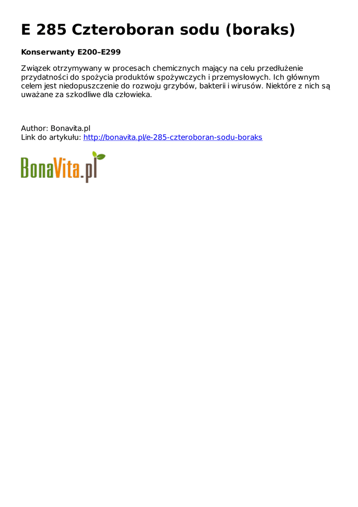 E 285 Czteroboran sodu (boraks) Konserwanty E200–E299 Związek otrzymywany w procesach chemicznych mający na celu przedłużenie przydatności do spożycia produktów spożywczych i przemysłowych. Ich głównym celem jest niedopuszczenie do rozwoju grzybów, bakterii i wirusów. Niektóre z nich są uważane za szkodliwe dla człowieka. Author: Bonavita.pl Link do artykułu: http://bonavita.pl/e-285-czteroboran-sodu-boraks