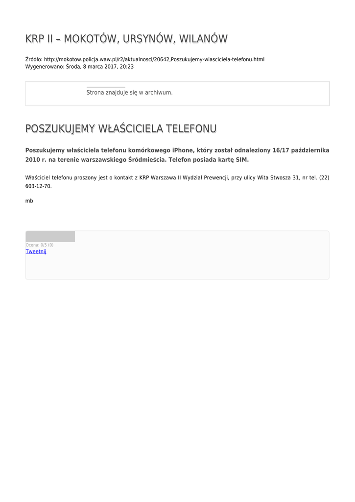 KRP II – MOKOTÓW, URSYNÓW, WILANÓW Źródło: http://mokotow.policja.waw.pl/r2/aktualnosci/20642,Poszukujemy-wlasciciela-telefonu.html Wygenerowano: Środa, 8 marca 2017, 20:23 Strona znajduje się w archiwum. POSZUKUJEMY WŁAŚCICIELA TELEFONU Poszukujemy właściciela telefonu komórkowego iPhone, który został odnaleziony 16/17 października 2010 r. na terenie warszawskiego Śródmieścia. Telefon posiada kartę SIM. Właściciel telefonu proszony jest o kontakt z KRP Warszawa II Wydział Prewencji, przy ulicy Wita Stwosza 31, nr tel. (22) 603-12-70. mb Ocena: 0/5 (0) Tweetnij