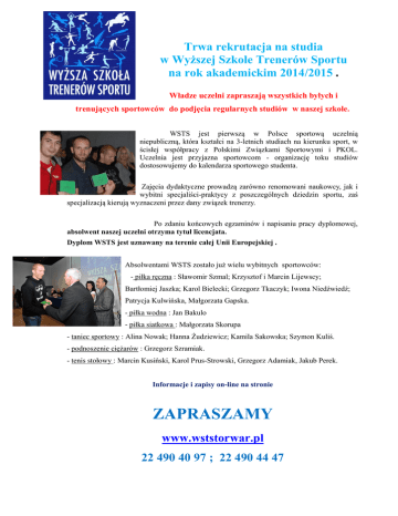 Trwa rekrutacja na studia w Wyższej Szkole Trenerów Sportu na rok akademickim 2014/2015 . Władze uczelni zapraszają wszystkich byłych i trenujących sportowców do podjęcia regularnych studiów w naszej szkole. WSTS jest pierwszą w Polsce sportową uczelnią niepubliczną, która kształci na 3-letnich studiach na kierunku sport, w ścisłej współpracy z Polskimi Związkami Sportowymi i PKOL. Uczelnia jest przyjazna sportowcom - organizację toku studiów dostosowujemy do kalendarza sportowego studenta. Zajęcia dydaktyczne prowadzą zarówno renomowani naukowcy, jak i wybitni specjaliści-praktycy z poszczególnych dziedzin sportu, zaś specjalizacją kierują wyznaczeni przez dany związek trenerzy. Po zdaniu końcowych egzaminów i napisaniu pracy dyplomowej, absolwent naszej uczelni otrzyma tytuł licencjata. Dyplom WSTS jest uznawany na terenie całej Unii Europejskiej . Absolwentami WSTS zostało już wielu wybitnych sportowców: - piłka ręczna : Sławomir Szmal; Krzysztof i Marcin Lijewscy; Bartłomiej Jaszka; Karol Bielecki; Grzegorz Tkaczyk; Iwona Niedźwiedź; Patrycja Kulwińska, Małgorzata Gapska. - piłka wodna : Jan Bakulo - piłka siatkowa : Małgorzata Skorupa - taniec sportowy : Alina Nowak; Hanna Żudziewicz; Kamila Sakowska; Szymon Kuliś. - podnoszenie ciężarów : Grzegorz Szramiak. - tenis stołowy : Marcin Kusiński, Karol Prus-Strowski, Grzegorz Adamiak, Jakub Perek. Informacje i zapisy on-line na stronie ZAPRASZAMY www.wststorwar.pl 22 490 40 97 ; 22 490 44 47