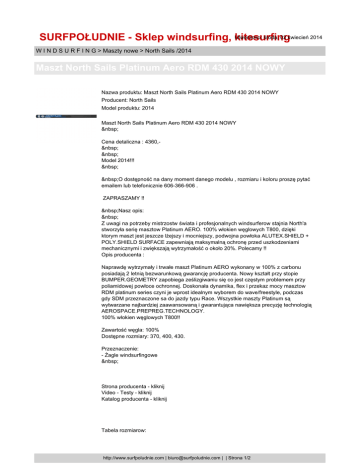 środa, 02 kwiecień 2014 SURFPOŁUDNIE - Sklep windsurfing, Utworzono: kitesurfing W I N D S U R F I N G > Maszty nowe > North Sails /2014 Maszt North Sails Platinum Aero RDM 430 2014 NOWY Nazwa produktu: Maszt North Sails Platinum Aero RDM 430 2014 NOWY Producent: North Sails Model produktu: 2014 Maszt North Sails Platinum Aero RDM 430 2014 NOWY Cena detaliczna : 4360, Model 2014!!! O dostępność na dany moment danego modelu , rozmiaru i koloru proszę pytać emailem lub telefonicznie 606-366-906 . ZAPRASZAMY !! Nasz opis: Z uwagi na potrzeby mistrzostw świata i profesjonalnych windsurferow stajnia North'a stworzyła serię masztow Platinum AERO. 100% włokien węglowych T800, dzięki ktorym maszt jest jeszcze lżejszy i mocniejszy, podwojna powłoka ALUTEX.SHIELD + POLY.SHIELD SURFACE zapewniają maksymalną ochronę przed uszkodzeniami mechanicznymi i zwiększają wytrzymałość o około 20%. Polecamy !! Opis producenta : Naprawdę wytrzymały i trwałe maszt Platinum AERO wykonany w 100% z carbonu posiadają 2 letnią bezwarunkową gwarancję producenta. Nowy kształt przy stopie BUMPER.GEOMETRY zapobiega ześlizgiwaniu się co jest częstym problemem przy poliamidowej powłoce ochronnej. Doskonała dynamika, flex i przekaz mocy masztow RDM platinum series czyni je wprost idealnym wyborem do wave/freestyle, podczas gdy SDM przeznaczone sa do jazdy typu Race. Wszystkie maszty Platinum są wytwarzane najbardziej zaawansowaną i gwarantująca nawiększa precyzję technologią AEROSPACE.PREPREG.TECHNOLOGY. 100% włokien węglowych T800!! Zawartość węgla: 100% Dostępne rozmiary: 370, 400, 430. Przeznaczenie: - Żagle windsurfingowe Strona producenta - kliknij Video - Testy - kliknij Katalog producenta - kliknij Tabela rozmiarow: http://www.surfpoludnie.com | [email protected] | | Strona 1/2 środa, 02 kwiecień 2014 SURFPOŁUDNIE - Sklep windsurfing, Utworzono: kitesurfing W I N D S U R F I N G > Maszty nowe > North Sails /2014 Maszt North Sails Platinum Aero RDM 430 2014 NOWY Długość: IMCS: Zakres żagli: Waga(kg) Carbon: 370 17 3,0 - 4,5m2 1,3kg 100% 400 19 3,7 - 5,7m2 1,4kg 100% 430 21 5,0 - 6,9m2 1,5kg 100% Informacja handlowa :Handlujemy towarem jaki mamy na magazynie i jest dostępny od ręki. Ale ogłaszamy się na rożnych portalach w kraju i za granicą oraz sprzedajemy w sklepie w Miechowie . Czasem może się zdażyć, że coś się sprzeda w innym miejscu i nie zdążymy usunąć oferty.Z gory przepraszamy . Zawarte w opisach informacje i opisy pochodzą z materiałow opublikowanych przez producenta i ustalonuch przez nas. Dołożyliśmy wszelkich starań, aby informacje te były aktualne i prawdziwe . Zastrzegamy sobie jednak prawo do pomyłek i ewentualnych błędow, oraz odstąpienia od umowy z ważnych powodow ekonomicznych. Cena: 4360.00zł Dostępność: Ten produkt został dodany do sklepu w dniu wtorek, 01 kwiecień 2014 http://www.surfpoludnie.com | [email protected] | | Strona 2/2