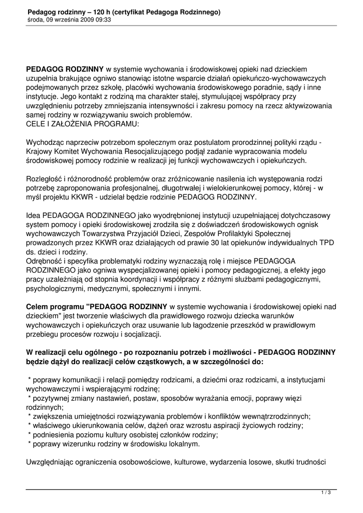 Pedagog rodzinny – 120 h (certyfikat Pedagoga Rodzinnego) środa, 09 września 2009 09:33 PEDAGOG RODZINNY w systemie wychowania i środowiskowej opieki nad dzieckiem uzupełnia brakujące ogniwo stanowiąc istotne wsparcie działań opiekuńczo-wychowawczych podejmowanych przez szkołę, placówki wychowania środowiskowego poradnie, sądy i inne instytucje. Jego kontakt z rodziną ma charakter stałej, stymulującej współpracy przy uwzględnieniu potrzeby zmniejszania intensywności i zakresu pomocy na rzecz aktywizowania samej rodziny w rozwiązywaniu swoich problemów. CELE I ZAŁOŻENIA PROGRAMU: Wychodząc naprzeciw potrzebom społecznym oraz postulatom prorodzinnej polityki rządu Krajowy Komitet Wychowania Resocjalizującego podjął zadanie wypracowania modelu środowiskowej pomocy rodzinie w realizacji jej funkcji wychowawczych i opiekuńczych. Rozległość i różnorodność problemów oraz zróżnicowanie nasilenia ich występowania rodzi potrzebę zaproponowania profesjonalnej, długotrwałej i wielokierunkowej pomocy, której - w myśl projektu KKWR - udzielał będzie rodzinie PEDAGOG RODZINNY. Idea PEDAGOGA RODZINNEGO jako wyodrębnionej instytucji uzupełniającej dotychczasowy system pomocy i opieki środowiskowej zrodziła się z doświadczeń środowiskowych ognisk wychowawczych Towarzystwa Przyjaciół Dzieci, Zespołów Profilaktyki Społecznej prowadzonych przez KKWR oraz działających od prawie 30 lat opiekunów indywidualnych TPD ds. dzieci i rodziny. Odrębność i specyfika problematyki rodziny wyznaczają rolę i miejsce PEDAGOGA RODZINNEGO jako ogniwa wyspecjalizowanej opieki i pomocy pedagogicznej, a efekty jego pracy uzależniają od stopnia koordynacji i współpracy z różnymi służbami pedagogicznymi, psychologicznymi, medycznymi, społecznymi i innymi. Celem programu "PEDAGOG RODZINNY w systemie wychowania i środowiskowej opieki nad dzieckiem" jest tworzenie właściwych dla prawidłowego rozwoju dziecka warunków wychowawczych i opiekuńczych oraz usuwanie lub łagodzenie przeszkód w prawidłowym przebiegu procesów rozwoju i socjalizacji. W realizacji celu ogólnego - po rozpoznaniu potrzeb i możliwości - PEDAGOG RODZINNY będzie dążył do realizacji celów cząstkowych, a w szczególności do: * poprawy komunikacji i relacji pomiędzy rodzicami, a dziećmi oraz rodzicami, a instytucjami wychowawczymi i wspierającymi rodzinę; * pozytywnej zmiany nastawień, postaw, sposobów wyrażania emocji, poprawy więzi rodzinnych; * zwiększenia umiejętności rozwiązywania problemów i konfliktów wewnątrzrodzinnych; * właściwego ukierunkowania celów, dążeń oraz wzrostu aspiracji życiowych rodziny; * podniesienia poziomu kultury osobistej członków rodziny; * poprawy wizerunku rodziny w środowisku lokalnym. Uwzględniając ograniczenia osobowościowe, kulturowe, wydarzenia losowe, skutki trudności 1/3 Pedagog rodzinny – 120 h (certyfikat Pedagoga Rodzinnego) środa, 09 września 2009 09:33 obiektywnych (jak: niski status materialny rodziny, trudności mieszkaniowe, zły stan zdrowia członków rodziny), a także inne stałe wyznaczniki niepowodzeń, oraz niedoskonałość dotychczasowych rozwiązań prawnych w sprawach rodzinnych w wyniku działań kierowanych do rodziny PEDAGOG RODZINNY powinien w szczególności: * pomóc dziecku w tworzeniu sobie bezpiecznego środowiska; * zwiększyć umiejętność radzenia sobie w trudnych sytuacjach w domu i poza nim; * podnosić poczucie własnej wartości dziecka; * nauczyć dziecko spędzania wolnego czasu w sensowny sposób z wykorzystaniem jego predyspozycji, uzdolnień i zainteresowań; * zwiększyć umiejętność wyrażania własnych potrzeb i problemów oraz wzbudzić gotowość zwracania się o pomoc i umiejętność korzystania z niej. Zakłada się, że wielokierunkowe i systemowe wsparcie merytoryczne dziecka i rodziny w ich własnym środowisku w znacznym stopniu ograniczy napływ wychowanków do placówek opiekuńczo-wychowawczych oraz zmniejszy liczbę interwencji sądów rodzinnych, a w przypadku dzieci umieszczonych w placówkach - przyczyni się do skrócenia czasu ich pobytu i przygotowania rodziny do powrotu dziecka. ZADANIA PEDAGOGA RODZINNEGO 1. Dokonywanie diagnozy sytuacji rodzinnej, ustalanie rodzaju i stopnia nasilenia zaburzeń w funkcjonowaniu rodziny, opracowywanie planów doraźnych i długofalowych działań na rzecz rodziny oraz prognoz spodziewanych efektów pomocy. 2. Ustalanie potrzeb i zakresu pomocy ze strony innych służb, instytucji i organizacji wspierających rodzinę (szkół, poradni, placówek opiekuńczo-wychowawczych, sądów rodzinnych, samorządów mieszkańców, pomocy społecznej, instytucji kultury, organizacji trzeźwościowych, policji i innych). 3. Prowadzenie mediacji z rodzicami, wyjaśnianie im przyczyn trudności i niepowodzeń, uzgadnianie wspólnie podejmowa- nych działań zaradczych. 4. Prowadzenie lub organizowanie udziału rodziny w terapii (psychoterapii rodzinnej), motywowanie rodziców do podjęcia leczenia odwykowego, działanie na rzecz integracji rodziny i wzmacniania więzi rodzinnej, modyfikowanie postaw rodzicielskich itp. 5. Doraźna interwencja i pomoc w rozwiązywaniu konfliktów i problemów wychowawczych. 6. Pośredniczenie w kontaktach rodziców ze szkołami, instytucjami i służbami społecznymi, a w koniecznych wypadkach reprezentowanie ich interesów przed tymi instytucjami, w szczególności pośredniczenie w uzyskaniu pomocy materialnej, prawnej w sprawach rodzinnych (rozwód, alimenty, władza rodzicielska, kontakty z osobami odbywającymi karę pozbawienia wolności, sprawy spadkowe itp.). 7. Prowadzenie konsultacji i poradnictwa otwartego dla rodzin, udzielanie porad telefonicznych i bezpośrednich, opracowywanie odpowiedzi na typowe pytania i upowszechnianie ich. 8. Popularyzacja wiedzy pedagogicznej wśród rodziców i wskazywanie źródeł informacji nt. rozwiązywania problemów rodzinnych i wychowa