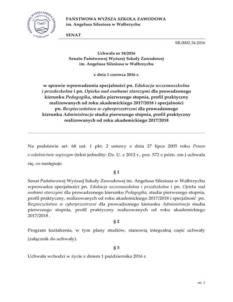 [Wpisz cytat z PAŃSTWOWA WYŻSZA SZKOŁA ZAWODOWA im. Angelusa Silesiusa w Wałbrzychu SENAT Uchwała nr 34/2016 Senatu Państwowej Wyższej Szkoły Zawodowej im. Angelusa Silesiusa w Wałbrzychu SR.0002.34.2016 z dnia 1 czerwca 2016 r. w sprawie wprowadzenia specjalności pn. Edukacja wczesnoszkolna i przedszkolna i pn. Opieka nad osobami starszymi dla prowadzonego kierunku Pedagogika, studia pierwszego stopnia, profil praktyczny realizowanych od roku akademickiego 2017/2018 i specjalności pn. Bezpieczeństwo w cyberprzestrzeni dla prowadzonego kierunku Administracja studia pierwszego stopnia, profil praktyczny realizowanych od roku akademickiego 2017/2018 Na podstawie art. 68 ust. 1 pkt. 2 ustawy z dnia 27 lipca 2005 roku Prawo o szkolnictwie wyższym (tekst jednolity: Dz. U. z 2012 r., poz. 572 z późn. zm.) uchwala się, co następuje: §1 Senat Państwowej Wyższej Szkoły Zawodowej im. Angelusa Silesiusa w Wałbrzychu wprowadza specjalności pn. Edukacja wczesnoszkolna i przedszkolna i pn. Opieka nad osobami starszymi dla prowadzonego kierunku Pedagogika, studia pierwszego stopnia, profil praktyczny, realizowanych od roku akademickiego 2017/2018 i specjalność pn. Bezpieczeństwo w cyberprzestrzeni dla prowadzonego kierunku Administracja studia pierwszego stopnia, profil praktyczny realizowanych od roku akademickiego 2017/2018 . §2 Program kształcenia, w tym plany studiów, stanowią integralną część uchwały (załącznik do uchwały). §3 Uchwała wchodzi w życie z dniem 1 października 2016 r. str. 1
