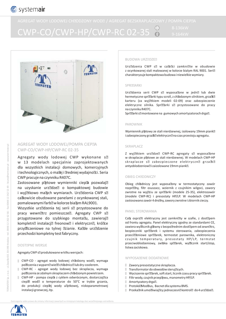 AGREGAT WODY LODOWEJ CHŁODZONY WODĄ / AGREGAT BEZSKRAPLACZOWY / POMPA CIEPŁA 8-136kW 9-164kW CWP-CO/CWP-HP/CWP-RC 02-35 BUDOWA URZĄDZEŃ Urządzenia CWP są w całości zamknięte w obudowie z ocynkowanej stali malowanej w kolorze bialym RAL 9001. Serię charakteryzuje kompaktowa budowa i niewielkie wymiary. SPRĘŻARKI Urządzenia serii CWP są wyposażone w jedną lub dwie hermetyczne sprężarki typu scroll, z chłodzonym silnikiem, grzałką karteru (za wyjątkiem modeli 02-09) oraz zabezpieczenie elektryczne silnika. Sprężarki są przystosowane do pracy na czynniku R407C. Sprężarki są montowane na gumowych amortyzatorach drgań. PAROWNIK TERMSTER Sp. z o.o. - ul.Zawiła 65f, 30-390 Kraków - tel. 0048 12 262 62 66 - fax 0048 12 262 52 49 - [email protected] - www.termster.pl Wymiennik płytowy ze stali nierdzewnej, izolowany 19mm pianką i zabezpieczony grzałką elektryczną na czas przestoju agregatu. AGREGAT WODY LODOWEJ/POMPA CIEPŁA CWP-CO/CWP-HP/CWP-RC 02-35 Agregaty wody lodowej CWP wykonane są w 13 modelach specjalnie zaprojektowanych dla wszystkich instalacji domowych, komercyjnych i technologicznych, o małej i średniej wydajności. Seria CWP pracuje na czynniku R407C. Zastosowane płytowe wymienniki ciepła pozwalają na uzyskanie urządzeń o kompaktowej budowie i wyjątkowo małych wymiarach. Urządzenia CWP są całkowicie obudowane panelami z ocynkowanej stali, pomalowanymi farbą w kolorze białym RAL9001. Wszystkie urządzenia tej serii są przystosowane do pracy wewnątrz pomieszczeń. Agregaty CWP są przygotowane do szybkiego montażu, zawierają kompletną instalację freonową i elektryczną, króćce przyłączeniowe na tylnej ścianie. Każde urządzenie przechodzi kompletny test fabryczny. DOSTĘPNE WERSJE SKRAPLACZ Z wyjątkiem urządzeń CWP-RC agregaty są wyposażone w skraplacze płytowe ze stali nierdzewnej. W modelach CWP-HP skraplacze są zabezpieczone elektryczną grzałką antyoblodzeniową i zaizolowane 19mm pianką. OBIEG CHŁODNICZY Obieg chłodniczy jest wyposażony w termostatyczny zawór rozprężny, filtr osuszacz, wziernik z czujnikim wilgoci, zawory zwrotne na wyjściu ze sprężarki (modele 25-35), elektrozawór (modele CWP-RC) i presostaty HP/LP. W modelach CWP-HP zastosowano zawór 4 drożny, zawory zwrotne i zbiornik cieczy. PANEL STEROWANIA Cały osprzęt elektryczny jest zamknięty w szafie, z dostępem od frontu agregatu. Panel elektryczny zgodny ze standardami CE, zawiera wyłącznik główny z bezpośrednim dostępem od zewnątrz, bezpieczniki sprężarek i systemu sterowania, zabezpieczenia przeciążeniowe sprężarek, termostat parownika, elektroniczny c z u j n i k t e m p e r a t u r y, p r e s o s t a t y H P/ L P, t e r m s t a t przeciwoblodzeniowy, zwłoka spężarek, wyłącznik start/stop, listwa zaciskowa. Agregaty CWP są produkowane w kilku wersjach: CWP-CO - agregat wody lodowej chłodzony wodą, wymaga połączenia z wyparną wieżą chłodniczą lub dry-coolerem. CWP-RC - agregat wody lodowej bez skraplacza, wymaga połączenia ze zdalnym skraplaczem chłodzonym powietrzem. CWP-HP - pompa ciepła z cyklem odwróconym, dostarczająca ciepłą wodę o temperaturze do 50°C w trybie grzania, do produkcji ciepłej wody użytkowej, niskoparametrowej instalacji grzewczej, itp. Zastrzegamy sobie prawo do zmiany informacji zawartych w niniejszym katalogu bez wcześniejszego ostrzeżenia. WYPOSAŻENIE DODATKOWE Zawory presostatyczne skraplacza. Transformator do obwodów sterujących. Wyciszenie sprężarek, soft start, licznik czasu pracy sprężarek. Filtr wody, czujnik przepływu, manometry HP/LP. Amortyzatory drgań. Protokół ModBus, Bacnet dla systemu BMS. Przekaźnik umożliwiający jednoczesną kontrolę do 4 urządzeń.