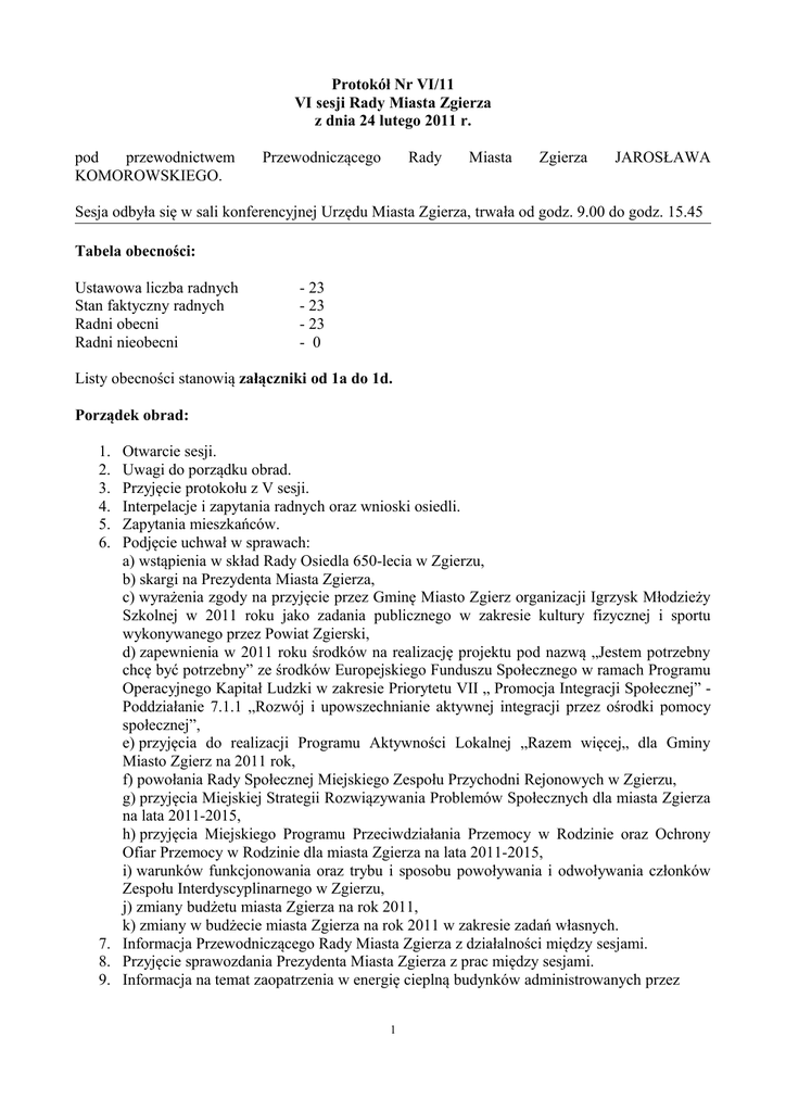 Protokół Nr VI/11 VI sesji Rady Miasta Zgierza z dnia 24 lutego 2011 r. pod przewodnictwem KOMOROWSKIEGO. Przewodniczącego Rady Miasta Zgierza JAROSŁAWA Sesja odbyła się w sali konferencyjnej Urzędu Miasta Zgierza, trwała od godz. 9.00 do godz. 15.45 Tabela obecności: Ustawowa liczba radnych Stan faktyczny radnych Radni obecni Radni nieobecni - 23 - 23 - 23 - 0 Listy obecności stanowią załączniki od 1a do 1d. Porządek obrad: 1. 2. 3. 4. 5. 6. Otwarcie sesji. Uwagi do porządku obrad. Przyjęcie protokołu z V sesji. Interpelacje i zapytania radnych oraz wnioski osiedli. Zapytania mieszkańców. Podjęcie uchwał w sprawach: a) wstąpienia w skład Rady Osiedla 650-lecia w Zgierzu, b) skargi na Prezydenta Miasta Zgierza, c) wyrażenia zgody na przyjęcie przez Gminę Miasto Zgierz organizacji Igrzysk Młodzieży Szkolnej w 2011 roku jako zadania publicznego w zakresie kultury fizycznej i sportu wykonywanego przez Powiat Zgierski, d) zapewnienia w 2011 roku środków na realizację projektu pod nazwą „Jestem potrzebny chcę być potrzebny” ze środków Europejskiego Funduszu Społecznego w ramach Programu Operacyjnego Kapitał Ludzki w zakresie Priorytetu VII „ Promocja Integracji Społecznej” Poddziałanie 7.1.1 „Rozwój i upowszechnianie aktywnej integracji przez ośrodki pomocy społecznej”, e) przyjęcia do realizacji Programu Aktywności Lokalnej „Razem więcej„ dla Gminy Miasto Zgierz na 2011 rok, f) powołania Rady Społecznej Miejskiego Zespołu Przychodni Rejonowych w Zgierzu, g) przyjęcia Miejskiej Strategii Rozwiązywania Problemów Społecznych dla miasta Zgierza na lata 2011-2015, h) przyjęcia Miejskiego Programu Przeciwdziałania Przemocy w Rodzinie oraz Ochrony Ofiar Przemocy w Rodzinie dla miasta Zgierza na lata 2011-2015, i) warunków funkcjonowania oraz trybu i sposobu powoływania i odwoływania członków Zespołu Interdyscyplinarnego w Zgierzu, j) zmiany budżetu miasta Zgierza na rok 2011, k) zmiany w budżecie miasta Zgierza na rok 2011 w zakresie zadań własnych. 7. Informacja Przewodniczącego Rady Miasta Zgierza z działalności między sesjami. 8. Przyjęcie sprawozdania Prezydenta Miasta Zgierza z prac między sesjami. 9. Informacja na temat zaopatrzenia w energię cieplną budynków administrowanych przez 1 MPGM Sp. z o.o. w Zgierzu (ze szczególnym uwzględnieniem bloków przy ul. Narutowicza 2a i 2b) 10. Udzielenie odpowiedzi na interpelacje i zapytania radnych oraz wnioski osiedli. 11. Zapytania i wolne wnioski. 12. Zamknięcie obrad sesji. Pkt 1. Przewodniczący Rady Miasta Zgierza J. KOMOROWSKI otworzył VI sesję Rady Miasta Zgierza. Na podstawie listy obecności stwierdził quorum, a tym samym prawomocność obrad. Na wstępie przywitał radnych, Zastępców Prezydenta B. Kapustę oraz G. Leśniewicza, naczelników i innych pracowników Urzędu, przedstawicieli jednostek pomocniczych, media, mieszkańców i wszystkich przybyłych na sesję. Pkt 2. Głos zabrała Skarbnik Miasta Zgierza D. KUBIAK. W imieniu Prezydenta Miasta Zgierza zgłosiła zmiany tytułów projektów uchwał w sprawach: pkt 6. ppkt j) w sprawie zmiany uchwały Nr V/21/11 Rady Miasta Zgierza z dnia 27 stycznia 2011 r. w sprawie uchwalenia Wieloletniej Prognozy Finansowej na lata 2011-2038, Głosowano: za - 22, przeciw - 0, wstrzym. - 0. pkt 6. ppkt k) w sprawie zmiany uchwały Nr V/22/11 Rady Miasta Zgierza z dnia 27 stycznia 2011 r. w sprawie uchwalenia budżetu miasta Zgierza na rok 2011, Głosowano: za - 22, przeciw - 1, wstrzym. - 0. Zaproponowała również wprowadzenie projektów uchwał w sprawach: pkt 6. ppkt l) zmiany budżetu i zmian w budżecie miasta Zgierza na rok 2011 w zakresie zadań własnych, Głosowano: za - 22, przeciw - 0, wstrzym. - 0. pkt 6. ppkt ł) zmian w Wieloletniej Prognozie Finansowej na lata 2011-2038, Głosowano: za - 22, przeciw - 0, wstrzym. - 1. Zastępca Prezydenta B. KAPUSTA w imieniu Prezydenta Miasta Zgierza zgłosiła do porządku obrad projekt uchwały w sprawie: Pkt 6. ppkt m) przystąpienia do sporządzenia miejscowego planu zagospodarowania przestrzennego miasta Zgierza dla terenu ograniczonego: ulicą Sosnową, ulicą Łódzką, granicą miasta oraz terenem PKP, Radny T. KUPIS zauważył, że ten temat powinien być przedstawiony radnym dużo wcześniej. Zapytał, dlaczego projekt uchwały jest wprowadzany w ostatniej chwili? 2 Zastępca Prezydenta B. KAPUSTA wyjaśniła, że nie ma pośpiechu, określonego terminu podjęcia uchwały. Przedstawiony projekt dot. jednak uchwały kierunkowej w celu rozpoczęcia procedury sporządzenia planu na prośbę inwestora. Radny T. KUPIS mimo wszystko poprosił o zdjęcie projektu uchwały z porządku obrad sesji i przedstawienie go na merytorycznych komisjach w następnym miesiącu. Zastępca Prezydenta B. KAPUSTA powiedziała, że w Jej ocenie, „odwlekanie” tej sprawy jest nieuzasadnione, ponieważ projekt dot. tylko przystąpienia do sporządzenia planu. Radny M. HILIŃSKI zapytał, skąd pochodzić będą środki na przygotowanie planu i jaka to będzie kwota? Zastępca Prezydenta B. KAPUSTA wyjaśniła, że sporządzenie planu dla tej inwestycji, to szacunkowo ok. 15 000 zł, a w perspektywie dochodów z tytułu podatku od nieruchomości (w setkach tysięcy), wygospodarowanie tej kwoty jest uzasadnione. Prawdopodobnie środki na ten cel zostaną przesunięte z działu promocji. W głosowaniu: za - 16, przeciw - 0, wstrzym. - 7, projekt uchwały wprowadzono do porządku obrad. Przewodniczący RMZ J. KOMOROWSKI zaproponował wprowadzenie do porządku obrad projektu uchwały w sprawie: pkt 6. ppkt n) wskazania terminu rozpatrzenia skargi na Prezydenta Miasta Zgierza, Głosowano: za - 23, przeciw - 0, wstrzym. - 0. Przewodniczący RMZ J. KOMOROWSKI poddał pod głosowanie zmieniony porządek obrad. 1. 2. 3. 4. 5. 6. Otwarcie sesji. Uwagi do porządku obrad. Przyjęcie protokołu z V sesji. Interpelacje i zapytania radnych oraz wnioski osiedli. Zapytania mieszkańcó