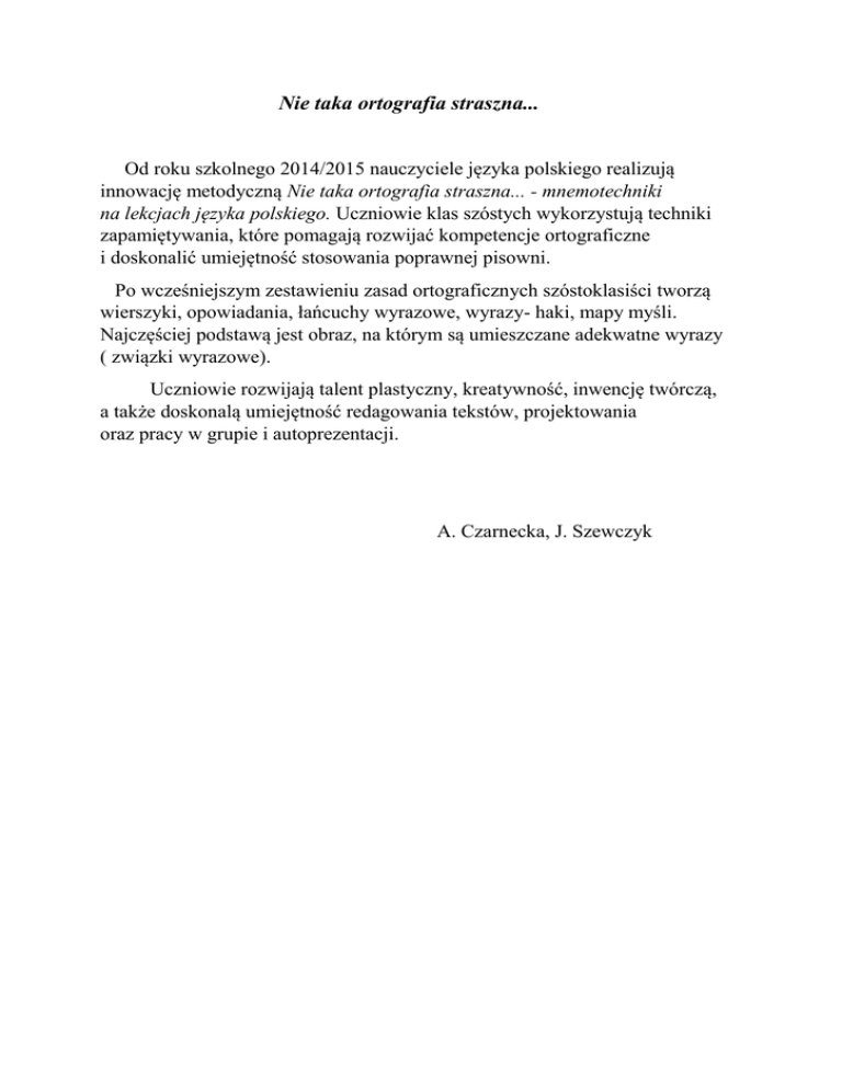 Nie taka ortografia straszna... Od roku szkolnego 2014/2015 nauczyciele języka polskiego realizują innowację metodyczną Nie taka ortografia straszna... - mnemotechniki na lekcjach języka polskiego. Uczniowie klas szóstych wykorzystują techniki zapamiętywania, które pomagają rozwijać kompetencje ortograficzne i doskonalić umiejętność stosowania poprawnej pisowni. Po wcześniejszym zestawieniu zasad ortograficznych szóstoklasiści tworzą wierszyki, opowiadania, łańcuchy wyrazowe, wyrazy- haki, mapy myśli. Najczęściej podstawą jest obraz, na którym są umieszczane adekwatne wyrazy ( związki wyrazowe). Uczniowie rozwijają talent plastyczny, kreatywność, inwencję twórczą, a także doskonalą umiejętność redagowania tekstów, projektowania oraz pracy w grupie i autoprezentacji. A. Czarnecka, J. Szewczyk