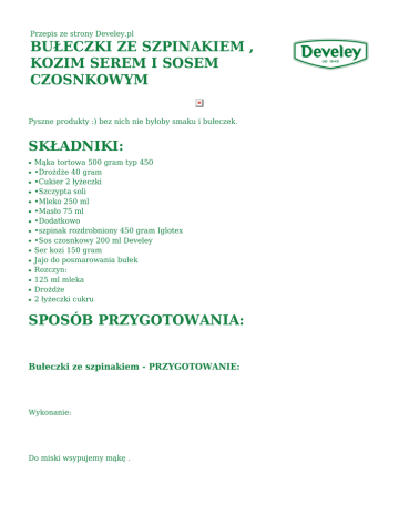 Przepis ze strony Develey.pl BUŁECZKI ZE SZPINAKIEM , KOZIM SEREM I SOSEM CZOSNKOWYM Pyszne produkty :) bez nich nie byłoby smaku i bułeczek. SKŁADNIKI: ● ● ● ● ● ● ● ● ● ● ● ● ● ● ● Mąka tortowa 500 gram typ 450 •Drożdże 40 gram •Cukier 2 łyżeczki •Szczypta soli •Mleko 250 ml •Masło 75 ml •Dodatkowo •szpinak rozdrobniony 450 gram Iglotex •Sos czosnkowy 200 ml Develey Ser kozi 150 gram Jajo do posmarowania bułek Rozczyn: 125 ml mleka Drożdże 2 łyżeczki cukru SPOSÓB PRZYGOTOWANIA: Bułeczki ze szpinakiem - PRZYGOTOWANIE: Wykonanie: Do miski wsypujemy mąkę . Robimy dołek. Rozpuszczamy masło i dodajemy 125 ml mleka . Rozczyn: 125 ml mleka Drożdże 2 łyżeczki cukru Mieszamy do rozpuszczenia drożdży , dodajemy 3 łyżki mąki i zostawiamy na 15 minut przykryte ściereczką . Po 15 minutach dodajemy rozczyn do pozostałych składników. Wyrabiamy ciasto i zostawiamy pod ściereczką na godzinę. Po godzinie wałkujemy ciasto na prostokąt. Na ciasto kładziemy farsz szpinak-owy . Zawijamy wychodzi długi wałek. Kroimy na 12 części . Smarujemy rozbełtanym jajem . Pieczemy 30 minut w 170 stopniach. Farsz wykonanie: Szpinak mrożony wkładamy na patelnie i dusimy do rozpuszczenia. Dodajemy 200 ml sosu czosnkowego Kozi ser kroimy drobno , mieszamy ,aż wyparuje i zostanie tylko gęste.