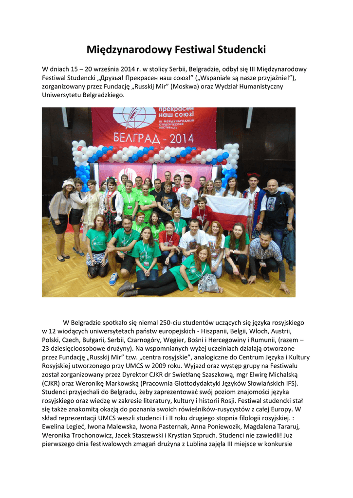 Międzynarodowy Festiwal Studencki W dniach 15 – 20 września 2014 r. w stolicy Serbii, Belgradzie, odbył się III Międzynarodowy Festiwal Studencki „Друзья! Прекрасен наш союз!” („Wspaniałe są nasze przyjaźnie!”), zorganizowany przez Fundację „Russkij Mir” (Moskwa) oraz Wydział Humanistyczny Uniwersytetu Belgradzkiego. W Belgradzie spotkało się niemal 250-ciu studentów uczących się języka rosyjskiego w 12 wiodących uniwersytetach państw europejskich - Hiszpanii, Belgii, Włoch, Austrii, Polski, Czech, Bułgarii, Serbii, Czarnogóry, Węgier, Bośni i Hercegowiny i Rumunii, (razem – 23 dziesięcioosobowe drużyny). Na wspomnianych wyżej uczelniach działają otworzone przez Fundację „Russkij Mir” tzw. „centra rosyjskie”, analogiczne do Centrum Języka i Kultury Rosyjskiej utworzonego przy UMCS w 2009 roku. Wyjazd oraz występ grupy na Festiwalu został zorganizowany przez Dyrektor CJKR dr Swietłanę Szaszkową, mgr Elwirę Michalską (CJKR) oraz Weronikę Markowską (Pracownia Glottodydaktyki Języków Słowiańskich IFS). Studenci przyjechali do Belgradu, żeby zaprezentować swój poziom znajomości języka rosyjskiego oraz wiedzę w zakresie literatury, kultury i historii Rosji. Festiwal studencki stał się także znakomitą okazją do poznania swoich rówieśników-rusycystów z całej Europy. W skład reprezentacji UMCS weszli studenci I i II roku drugiego stopnia filologii rosyjskiej. : Ewelina Legieć, Iwona Malewska, Iwona Pasternak, Anna Poniewozik, Magdalena Tararuj, Weronika Trochonowicz, Jacek Staszewski i Krystian Szpruch. Studenci nie zawiedli! Już pierwszego dnia festiwalowych zmagań drużyna z Lublina zajęła III miejsce w konkursie „Praca domowa” na najlepszą prezentację (oczywiście, w języku rosyjskim!) swojego państwa, kultury, miasta oraz Alma Mater (…). Zaproszeni do Belgradu goście mieli okazję wykazać się również umiejętnościami artystycznymi. Uczestnicy wieczorku poetyckiego poświęconego twórczości Michaiła Lermontowa (w 2014 roku obchodzona jest 200. rocznica urodzin tego rosyjskiego poety), tym razem nie byli wyłącznie biernymi słuchaczami – w formie poetyckiej przedstawiali najważniejsze fakty o życiu i twórczości literata. Należy tutaj wspomnieć o kolejnym laurze zwycięstwa lubelskich studentów – III miejscu w konkursie teatralnym na najlepsze przedstawienie fragmentów dramatów rosyjskich autorów (…) Tydzień spędzony w Belgradzie był również czasem wyjątkowych spotkań z serbską kulturą, architekturą i historią. Niezapomnianym przeżyciem stała się wizyta w cerkwi św. Sawy – będącej jedną z największych świątyni prawosławnych na świecie, oraz w twierdzy Kalemegdan – jednej z najważniejszych atrakcji turystycznych stolicy (początki tej fortyfikacji sięgają jeszcze czasów celtyckich). Na uwagę zasługują również wizyty w belgradzkich muzeach, przede wszystkim zaś w Muzeum Etnograficznym. Właśnie w jego zbiorach znajduje się ponad 150 tysięcy eksponatów prezentujących wiejską i miejską kulturę na Bałkanach. Natomiast w oddalonym o 80 km od Belgradu mieście Topola odwiedziliśmy muzeum Karadjordje Petrović’a (Jerzy Czarny), wodza pierwszego serbskiego powstania przeciwko Turkom (1804 r.), i założyciela dynastii Karadjordjeviciów. Na wzgórzu nad miastem Topola – Oplenac – znajduje się cerkiew św. Jerzego, będąca mauzoleum wspomnianej wyżej serbskiej rodziny królewskiej. Opracowanie: W. Markowska, E. Michalska Fot. E. Michalska, E. Markowska