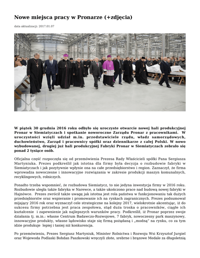 Nowe miejsca pracy w Pronarze (+zdjęcia) data aktualizacji: 2017.01.07 W piątek 30 grudnia 2016 roku odbyło się uroczyste otwarcie nowej hali produkcyjnej Pronar w Siemiatyczach i spotkanie noworoczne Zarządu Pronar z pracownikami. W uroczystości wzięli udział m.in. przedstawiciele rządu, władz samorządowych, duchowieństwo, Zarząd i pracownicy spółki oraz dziennikarze z całej Polski. W nowo wybudowanej, drugiej już hali produkcyjnej Fabryki Pronar w Siemiatyczach zebrało się ponad 2 tysiące osób. Oficjalna część rozpoczęła się od przemówienia Prezesa Rady Właścicieli spółki Pana Sergiusza Martyniuka. Prezes podkreślił jak istotna dla firmy była decyzja o rozbudowie fabryki w Siemiatyczach i jak pozytywnie wpłynie ona na całe przedsiębiorstwo i region. Zaznaczył, że firma wprowadza nowoczesne i innowacyjne rozwiązania w zakresie produkcji maszyn komunalnych, recyklingowych, rolniczych. Ponadto trzeba wspomnieć, że rozbudowa Siemiatycz, to nie jedyna inwestycja firmy w 2016 roku. Rozbudowie uległa także fabryka w Narewce, a także ukończono prace nad budową nowej fabryki w Hajnówce. Prezes zwrócił także uwagę jak istotna jest rola państwa w funkcjonowaniu tak dużych przedsiębiorstw oraz wspieranie i promowanie ich na rynkach zagranicznych. Prezes podsumował mijający 2016 rok oraz wyznaczył cele strategiczne na kolejny 2017, wielokrotnie akcentując, iż do sukcesu firmy potrzebna jest praca zespołowa, stąd duża troska o pracowników, ciągłe ich kształcenie i zapewnienie jak najlepszych warunków pracy. Podkreślił, iż Pronar poprzez swoje działania tj. m.in.: własne Centrum Badawczo-Rozwojowe, 7 fabryk, nowoczesny park maszynowy, innowacyjne produkty, własne lądowisko staje się firmą pożądaną i „modną” na rynku, co za tym idzie produkuje lepiej i taniej niż konkurencja. Po przemówieniu, Prezes Sergiusz Martyniuk, Minister Rolnictwa i Rozwoju Wsi Krzysztof Jurgiel oraz Wojewoda Podlaski Bohdan Paszkowski wręczyli złote, srebrne i brązowe Medale za długoletnią Służbę pracownikom, którzy wzorowo i sumienne wykonują obowiązki wynikające z pracy zawodowej w służbie państwu. Na uroczystości zostały wręczone także odznaki honorowe „Zasłużony dla Rolnictwa”, które wręczył Prezes, Minister Rolnictwa oraz Marszałek Województwa Podlaskiego Jerzy Leszczyński, natomiast Rada Właścicieli Pronaru wręczyła zasłużonym Złote Odznaki Pronaru. Marszałek Jerzy Leszczyński pogratulował otwarcia hali, a co za tym idzie stworzenia nowych miejsc pracy. Obecnie w siemiatyckiej fabryce pracuje 170 osób, a po rozbudowie zatrudnienie znajdzie kolejnych 200-250 osób. Jedną z bardziej zaskakujących wypowiedzi było przemówienie pana Zdzisława Warpechowskiego, który wraz z panem Zbigniewem Radomskim i Stanisławem Fleks specjalnie na uroczystość otwarcia nowej hali napisali wiersz o Pronarze: „Mocno porusza i szczerze… wzrusza konsekwencja Pana Prezesa Sergiusza, który w tę ziemię zasadził niby dębu konar swą ukochaną córkę – filię firmy Pronar. Czasy były trudne. Różnych przeszkód wiele. Lecz Prezes wytrzymał i… wsparli przyjaciele. Dziś firma produkuje, ludzie mają pracę, więc mają na życie i …mają na tacę. Tu się wytwarza rozliczne maszyny i zwiększa dochody …siemiatyckiej gminy. Firma Pronar dotychczas dobrze prosperuje, a także liczne imprezy sponsoruje. Rośnie firmy prestiż i rosną jej akcje, A my tutaj zebrani mamy …satysfakcję Wierzymy – blasku Pronaru nawet czas nie złuszczy, Jego symbolem… cudowny „duch puszczy”. Dziś lata potwierdziły, pan Prezes miał rację! Więc zasłużył na naszą burzliwą …owację!!! Dziś jest to firma znana oraz szanowana. Więc tu się dokonała jednak „DOBRA ZMIANA”. Skoro były już owacje, To czas kończyć tę laudację.” Wręczenie odznaczeń, medali i przemówienia zakończyło oficjalną część spotkania, po której wszyscy pracownicy i zaproszeni goście mogli sobie wzajemnie złożyć noworoczne życzenia, a także spróbować przygotowanych na ten dzień specjałów firmowej stołówki. Źródło: