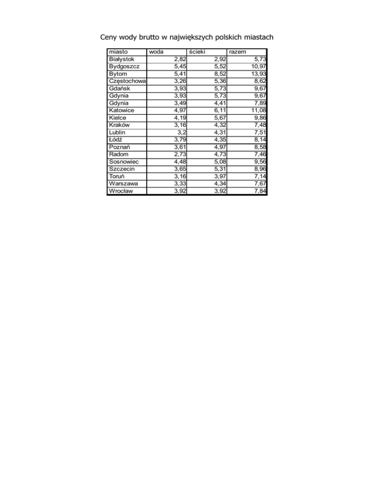 Ceny wody brutto w największych polskich miastach miasto woda Białystok Bydgoszcz Bytom Częstochowa Gdańsk Gdynia Gdynia Katowice Kielce Kraków Lublin Łódź Poznań Radom Sosnowiec Szczecin Toruń Warszawa Wrocław ścieki 2,82 5,45 5,41 3,26 3,93 3,93 3,49 4,97 4,19 3,16 3,2 3,79 3,61 2,73 4,48 3,65 3,16 3,33 3,92 razem 2,92 5,52 8,52 5,36 5,73 5,73 4,41 6,11 5,67 4,32 4,31 4,35 4,97 4,73 5,08 5,31 3,97 4,34 3,92 5,73 10,97 13,93 8,62 9,67 9,67 7,89 11,08 9,86 7,48 7,51 8,14 8,58 7,46 9,56 8,96 7,14 7,67 7,84