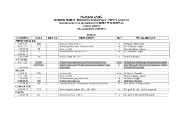 ROZKŁAD ZAJĘĆ Wydziału Historii i Dziedzictwa Kulturowego UPJPII w Krakowie Kierunek: historia, specjalność: EUROPA WSCHODNIA semestr zimowy rok akademicki 2016/2017 GODZINA SALA PONIEDZIAŁEK 8.00-9.30 9.45-11.15 11.30-13.00 15.00-16.30 16.45-18.15 18.30-20.00 GRUPA ROK III PRZEDMIOT RZ PROWADZĄCY 228a 228 23 228 Historia Polski do 1945 r. Historia powszechna i Polski do 1945r. Język rosyjski Proseminarium z historii XX w. w ćw l ćw Dr Maciej Zakrzewski Ks. dr Mariusz Trąba Mgr Magdalena Łubiarz Ks. dr Mariusz Trąba 102 Historia ZSRR (do 1941) w Dr Paweł Krokosz WTOREK 9.45-11.15 Postępowanie administracyjne/Warsztat edycji tekstu Skład wydawniczy/Praktyki administracyjne/Publicystyka historyczna w/ćw k Dr Sławomir Cebula/mgr Aleksandra Jastrzębska Mgr Aleksandra Jastrzębska/dr Sławomir Cebula/ dr Paweł Nowakowski 228 102 201 Archiwistyka Język rosyjski Proseminarium specjalnościowe Praktyki dziennikarskie Literatura rosyjska z elementami literatury białoruskiej w/ćw l ćw ćw w Dr Marcin Chorązki Mgr Magdalena Łubiarz Dr Marcin Rzepka Red. Paweł Spłtysik Prof. dr hab. Wasilij Szczukin 228 Historia powszechna XX w. (do 1945) w Ks. prof. dr hab. Jan Szczepaniak 228 Historia Kościoła w XX w. w Ks. prof. dr hab. Józef Wołczański 228/201 101/228/023 11.30-13.00 ŚRODA 8.00-9.30 9.45-11.15 11.30-13.00 13.15-14.45 15.00-16.30 228a CZWARTEK 16.45-18.15 PIĄTEK 15.00-16.30