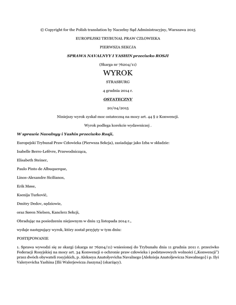 © Copyright for the Polish translation by Naczelny Sąd Administracyjny, Warszawa 2015 EUROPEJSKI TRYBUNAŁ PRAW CZŁOWIEKA PIERWSZA SEKCJA SPRAWA NAVALNYY I YASHIN przeciwko ROSJI (Skarga nr 76204/11) WYROK STRASBURG 4 grudnia 2014 r. OSTATECZNY 20/04/2015 Niniejszy wyrok zyskał moc ostateczną na mocy art. 44 § 2 Konwencji. Wyrok podlega korekcie wydawniczej . W sprawie Navalnyy i Yashin przeciwko Rosji, Europejski Trybunał Praw Człowieka (Pierwsza Sekcja), zasiadając jako Izba w składzie: Isabelle Berro-Lefèvre, Przewodnicząca, Elisabeth Steiner, Paulo Pinto de Albuquerque, Linos-Alexandre Sicilianos, Erik Møse, Ksenija Turković, Dmitry Dedov, sędziowie, oraz Søren Nielsen, Kanclerz Sekcji, Obradując na posiedzeniu niejawnym w dniu 13 listopada 2014 r., wydaje następujący wyrok, który został przyjęty w tym dniu: POSTĘPOWANIE 1. Sprawa wywodzi się ze skargi (skarga nr 76204/11) wniesionej do Trybunału dnia 11 grudnia 2011 r. przeciwko Federacji Rosyjskiej na mocy art. 34 Konwencji o ochronie praw człowieka i podstawowych wolności („Konwencji”) przez dwóch obywateli rosyjskich, p. Alekseya Anatolyevicha Navalnego [Aleksieja Anatoljewicza Nawalnego] i p. Ilyi Valeryevicha Yashina [Ilii Walerjewicza Jaszyna] (skarżący). 2. Skarżący byli reprezentowani odpowiednio przez p. O. Mikhaylovą i p. V. Prokhorova, prawników praktykujących w Moskwie. Rząd rosyjski („Rząd”) był reprezentowany przez p. G. Matyushkina, Przedstawiciela Federacji Rosyjskiej przed Europejskim Trybunałem Praw Człowieka. 3. Skarżący podnieśli, że zatrzymanie podczas demonstracji i późniejsze pozbawienie wolności naruszyły ich prawo do pokojowego zgromadzenia się, prawo do wolności wyrażania opinii i prawo do wolności. Twierdzili, że postępowanie administracyjne przed sądami krajowymi nie gwarantowało sprawiedliwego rozpatrzenia sprawy. Wnieśli również skargę na fatalne warunki w areszcie, które ich zdaniem były nieludzkie i poniżające. 4. W dniu 8 lutego 2012 r. skarga została zakomunikowana Rządowi. FAKTY I. OKOLICZNOŚCI SPRAWY 5. Skarżący urodzili się odpowiednio w 1976 r. i 1983 r. i mieszkają w Moskwie. Obaj skarżący są aktywistami politycznymi i liderami opozycji. Pierwszy z nich jest również znany ze swojej walki z korupcją i działalności blogerskiej. Drugi skarżący jest liderem ruchu politycznego „Solidarnost”. A. Demonstracja publiczna 5 grudnia 2011 r. i zatrzymanie skarżących 6. W dniu 4 grudnia 2011 r. w Rosji odbyły się powszechne wybory do Dumy Państwowej. 7. W dniu 5 grudnia 2011 r. skarżący wzięli udział w publicznej demonstracji (zebraniu) w miejscu Chistyye Prudy w Moskwie, aby zaprotestować przeciwko rzekomo sfałszowanym wyborom. Na demonstrację zgodę wyraził burmistrz Moskwy. Szacowano, że w zebraniu wzięło udział między 5 a 10 tys. osób. Podczas zebrania prowadzonego przez drugiego skarżącego, pierwszy skarżący wygłosił do uczestników przemówienie, w którym wezwał do nowych, uczciwych wyborów i nazwał Jedną Rosję – faworyta wyborów – „partią oszustów i złodziei”. 8. Po demonstracji skarżący zostali zatrzymani. Strony nie doszły do porozumienia co do okoliczności zatrzymania. Ich oświadczenia w tej sprawie podsumowano poniżej. 9. Skarżący twierdzili, że na koniec zebrania udali się wraz z innymi osobami w kierunku stacji metra Kuznetskiy Most, gdzie pierwszy skarżący zostawił swój samochód. Szli chodnikiem, nie zakłócając ruchu na drodze. Nagle droga została zablokowana przez oddziały prewencji (сотрудники внутренних войск и OMOН). Bez żadnego wstępu czy wezwania, policja otoczyła grupę około setki protestujących, w tym skarżących, przyciskając ich do budynku. Otoczona grupa skandowała: „Jeden za wszystkich, wszyscy za jednego!” Następnie policja zaczęła zatrzymywać protestujących. Według skarżących nikt nie stawiał oporu. Grupa wykonywała polecenia policji i udała się z nimi do policyjnego busa. 10. Według Rządu, na koniec zebrania drugi skarżący wezwał uczestników do marszu ul. Myasnitskayą do placu Lubyanskaya, a potem do biura Centralnej Komisji Wyborczej. O godz. 20.30 około sześćdziesięciu osób, w tym skarżący, wyruszyli bulwarem Chistoprudnyy, ul. Bolshaya Lubyanka i ul. Rozhdestvenka. Szli drogą, utrudniając ruch i skandując hasła takie jak „To nasze miasto!” czy „Precz z państwem policyjnym!” Na skrzyżowaniu ul. Pushecznaya i Rozhdestvenka policja zablokowała marsz i poleciła maszerującym zatrzymać się. Uczestnicy marszu przepchnęli się przez kordon policji i kontynuowali marsz do chwili, kiedy zostali ponownie zatrzymani przez policję przy Teatralnyy Proyezd 2. Zignorowali powtarzane przez policję wezwania do zatrzymania się, uniemożliwiając w ten sposób policji wykonanie zadania polegającego na zabezpieczeniu porządku publicznego. W obliczu nieustępliwego zachowania policja zatrzymała skarżących. 11. Obydwaj skarżący zostali zatrzymani ok. godz. 20.45 i zostali zabrani do policyjnego busa. B. Przewożenie ska rżących między komendami i nocne aresztowanie 12. Ok. godz. 21.40 skarżący zostali zabrani na Komendę Rejonową Policji Severnoye Izmaylovo w Moskwie. O godz. 23.40 przeprowadzono kontrolę osobistą pierwszego skarżącego, która trwała do godz. 00.15. Zatrzymano jego rzeczy osobiste, w tym telefon komórkowy, legitymację adwokata, zegarek, pieniądze, karty kredytowe, prawo jazdy i kilka sztuk ubrań. Dokonano również kontroli osobistej drugiego skarżącego i zatrzymano jego telefon komórkowy, pasek, zegarek, gwizdek i plakietkę „Przeciwko partii oszustów i złodziei”. Listę zatrzymanych przedmiotów udokumentowano w protokole z kontroli osobistej. Skarżący nie mogli ich odzyskać, chociaż przedmioty te nie zostały załączone do akt sprawy. 13. Skarżący poprosili, aby mogli zobaczyć się ze swoimi prawnika