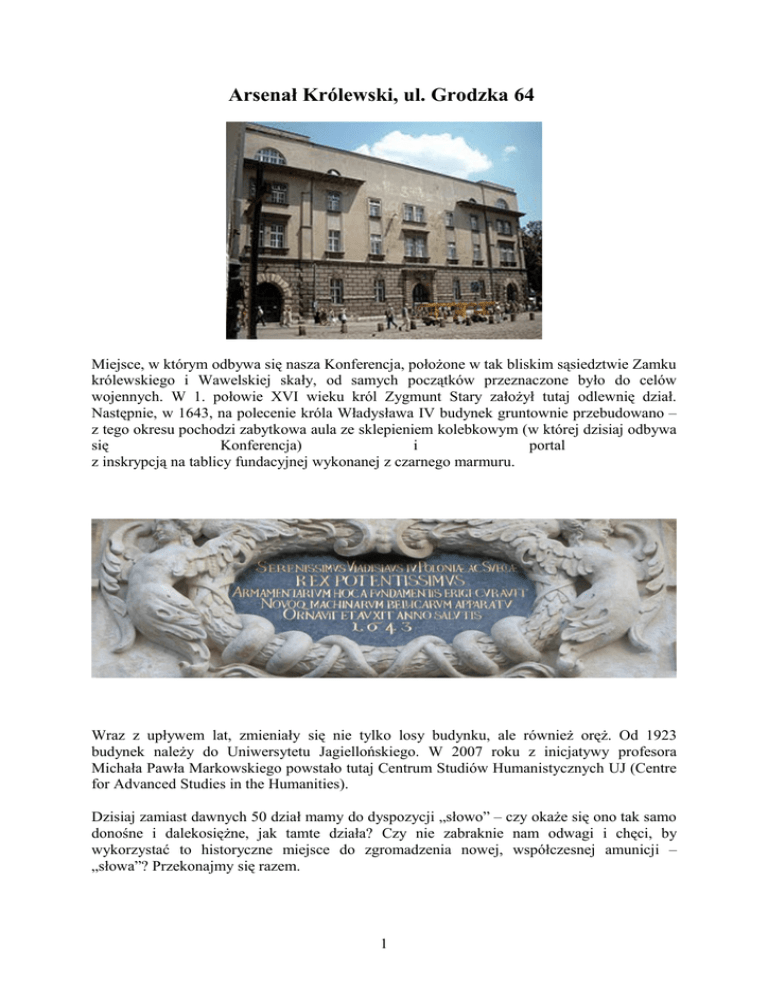 Arsenał Królewski, ul. Grodzka 64 Miejsce, w którym odbywa się nasza Konferencja, położone w tak bliskim sąsiedztwie Zamku królewskiego i Wawelskiej skały, od samych początków przeznaczone było do celów wojennych. W 1. połowie XVI wieku król Zygmunt Stary założył tutaj odlewnię dział. Następnie, w 1643, na polecenie króla Władysława IV budynek gruntownie przebudowano – z tego okresu pochodzi zabytkowa aula ze sklepieniem kolebkowym (w której dzisiaj odbywa się Konferencja) i portal z inskrypcją na tablicy fundacyjnej wykonanej z czarnego marmuru. Wraz z upływem lat, zmieniały się nie tylko losy budynku, ale również oręż. Od 1923 budynek należy do Uniwersytetu Jagiellońskiego. W 2007 roku z inicjatywy profesora Michała Pawła Markowskiego powstało tutaj Centrum Studiów Humanistycznych UJ (Centre for Advanced Studies in the Humanities). Dzisiaj zamiast dawnych 50 dział mamy do dyspozycji „słowo” – czy okaże się ono tak samo donośne i dalekosiężne, jak tamte działa? Czy nie zabraknie nam odwagi i chęci, by wykorzystać to historyczne miejsce do zgromadzenia nowej, współczesnej amunicji – „słowa”? Przekonajmy się razem. 1