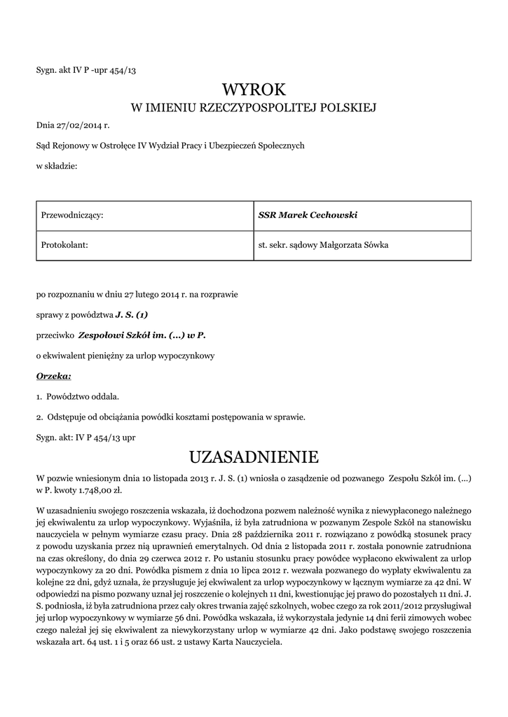 Sygn. akt IV P -upr 454/13 WYROK W IMIENIU RZECZYPOSPOLITEJ POLSKIEJ Dnia 27/02/2014 r. Sąd Rejonowy w Ostrołęce IV Wydział Pracy i Ubezpieczeń Społecznych w składzie: Przewodniczący: SSR Marek Cechowski Protokolant: st. sekr. sądowy Małgorzata Sówka po rozpoznaniu w dniu 27 lutego 2014 r. na rozprawie sprawy z powództwa J. S. (1) przeciwko Zespołowi Szkół im. (...) w P. o ekwiwalent pieniężny za urlop wypoczynkowy Orzeka: 1. Powództwo oddala. 2. Odstępuje od obciążania powódki kosztami postępowania w sprawie. Sygn. akt: IV P 454/13 upr UZASADNIENIE W pozwie wniesionym dnia 10 listopada 2013 r. J. S. (1) wniosła o zasądzenie od pozwanego Zespołu Szkół im. (...) w P. kwoty 1.748,00 zł. W uzasadnieniu swojego roszczenia wskazała, iż dochodzona pozwem należność wynika z niewypłaconego należnego jej ekwiwalentu za urlop wypoczynkowy. Wyjaśniła, iż była zatrudniona w pozwanym Zespole Szkół na stanowisku nauczyciela w pełnym wymiarze czasu pracy. Dnia 28 października 2011 r. rozwiązano z powódką stosunek pracy z powodu uzyskania przez nią uprawnień emerytalnych. Od dnia 2 listopada 2011 r. została ponownie zatrudniona na czas określony, do dnia 29 czerwca 2012 r. Po ustaniu stosunku pracy powódce wypłacono ekwiwalent za urlop wypoczynkowy za 20 dni. Powódka pismem z dnia 10 lipca 2012 r. wezwała pozwanego do wypłaty ekwiwalentu za kolejne 22 dni, gdyż uznała, że przysługuje jej ekwiwalent za urlop wypoczynkowy w łącznym wymiarze za 42 dni. W odpowiedzi na pismo pozwany uznał jej roszczenie o kolejnych 11 dni, kwestionując jej prawo do pozostałych 11 dni. J. S. podniosła, iż była zatrudniona przez cały okres trwania zajęć szkolnych, wobec czego za rok 2011/2012 przysługiwał jej urlop wypoczynkowy w wymiarze 56 dni. Powódka wskazała, iż wykorzystała jedynie 14 dni ferii zimowych wobec czego należał jej się ekwiwalent za niewykorzystany urlop w wymiarze 42 dni. Jako podstawę swojego roszczenia wskazała art. 64 ust. 1 i 5 oraz 66 ust. 2 ustawy Karta Nauczyciela. Pozwany w odpowiedzi na pozew wniósł o oddalenie powództwa w całości oraz zasądzenie na jego rzecz kosztów procesu według norm przepisanych. Pozwany uzasadniając swoje roszczenie wskazał, iż powódka błędnie interpretuje powołane przez nią przepisy ustawy Karta Nauczyciela, co sprawia, iż jej roszczenie jest nieuzasadnione. Pozwany podniósł, iż J. S. wykorzystała przysługujący jej urlop za rok 2011 r. w okresie ferii zimowych i letnich. Pozwany wskazał także, że na podstawie przepisów prawa pracy nie jest możliwe by wymiar urlopu za dany rok kalendarzowy mógł przekroczyć wymiar urlopu należnego za ten rok. Podniósł, iż wobec faktu, że powódka była zatrudniona na czas określony i wykorzystała przysługujący jej urlop za 2011 r., przysługujący jej ekwiwalent za urlop wypoczynkowy należało wyliczyć od 1 stycznia 2012 r. do 29 czerwca 2012 r. Sąd ustalił następujący stan faktyczny: Powódka była zatrudniona w pozwanym Zespole Szkół im. (...) w P. od 1 września 1974 r. do 28 października 2011 r. w pełnym wymiarze czasu pracy na stanowisku nauczyciela. Stosunek pracy łączący strony został rozwiązany na mocy porozumienia stron z powodu nabycia przez powódkę uprawnień emerytalnych, na podstawie art. 23 ust. 4 pkt 1 w zw. z art. 88 ust. 1 ustawy Karta Nauczyciela. (dowód: świadectwo pracy z dnia 28.10.2011 r. – k. 6 - 7) Następnie J. S. została przez pozwanego zatrudniona na podstawie umowy o pracę na czas określony od dnia 2 listopada 2011 r. do 29 czerwca 2012 r. Stosunek pracy łączący strony wygasł z chwilą upływu okresu na jaki zawarta była umowa o pracę. Wypłacono powódce ekwiwalent za niewykorzystany urlop wypoczynkowy w wymiarze 20 dni. (dowód: świadectwo pracy z dnia 29.06.2012 r. – k. 8 – 9, akta osobowe pracownika: umowa o pracę z dnia 26.10.2011 r.) Pismem z dnia 10 lipca 2012 r. J. S. wniosła do pracodawcy o wypłatę ekwiwalentu za niewykorzystany urlop wypoczynkowy za kolejne 22 dni, podnosząc, że w roku 2011/2012 nabyła prawo do urlopu wypoczynkowego w wymiarze 56 dni, a wykorzystała jedynie 14 (ferie zimowe), natomiast ekwiwalent wypłacono jej za 20 dni. W odpowiedzi na wniosek dyrektor Zespołu Szkół wskazała, iż powódka nabyła prawo do urlopu za cały okres prowadzenia zajęć, tj. 45 dni pomniejszone o 14 dni ferii zimowych. Wobec wypłaty ekwiwalentu za 20 dni, zobowiązała się do dokonania wypłaty ekwiwalentu za kolejne 11 dni. (dowód: pismo powódki z dnia 10.07.2012 r. – k. 10 – 11, odpowiedź na pismo z dnia 17.07.2012 r. – k. 12, polecenie wypłaty ekwiwalentu za 11 dni – k. 20, polecenie wypłaty ekwiwalentu za 20 dni - k. 21, dokument wyliczenia stawki – k. 22) Sąd zważył, co następuje: W niniejszej sprawie sporną kwestię stanowi liczba dni przysługującego powódce urlopu wypoczynkowego, będąca podstawą wypłaty ekwiwalentu za niewykorzystany urlop wypoczynkowy. Kwestie związane ze stosunkiem pracy nauczycieli zostały uregulowane w ustawie z dnia 26 stycznia 1982 r. Karta Nauczyciela. Trzeba także pamiętać, iż zgodnie z art. 91 c ust. 1 w zakresie spraw wynikających ze stosunku pracy, nieuregulowanych przepisami wskazanej ustawy, mają zastosowanie przepisy Kodeksu pracy. Zgodnie z art. 64 ust. 1 ustawy Karta Nauczyciela, nauczycielowi zatrudnionemu w szkole, w której w organizacji pracy przewidziano ferie letnie i zimowe, przysługuje urlop wypoczynkowy w wymiarze odpowiadającym okresowi ferii i w czasie ich trwania. Ustęp 5 wskazanego artykułu mówi, że nauczyciel zatrudniony przez cały okres trwania zajęć w danym roku szkolnym w szkole, w której w organizacji pracy przewidziano ferie szkolne, ma prawo do urlopu wypoczynkowego w wymiarze i na zasadach określonych w ust. 1, zaś nauczyciel zatrudniony przez okres krótszy niż 10 miesięcy w szkole, w której w organizacji pracy przewidziano ferie szk