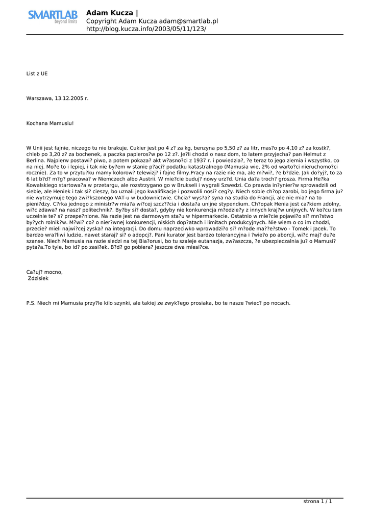 Adam Kucza | Copyright Adam Kucza [email protected] http://blog.kucza.info/2003/05/11/123/ List z UE Warszawa, 13.12.2005 r. Kochana Mamusiu! W Unii jest fajnie, niczego tu nie brakuje. Cukier jest po 4 z? za kg, benzyna po 5,50 z? za litr, mas?o po 4,10 z? za kostk?, chleb po 3,20 z? za bochenek, a paczka papieros?w po 12 z?. Je?li chodzi o nasz dom, to latem przyjecha? pan Helmut z Berlina. Najpierw postawi? piwo, a potem pokaza? akt w?asno?ci z 1937 r. i powiedzia?, ?e teraz to jego ziemia i wszystko, co na niej. Mo?e to i lepiej, i tak nie by?em w stanie p?aci? podatku katastralnego (Mamusia wie, 2% od warto?ci nieruchomo?ci rocznie). Za to w przytu?ku mamy kolorow? telewizj? i fajne filmy.Pracy na razie nie ma, ale m?wi?, ?e b?dzie. Jak do?yj?, to za 6 lat b?d? m?g? pracowa? w Niemczech albo Austrii. W mie?cie buduj? nowy urz?d. Unia da?a troch? grosza. Firma He?ka Kowalskiego startowa?a w przetargu, ale rozstrzygano go w Brukseli i wygrali Szwedzi. Co prawda in?ynier?w sprowadzili od siebie, ale Heniek i tak si? cieszy, bo uznali jego kwalifikacje i pozwolili nosi? ceg?y. Niech sobie ch?op zarobi, bo jego firma ju? nie wytrzymuje tego zwi?kszonego VAT-u w budownictwie. Chcia? wys?a? syna na studia do Francji, ale nie mia? na to pieni?dzy. C?rka jednego z ministr?w mia?a wi?cej szcz??cia i dosta?a unijne stypendium. Ch?opak Henia jest ca?kiem zdolny, wi?c zdawa? na nasz? politechnik?. By?by si? dosta?, gdyby nie konkurencja m?odzie?y z innych kraj?w unijnych. W ko?cu tam uczelnie te? s? przepe?nione. Na razie jest na darmowym sta?u w hipermarkecie. Ostatnio w mie?cie pojawi?o si? mn?stwo by?ych rolnik?w. M?wi? co? o nier?wnej konkurencji, niskich dop?atach i limitach produkcyjnych. Nie wiem o co im chodzi, przecie? mieli najwi?cej zyska? na integracji. Do domu naprzeciwko wprowadzi?o si? m?ode ma??e?stwo - Tomek i Jacek. To bardzo wra?liwi ludzie, nawet staraj? si? o adopcj?. Pani kurator jest bardzo tolerancyjna i ?wie?o po aborcji, wi?c maj? du?e szanse. Niech Mamusia na razie siedzi na tej Bia?orusi, bo tu szaleje eutanazja, zw?aszcza, ?e ubezpieczalnia ju? o Mamusi? pyta?a.To tyle, bo id? po zasi?ek. B?d? go pobiera? jeszcze dwa miesi?ce. Ca?uj? mocno, Zdzisiek P.S. Niech mi Mamusia przy?le kilo szynki, ale takiej ze zwyk?ego prosiaka, bo te nasze ?wiec? po nocach. strona 1 / 1