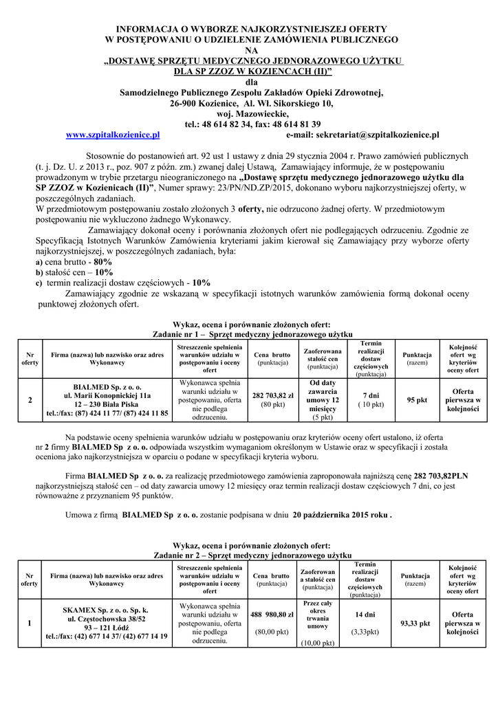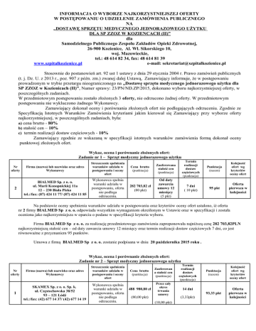 INFORMACJA O WYBORZE NAJKORZYSTNIEJSZEJ OFERTY W POSTĘPOWANIU O UDZIELENIE ZAMÓWIENIA PUBLICZNEGO NA „DOSTAWĘ SPRZĘTU MEDYCZNEGO JEDNORAZOWEGO UŻYTKU DLA SP ZZOZ W KOZIENCACH (II)” dla Samodzielnego Publicznego Zespołu Zakładów Opieki Zdrowotnej, 26-900 Kozienice, Al. Wł. Sikorskiego 10, woj. Mazowieckie, tel.: 48 614 82 34, fax: 48 614 81 39 www.szpitalkozienice.pl e-mail: [email protected] Stosownie do postanowień art. 92 ust 1 ustawy z dnia 29 stycznia 2004 r. Prawo zamówień publicznych (t. j. Dz. U. z 2013 r., poz. 907 z późn. zm.) zwanej dalej Ustawą, Zamawiający informuje, że w postępowaniu prowadzonym w trybie przetargu nieograniczonego na „Dostawę sprzętu medycznego jednorazowego użytku dla SP ZZOZ w Kozienicach (II)”, Numer sprawy: 23/PN/ND.ZP/2015, dokonano wyboru najkorzystniejszej oferty, w poszczególnych zadaniach. W przedmiotowym postępowaniu zostało złożonych 3 oferty, nie odrzucono żadnej oferty. W przedmiotowym postępowaniu nie wykluczono żadnego Wykonawcy. Zamawiający dokonał oceny i porównania złożonych ofert nie podlegających odrzuceniu. Zgodnie ze Specyfikacją Istotnych Warunków Zamówienia kryteriami jakim kierował się Zamawiający przy wyborze oferty najkorzystniejszej, w poszczególnych zadaniach, była: a) cena brutto - 80% b) stałość cen – 10% c) termin realizacji dostaw częściowych - 10% Zamawiający zgodnie ze wskazaną w specyfikacji istotnych warunków zamówienia formą dokonał oceny punktowej złożonych ofert. Wykaz, ocena i porównanie złożonych ofert: Zadanie nr 1 – Sprzęt medyczny jednorazowego użytku Nr oferty Firma (nazwa) lub nazwisko oraz adres Wykonawcy Streszczenie spełnienia warunków udziału w postępowaniu i oceny ofert 2 BIALMED Sp. z o. o. ul. Marii Konopnickiej 11a 12 – 230 Biała Piska tel.:/fax: (87) 424 11 77/ (87) 424 11 85 Wykonawca spełnia warunki udziału w postępowaniu, oferta nie podlega odrzuceniu. Cena brutto (punktacja) Zaoferowana stałość cen (punktacja) Termin realizacji dostaw częściowych (punktacja) Punktacja (razem) Kolejność ofert wg kryteriów oceny ofert 282 703,82 zł (80 pkt) Od daty zawarcia umowy 12 miesięcy (5 pkt) 7 dni ( 10 pkt) 95 pkt Oferta pierwsza w kolejności Na podstawie oceny spełnienia warunków udziału w postępowaniu oraz kryteriów oceny ofert ustalono, iż oferta nr 2 firmy BIALMED Sp z o. o. odpowiada wszystkim wymaganiom określonym w Ustawie oraz w specyfikacji i została oceniona jako najkorzystniejsza w oparciu o podane w specyfikacji kryteria wyboru. Firma BIALMED Sp z o. o. za realizację przedmiotowego zamówienia zaproponowała najniższą cenę 282 703,82PLN najkorzystniejszą stałość cen – od daty zawarcia umowy 12 miesięcy oraz termin realizacji dostaw częściowych 7 dni, co jest równoważne z przyznaniem 95 punktów. Umowa z firmą BIALMED Sp z o. o. zostanie podpisana w dniu 20 października 2015 roku . Wykaz, ocena i porównanie złożonych ofert: Zadanie nr 2 – Sprzęt medyczny jednorazowego użytku Nr oferty Firma (nazwa) lub nazwisko oraz adres Wykonawcy Streszczenie spełnienia warunków udziału w postępowaniu i oceny ofert 1 SKAMEX Sp. z o. o. Sp. k. ul. Częstochowska 38/52 93 – 121 Łódź tel.:/fax: (42) 677 14 37/ (42) 677 14 19 Wykonawca spełnia warunki udziału w postępowaniu, oferta nie podlega odrzuceniu. Cena brutto (punktacja) Zaoferowan a stałość cen (punktacja) Termin realizacji dostaw częściowych (punktacja) 488 980,80 zł Przez cały okres trwania umowy 14 dni (80,00 pkt) (10,00 pkt) (3,33pkt) Punktacja (razem) Kolejność ofert wg kryteriów oceny ofert 93,33 pkt Oferta pierwsza w kolejności Na podstawie oceny spełnienia warunków udziału w postępowaniu oraz kryteriów oceny ofert ustalono, iż oferta nr 1 firmy SKAMEX Sp. z o. o. Sp. k. odpowiada wszystkim wymaganiom określonym w Ustawie oraz w specyfikacji i została oceniona jako najkorzystniejsza w oparciu o podane w specyfikacji kryteria wyboru. Firma SKAMEX Sp. z o. o. Sp. k. za realizację przedmiotowego zamówienia zaproponowała najniższą cenę 488 980,80 PLN najkorzystniejszą stałość cen - przez cały okres trwania umowy oraz termin realizacji dostaw częściowych – 14 dni, co jest równoważne z przyznaniem 93,33 punktów. Umowa z firmą SKAMEX Sp. z o. o. Sp. k. zostanie podpisana w dniu 20 października 2015 roku z mocą obowiązywania od dnia 01 listopada 2015 roku. Wykaz, ocena i porównanie złożonych ofert: Zadanie nr 3 – Sprzęt medyczny jednorazowego użytku Nr oferty Firma (nazwa) lub nazwisko oraz adres Wykonawcy Streszczenie spełnienia warunków udziału w postępowaniu i oceny ofert 3 EUMed Sp. z o. o. ul. Chłopickiego 50 04 – 275 Warszawa tel.:/fax.:(22) 879 69 20/ (22) 879 69 28 Wykonawca spełnia warunki udziału w postępowaniu, oferta nie podlega odrzuceniu. Cena brutto (punktacja) Zaoferowana stałość cen (punktacja) Termin realizacji dostaw częściowych (punktacja) 86 508,00 zł Przez cały okres trwania umowy 14 dni (80,00 pkt) Punktacja (razem) Kolejność ofert wg kryteriów oceny ofert 93,33 pkt Oferta pierwsza w kolejności (3,33 pkt) (10,00 pkt) Na podstawie oceny spełnienia warunków udziału w postępowaniu oraz kryteriów oceny ofert ustalono, iż oferta nr 3 firmy EUMed Sp. z o. o. odpowiada wszystkim wymaganiom określonym w Ustawie oraz w specyfikacji i została oceniona jako najkorzystniejsza w oparciu o podane w specyfikacji kryteria wyboru. Firma EUMed Sp. z o. o. za realizację przedmiotowego zamówienia zaproponowała najniższą cenę 86 508,00 PLN stałość cen – przez cały okres trwania umowy oraz termin realizacji dostaw częściowych – 14 dni, co jest równoważne z przyznaniem 93,33 punktów. Umowa z firmą EUMed Sp. z o. o. zostanie podpisana w dniu 20 października 2015 roku . Wykaz, ocena i porównanie złożonych ofert: Zadanie nr 4 – Sprzęt medyczny jednorazowego użytku Nr oferty Firma (nazwa) lub nazwisko oraz adres Wykonawcy Str