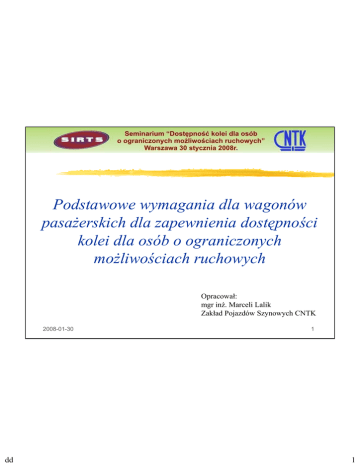 Podstawowe wymagania dla wagonów pasażerskich dla zapewnienia dostępności kolei dla osób o ograniczonych możliwościach ruchowych Opracował: mgr inż. Marceli Lalik Zakład Pojazdów Szynowych CNTK 2008-01-30 dd 1 1 Wymagania zawarte w TSI PRM: - obowiązują w całości dla nowego taboru oraz - nie dotyczą taboru już eksploatowanego, dopóki jego elementy konstrukcji lub wyposażenia definiowane w TSI PRM nie zostaną poddane odnowie lub modernizacji 2008-01-30 dd 2 2 Termin “osoby o ograniczonej sprawności ruchowej” obejmuje następujące kategorie pasażerów: - osoby na wózkach inwalidzkich - inne osoby o ograniczonej sprawności ruchowej, zwane dalej osobami uprzywilejowanymi, w tym: 2008-01-30 dd 3 3 Osoby uprzywilejowane osoby mające trudności z chodzeniem kobiety w ciąży i osoby z dziećmi osoby starsze osoby niedowidzące i niewidzące osoby niedosłyszące i głuche osoby z upośledzeniem w zakresie komunikacji osoby niskiego wzrostu (w tym dzieci) osoby z ciężkim lub nieporęcznym bagażem 2008-01-30 dd 4 4 Elementami taboru kolejowego objętymi wymaganiami TSI PRM są: siedzenia osób uprzywilejowanych miejsca na wózki inwalidzkie drzwi oświetlenie toalety przejścia informacje dla pasażerów 2008-01-30 dd 5 5 Elementami taboru kolejowego objętymi wymaganiami TSI PRM są: zmiany wysokości poręcze przedziały do spania dostępne dla osób na wózkach inwalidzkich położenie stopnia przy wsiadaniu i wysiadaniu z pociągu 2008-01-30 dd 6 6 Siedzenia osób uprzywilejowanych oznaczenie dostępna przestrzeń minimum 10% miejsc/poc. przy drzwiach wejściowych siedzenia stałe ruchomy podłokietnik 2008-01-30 dd 7 7 Siedzenia osób uprzywilejowanych 2008-01-30 dd 8 8 Miejsca na wózki inwalidzkie oznaczenie 2008-01-30 dd co najmniej 2 miejsca na pociąg ustawienie przodem lub tyłem do jazdy pociągu miejsce na obrót urządzenie alarmowe element oparcia wolna od przeszkód przestrzeń nad i przed siedzeniem 9 9 Miejsca na wózki inwalidzkie 2008-01-30 dd 10 10 Miejsca na wózki inwalidzkie 2008-01-30 dd 11 11 Miejsca na wózki inwalidzkie 2008-01-30 dd 12 12 Drzwi zewnętrzne wykrywanie pasażera w drzwiach prześwit ≥800 mm sterowanie 800÷1200 mm kontrast na zewnątrz i na podłodze wagonu oznaczenie wózka inwalidzkiego słyszalny sygnał otwierania i zamykania 80% stopnia wejściowego oświetlone 75lx 2008-01-30 dd 13 13 Drzwi wewnętrzne wykrywanie pasażera w drzwiach prześwit ≥800 mm dla przejazdu wózka inwalidzkiego dotykowe elementy sterowania na wysokości 800÷1200 mm niski i wysoki pas kontrastowy szerokości ≥100 mm zsynchronizowane drzwi międzywagonowe 2008-01-30 dd 14 14 Toaleta standardowa szerokość drzwi ≥500 mm sterowanie na wysokości 800÷1200 mm dotykowe i kontrastowe elementy sterowania nieruchoma poręcz przy ustępie i umywalce 2008-01-30 dd 15 15 Toaleta uniwersalna szerokość drzwi ≥800 mm sterowanie na wysokości 800÷1200 mm 2 urządzenia alarmowe łatwy dostęp do całego wyposażenia przewijak dla dzieci o wymiarach ≥500/700 mm 2008-01-30 dd 16 16 Toaleta uniwersalna podjazd wózka 2008-01-30 dd 17 17 Toaleta uniwersalna poręcze 2008-01-30 dd 18 18 Toaleta uniwersalna 2008-01-30 dd 19 19 Przejścia szerokość ≥450 mm do wysokości 1000 mm oraz ≥550 mm od 1000 - 1950 mm n.p.p. dla wózka ≥800 mm do wysokości 1450 mm pomiędzy wagonami w składzie ≥550mm średnica wolnego okręgu obok miejsca na wózek ≥1500 mm 2008-01-30 dd 20 20 Informacje dla pasażerów relacja pociągu na wagonie i wewnątrz numery rezerwacji na każdych drzwiach najwyżej 5 piktogramów w jednym miejscu następny przystanek widoczny dla ≥51% pasażerów system nagłaśniający, więcej niż jeden język 2008-01-30 dd 21 21 Zmiany wysokości stopnie wewnętrzne: wysokość ≤200mm, głębokość ≥280mm pas kontrastowy, 45 - 50mm, na pierwszym i ostatnim stopniu bez stopni w obszarze wózka inwalidzkiego maksymalne pochylenie podjazdów: długość podjazdu >1000 600 - 1000 <600 2008-01-30 dd [stopnie] 4,47 8,5 10,2 [%] 8 15 18 22 22 Poręcze profil okrągły o średnicy 30÷40 mm umieszczone w odległości ≥45mm od sąsiedniej powierzchni powinny kontrastować ze swoim tłem drzwi z więcej niż dwoma stopniami wejściowymi powinny posiadać po obu stronach poręcze pionowe, sięgające wysokości między 700÷1200 mm nad pierwszym stopniem 2008-01-30 dd 23 23 Przedziały sypialne dla osób na wózkach inwalidzkich jedno lub dwa miejsca na pociąg przynajmniej 2 urządzenia alarmowe, na wysokości ≤450 mm i pomiędzy 800 a 1200 mm, różniące się od pozostałych elementów 2008-01-30 dd 24 24 Położenie stopnia przy wsiadaniu i wysiadaniu z pociągu stopień wejścia powinien znajdować się w obszarze jak na rysunku wszystkie stopnie przeciwpoślizgowe, szerokości drzwi wysokość stopni zewn. powinna ≤230 mm, głębokość ≥150 mm 2008-01-30 dd kontrastujący pas na pierwszym i ostatnim stopniu wejściowym 25 25 Przykładowy wagon przystosowany do przewozu osób na wózkach inwalidzkich 2008-01-30 dd 26 26 Dziękuję za uwagę 2008-01-30 dd 27 27