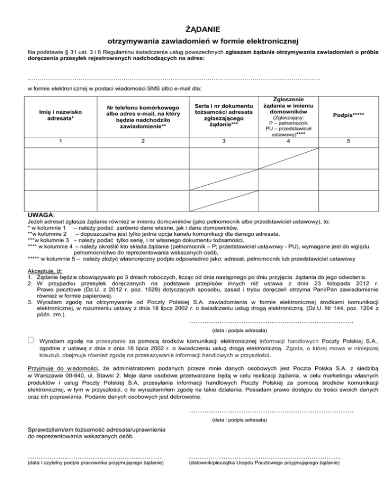 ŻĄDANIE otrzymywania zawiadomień w formie elektronicznej Na podstawie § 31 ust. 3 i 6 Regulaminu świadczenia usług powszechnych zgłaszam żądanie otrzymywania zawiadomień o próbie doręczenia przesyłek rejestrowanych nadchodzących na adres: …………………………………………………………………………………………………………………………………… w formie elektronicznej w postaci wiadomości SMS albo e-mail dla: Imię i nazwisko adresata* Nr telefonu komórkowego albo adres e-mail, na który będzie nadchodziło zawiadomienie** Seria i nr dokumentu tożsamości adresata zgłaszającego żądanie*** 1 2 3 Zgłoszenie żądania w imieniu domowników (Zgłaszający: P – pełnomocnik PU – przedstawiciel ustawowy)**** Podpis***** 4 5 UWAGA: Jeżeli adresat zgłasza żądanie również w imieniu domowników (jako pełnomocnik albo przedstawiciel ustawowy), to: * w kolumnie 1 – należy podać zarówno dane własne, jak i dane domowników, **w kolumnie 2 – dopuszczalna jest tylko jedna opcja kanału komunikacji dla danego adresata, ***w kolumnie 3 – należy podać tylko serię˛ i nr własnego dokumentu tożsamości, **** w kolumnie 4 – należy określić kto składa żądanie (pełnomocnik – P; przedstawiciel ustawowy - PU), wymagane jest do wglądu pełnomocnictwo do reprezentowania wskazanych osób, ***** w kolumnie 5 – należy złożyć własnoręczny podpis odpowiednio jako: adresat, pełnomocnik lub przedstawiciel ustawowy Akceptuję, iż: 1. Żądanie będzie obowiązywało po 3 dniach roboczych, licząc od dnia następnego po dniu przyjęcia żądania do jego odwołania. 2. W przypadku przesyłek doręczanych na podstawie przepisów innych niż ustawa z dnia 23 listopada 2012 r. Prawo pocztowe (Dz.U. z 2012 r. poz. 1529) dotyczących sposobu, zasad i trybu doręczeń otrzyma Pani/Pan zawiadomienie również w formie papierowej. 3. Wyrażam zgodę na otrzymywanie od Poczty Polskiej S.A. zawiadomienia w formie elektronicznej środkami komunikacji elektronicznej, w rozumieniu ustawy z dnia 18 lipca 2002 r. o świadczeniu usług drogą elektroniczną. (Dz.U. Nr 144, poz. 1204 z późn. zm.). …………………………………….…………………………… (data i podpis adresata) Wyrażam zgodę na przesyłanie za pomocą środków komunikacji elektronicznej informacji handlowych Poczty Polskiej S.A., zgodnie z ustawą z dnia z dnia 18 lipca 2002 r. o świadczeniu usług drogą elektroniczną. Zgoda, o której mowa w niniejszej klauzuli, obejmuje również zgodę na przekazywanie informacji handlowych w przyszłości. Przyjmuję do wiadomości, że administratorem podanych przeze mnie danych osobowych jest Poczta Polska S.A. z siedzibą w Warszawie 00-940, ul. Stawki 2. Moje dane osobowe przetwarzane będą w celu realizacji żądania, w celu marketingu własnych produktów i usług Poczty Polskiej S.A, przesyłania informacji handlowych Poczty Polskiej za pomocą środków komunikacji elektronicznej, w tym w przyszłości, o ile wyraziłam/łem zgodę na takie działania. Posiadam prawo dostępu do treści swoich danych oraz ich poprawiania. Podanie danych osobowych jest dobrowolne. …………………………………….…………………………… (data i podpis adresata) Sprawdziłam/em tożsamość adresata/uprawnienia do reprezentowania wskazanych osób ……………………………………..……………… ………………………………..……………….………….. (data i czytelny podpis pracownika przyjmującego żądanie) (datownik/pieczątka Urzędu Pocztowego przyjmującego żądanie)