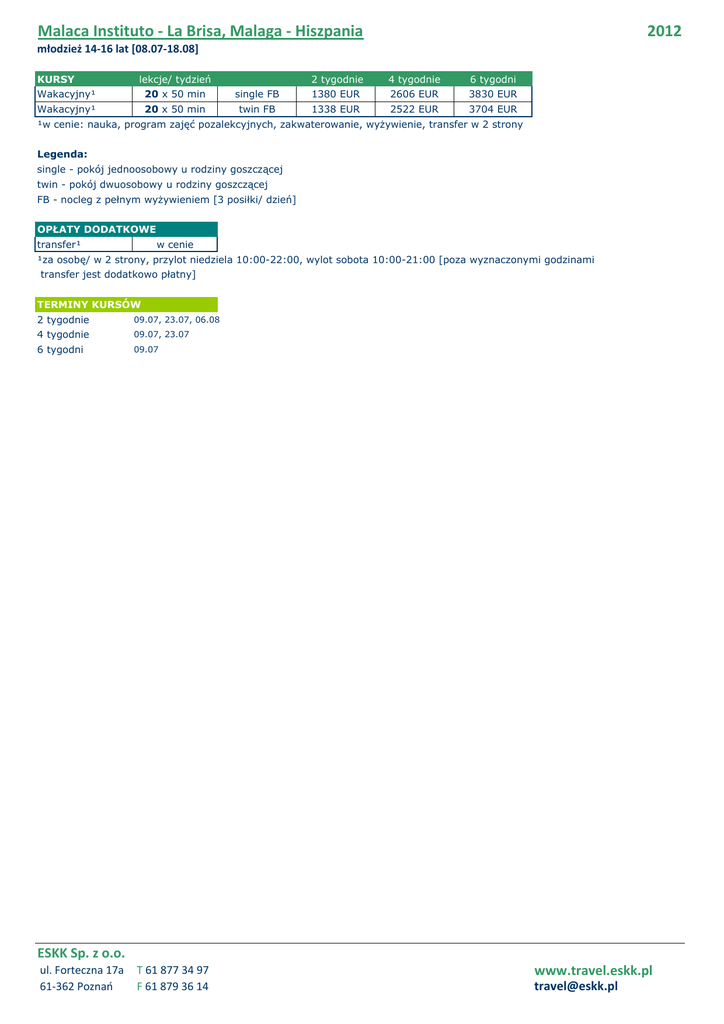 Malaca Instituto - La Brisa, Malaga - Hiszpania 2012 młodzież 14-16 lat [08.07-18.08] 2 tygodnie 4 tygodnie 6 tygodni Wakacyjny¹ 20 x 50 min single FB 1380 EUR 2606 EUR 3830 EUR Wakacyjny¹ 20 x 50 min twin FB 1338 EUR 2522 EUR 3704 EUR KURSY lekcje/ tydzień ¹w cenie: nauka, program zajęć pozalekcyjnych, zakwaterowanie, wyŜywienie, transfer w 2 strony Legenda: single - pokój jednoosobowy u rodziny goszczącej twin - pokój dwuosobowy u rodziny goszczącej FB - nocleg z pełnym wyŜywieniem [3 posiłki/ dzień] OPŁATY DODATKOWE transfer¹ w cenie ¹za osobę/ w 2 strony, przylot niedziela 10:00-22:00, wylot sobota 10:00-21:00 [poza wyznaczonymi godzinami transfer jest dodatkowo płatny] TERMINY KURSÓW 2 tygodnie 09.07, 23.07, 06.08 4 tygodnie 09.07, 23.07 6 tygodni 09.07 ESKK Sp. z o.o. ul. Forteczna 17a 61-362 Poznań T 61 877 34 97 F 61 879 36 14 www.travel.eskk.pl [email protected]