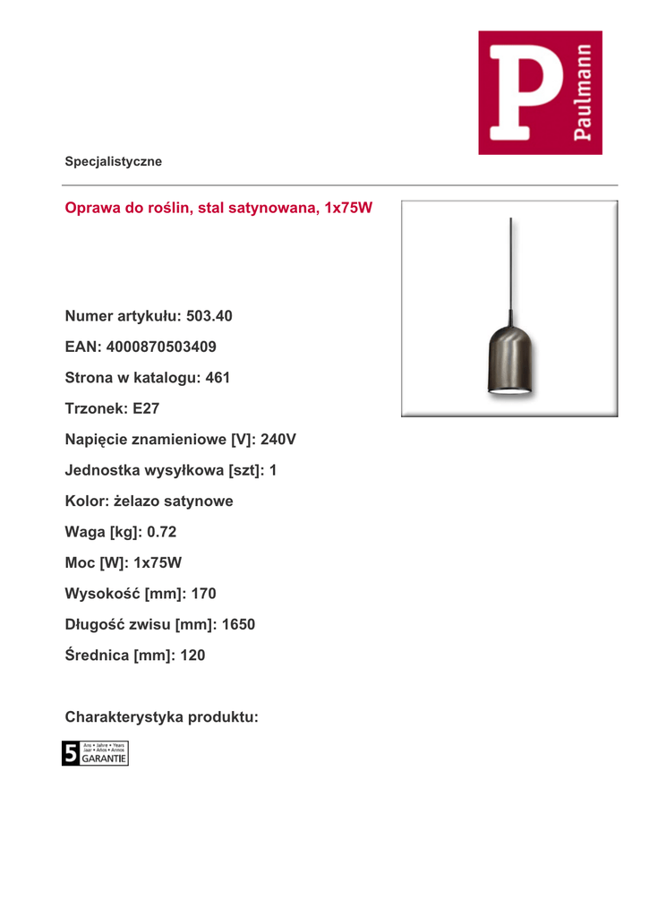 Specjalistyczne Oprawa do roślin, stal satynowana, 1x75W Numer artykułu: 503.40 EAN: 4000870503409 Strona w katalogu: 461 Trzonek: E27 Napięcie znamieniowe [V]: 240V Jednostka wysyłkowa [szt]: 1 Kolor: żelazo satynowe Waga [kg]: 0.72 Moc [W]: 1x75W Wysokość [mm]: 170 Długość zwisu [mm]: 1650 Średnica [mm]: 120 Charakterystyka produktu: