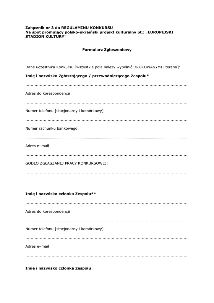 Załącznik nr 3 do REGULAMINU KONKURSU Na spot promujący polsko-ukraiński projekt kulturalny pt.: „EUROPEJSKI STADION KULTURY” Formularz Zgłoszeniowy Dane uczestnika Konkursu [wszystkie pola naleŜy wypełnić DRUKOWANYMI literami]: Imię i nazwisko Zgłaszającego / przewodniczącego Zespołu* ............................................................................................................................ Adres do korespondencji ............................................................................................................................ Numer telefonu [stacjonarny i komórkowy] ............................................................................................................................ Numer rachunku bankowego ………………………………………………………………………………………………………………………………………………… Adres e–mail ............................................................................................................................ GODŁO ZGŁASZANEJ PRACY KONKURSOWEJ: ............................................................................................................................ Imię i nazwisko członka Zespołu** ............................................................................................................................ Adres do korespondencji ............................................................................................................................ Numer telefonu [stacjonarny i komórkowy] ............................................................................................................................ Adres e–mail ............................................................................................................................ Imię i nazwisko członka Zespołu ............................................................................................................................ Adres do korespondencji ............................................................................................................................ Numer telefonu [stacjonarny i komórkowy] ............................................................................................................................ Adres e–mail ............................................................................................................................ [W PRZYPADKU WIĘKSZEJ LICZBY CZŁONKÓW, PROSIMY O DOPISANIE ICH WEDŁUG POWYśSZEGO WZORU] * niepotrzebne skreślić ** dotyczy w razie zgłoszenia dokonywanego przez Zespół OŚWIADCZENIA 1. Oświadczam/y, Ŝe jestem/jesteśmy autorem/autorami opatrzonego wskazanym powyŜej godłem Spotu na Konkurs na spot promujący polsko-ukraiński projekt kulturalny pt.: „EUROPEJSKI STADION KULTURY” oraz Ŝe zgłoszony spot nie narusza jakichkolwiek praw osób trzecich ani obowiązujących przepisów prawa. 2. Oświadczam/y, Ŝe znam/y i akceptuję/emy postanowienia „Regulaminu Konkursu na spot promujący polsko-ukraiński projekt kulturalny pt.: „EUROPEJSKI STADION KULTURY”” 3. WyraŜamy zgodę na przetwarzanie moich/naszych danych osobowych zgodnie z ustawą z dnia 29.08.1997 r. o ochronie danych osobowych (tekst jedn. Dz. U. z 2002 r., Nr 101, poz. 926 z późn. zm.) przez Organizatora Konkursu dla celów związanych z przeprowadzeniem i rozstrzygnięciem Konkursu, w tym na ich opublikowanie w środkach masowego przekazu, jak równieŜ dla celów związanych z organizacją i przeprowadzeniem wystawy pokonkursowej. 4. WyraŜam/y zgodę na prezentowanie Spotu lub jego fragmentów w materiałach promocyjnych Organizatora Konkursu oraz w dokumentacji konkursowej na wszystkich polach eksploatacji (m.in. w materiałach drukowanych, internecie) w materiałach promocyjnych, broszurach, biuletynach, plakatach oraz innych kanałach i narzędziach słuŜących promocji Konkursu oraz Organizatora Konkursu oraz projektu „EUROPEJSKI STADION KULTURY”. 5. W razie otrzymania nagrody wyraŜam/y zgodę na przeniesienie autorskich praw majątkowych do zgłoszonego Spotu na NCK oraz zobowiązuję/emy się do szczegółowego uzupełnienia Spotu na potrzeby kampanii promocyjnej. 6. W przypadku nagrodzenia lub wyróŜnienia pracy zobowiązuję/emy się dostarczyć NCK pliki otwarte. 7. W przypadku niezgodności z prawdą ww. oświadczenia zgadzam/y się ponieść całkowitą i wyłączną odpowiedzialność z tego tytułu, w szczególności zobowiązuję/emy się pokryć w całości ewentualną szkodę oraz wszelkie udokumentowane koszty z tym związane. ............................................................ (data i miejsce) ............................................................ (podpis/y autora/ów)