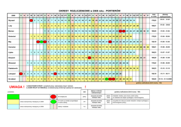 OKRESY ROZLICZENIOWE w 2008 roku - PORTIERÓW 2008 S N P Styczeń W Ś 1 2 2 CZ PT 3 Luty S N P W Ś CZ PT 4 5 6 7 8 9 10 11 12 13 14 15 16 17 18 19 20 21 22 23 24 25 26 27 28 29 30 31 1 2 3 4 5 6 7 8 9 10 11 12 13 14 15 16 17 18 19 20 21 22 23 24 25 26 27 28 29 1 2 3 4 5 6 7 8 9 Marzec Kwiecień 1 2 Maj 1 2 1 2 Październik Listopad 1 2 Grudzień P W Ś CZ PT S N P W Ś CZ PT S N P W Ś 5 6 7 8 9 10 11 12 13 14 15 16 17 18 19 20 21 22 23 24 25 26 27 28 29 30 1 2 3 3 4 5 6 7 8 9 1 2 3 4 5 6 3 CZ PT 7 8 9 6 7 8 9 10 11 12 13 14 15 16 17 18 19 20 21 22 23 24 25 26 27 28 29 30 31 1 2 3 4 5 6 7 8 9 4 5 6 7 8 9 10 11 12 13 14 15 16 17 18 19 20 21 22 23 24 25 26 27 28 29 30 1 2 3 4 5 6 7 8 5 6 7 8 9 1 2 3 4 5 6 7 10 11 12 13 14 15 16 17 18 19 20 21 22 223 24 25 26 27 28 29 30 31 11 10 11 12 13 14 15 16 17 18 19 20 21 22 23 24 25 26 27 28 29 30 8 9 10 11 12 13 14 15 16 17 18 19 20 21 22 23 24 limit m-c/dni 176|22 15 10 11 12 13 14 15 16 17 18 19 20 21 22 23 24 25 26 27 28 29 30 31 3 4 P 10 11 12 13 14 15 16 17 18 19 20 21 22 23 24 25 26 27 28 29 30 5 3 N 22 10 11 12 13 14 15 16 17 18 19 20 21 22 23 24 25 26 27 28 29 30 31 4 9 S 23 24 10 11 12 13 14 15 16 17 18 19 20 21 22 23 24 25 26 27 28 29 30 31 4 Sierpień Wrzesień N 3 Czerwiec Lipiec S 25 26 25 26 27 28 29 30 31 168|21 okresy rozliczeniowe 01.01 - 31.01 01.02 - 29.02 160|20 01.03 - 31.04 176|22 01.04 - 30.04 152|19 01.05 - 31.05 168|21 01.06 - 30.06 184|23 01.07 - 31.07 160|20 01.08 - 31.08 176|22 01.09 - 30.09 184|23 01.10 - 31.10 152|19 01.11 - 30.11 160|20 01.12 - 31.12.2008 godziny nadliczbowe (limit roczny - 150) UWAGA ! 1) DODATKOWE DYŻURY na kartach pracy zaznaczamy innym kolorem. 2.) DZIEŃ WOLNY ZA NIEDZIELĘ na kartach pracy winien być opisany lub zaznaczany. LEGENDA dni świąteczne ! etat dyżury w okresie rozliczeniowym pełny stosownie do limitu miesiąca I etatu płatne 100% niedziele i świeta, pora nocna, dzień wolny za niedziele lub święto wynikające z harmonogramu płatne 50% wszystkie dni robocze (nawet niedziele i święta wynikające z harmonogramu pracy) okres rozliczeniowy miesięczny w 2008 dni wolne za święta przypadające w wolne soboty 3/4 stosownie do limitu miesiąca I etatu okres rozliczeniowy miesięczny w 2008 soboty i niedziele 1/2 stosownie do limitu miesiąca I etatu godziny nadliczbowe (limit roczny - 150)