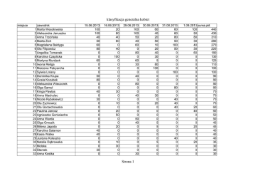 klasyfikacja generalna kobiet miejsce zawodnik 1 Marta Wesołowska 2 Aleksandra Januszka 3 Anna Trzcińska 4 Marta Zich 5 Magdalena Bałdyga 6 Ola Filipowicz 7 Angelika Tomanek 8 Karolina Czaplicka 9 Martyna Murdzek 10 Iwona Religa 11 Marzena Patryarcha 12 Sylwia Lniany 13 Dominika Krupa 14 Gosia Kozubek 15 Aleksandra Wieczorek 16 Olga Samul 17 Kinga Pawlas 18 Anna Machulec 19 Nicole Rybakiewicz 20 Ola Zychowicz 21 Ola Gorzechowska 22 Paulina Janosz 23 Agnieszka Goniwiecha 24 Anna Warda 25 Olga Omozik 26 Milena Jagoda 27 Karolina Salamon 28 Kasia Walke 29 Justyna Koleszko 30 Natalia Dąbrowska 31 Molska 32 Starzek 33 Anna Kostka 15.06.2013 100 100 40 50 60 80 0 0 60 0 0 0 50 80 0 0 40 0 30 0 0 0 0 0 0 0 40 40 0 0 0 30 0 16.06.2013 20 80 40 60 0 40 0 100 0 0 0 0 0 0 0 0 30 0 0 10 0 20 50 0 0 20 0 0 0 10 30 0 0 29.06.2013 100 100 50 40 60 0 80 0 60 30 0 0 40 0 80 0 0 40 0 0 0 0 0 50 40 0 0 0 0 0 0 0 30 Strona 1 30.06.2013 60 40 20 50 10 20 40 30 5 80 100 0 0 0 0 0 0 30 0 20 0 0 0 0 5 5 0 0 0 5 0 0 0 31.08.2013 60 60 80 50 100 50 0 0 0 0 0 100 0 0 0 80 0 0 40 40 40 0 0 0 0 0 0 0 40 0 0 0 0 1.09.2013 suma pkt 100 50 80 30 40 30 60 0 0 0 0 0 0 0 0 0 0 0 0 0 20 40 0 0 0 20 0 0 0 20 0 0 0 440 430 310 280 270 220 180 130 125 110 100 100 90 80 80 80 70 70 70 70 60 60 50 50 45 45 40 40 40 35 30 30 30 klasyfikacja generalna kobiet 34 Karolina Cempiel 35 Ela Doniczka 36 Ewelina Szweda 37 Agnieszka Krawiec 38 Paulina Wilk 39 Anna Reguła 40 Marta Plajstek 41 Magda Oleczek 42 Anna Radzikowska 43 Kazek Gosia 44 Gabriela Małota 45 Katarzyna Przeździng 46 Aleksandra Kobiec 47 Ewa Kochel 0 0 0 0 0 0 0 0 0 0 0 0 0 0 20 0 0 10 10 0 0 0 0 0 0 0 0 0 0 0 0 0 0 0 0 0 0 0 0 0 0 0 Strona 2 0 20 0 0 0 10 10 0 5 5 5 5 1 1 0 0 0 0 0 0 0 0 0 0 0 0 0 0 0 0 20 0 0 0 0 10 0 0 0 0 0 0 20 20 20 10 10 10 10 10 5 5 5 5 1 1 Klasyfikacja generalna-mężczyzn miejsce zawodnik 1 Arkadiusz Łokociejewski 2 Adam Dąbrowski 3 Dawid Bułakowski 4 Aleksander Gwizdała 5 Piot Thomann 6 Jarosław Duży 7 Tomasz Kotara 8 Dawid Małysza 9 Adrian Ciupa 10 Bartosz Andrzejczak 11 Łukasz Makowski 12 Michał Lachowicz 13 Mateusz Mielnik 14 Winiarski 15 Tworzydło 16 Tomasz Krochmal 17 Tomasz Eberhardt 18 maj 19 Wojtal 20 Karol Kloś 21 Mateusz Palusiński 22 Jan Bartoniek 23 Piotr Walke 24 Mateusz Miłkowski 25 Paweł Jodłowski 26 Płaneta 27 Michał Koj 28 Rafał Koj 29 Przemysław Gajdzik 30 Marcin Smyczek 31 Michał Darocha 32 Piotr Gagla 33 Stanisław Ciupa 15.06.2013 60 50 0 60 0 10 20 0 0 0 40 0 0 100 100 10 0 80 80 0 0 10 50 0 0 0 30 30 0 40 0 0 0 16.06.2013 100 80 0 0 0 0 40 0 0 0 30 0 0 0 0 20 0 0 0 0 0 20 20 0 0 60 0 0 40 0 0 10 0 Strona 3 29.06.2013 80 60 0 0 0 50 0 100 0 0 0 60 100 0 0 30 50 0 0 80 0 30 0 20 0 0 30 30 0 0 40 0 0 30.06.2013 30 40 60 0 100 0 20 20 0 0 0 10 1 0 0 5 0 0 0 0 80 1 0 40 10 0 0 0 20 0 0 20 0 31.08.2013 80 40 40 80 0 40 30 0 100 100 20 20 0 0 0 10 40 0 0 0 0 10 0 10 0 0 0 0 0 20 20 30 60 1.09.2013 suma pkt 80 50 100 0 40 40 20 0 20 20 30 30 0 0 0 20 0 0 0 0 0 0 0 0 60 0 0 0 0 0 0 0 0 430 320 200 140 140 140 130 120 120 120 120 120 101 100 100 95 90 80 80 80 80 71 70 70 70 60 60 60 60 60 60 60 60 Klasyfikacja generalna-mężczyzn 34 Grzegorz Łakomy 35 Artur Lenart 36 Sebastaian Paluszkiewicz 37 Jarosław Madzia 38 Pikulski Łukasz 39 Karol Świerczek 40 Jacek Krzemiński 41 Rafał Borkowski 42 Adam Potempa 43 Cencora Tomasz 44 Radosław Jasiński 45 Jacek Kamiński 46 Jacek Brzozowski 47 Marek Drabik 48 Kuba Bartoniek 49 Kajetan Suchy 50 Jan Buła 51 Molski 52 Bartłomiej Petela 53 Szymon Syposz 54 Domagała Tomasz 55 Leszek Hudziak 56 Łukasz Wolke 57 Rafał Bogdoł 58 Marcin Malcher 59 Adam Bartoniek 60 Robert Kuc 61 Zbisław Gorzechowski 62 Andrzej Wilk 63 Lebek 64 Pawlicha Krzysztof 65 Wasieczko 66 Złotoś 67 Karol Szumowski 0 40 0 0 20 0 0 0 0 20 40 0 0 0 20 30 0 0 30 0 20 0 0 20 20 20 0 0 0 0 10 10 10 0 0 0 50 0 0 0 0 0 0 0 0 0 0 0 10 0 0 30 0 0 0 0 20 0 0 0 0 0 10 10 0 0 0 0 Strona 4 0 0 0 0 20 20 20 0 0 20 0 40 40 40 0 0 20 0 0 0 0 0 0 0 0 0 0 0 0 0 0 0 0 0 0 0 0 50 0 0 0 0 0 0 0 0 0 0 0 0 0 0 0 30 5 5 0 0 0 0 0 0 0 0 0 0 0 10 60 10 0 0 10 30 30 50 50 0 0 0 0 0 10 10 20 0 0 0 0 20 0 0 0 0 20 20 0 0 0 0 0 0 0 10 0 0 0 0 0 0 0 0 0 0 0 0 0 0 0 0 0 0 0 0 0 0 0 0 0 0 0 0 0 0 0 0 60 60 50 50 50 50 50 50 50 40 40 40 40 40 40 40 40 30 30 30 25 25 20 20 20 20 20 20 10 10 10 10 10 10 Klasyfikacja generalna-mężczyzn 68 Gabriel Gonera 69 Przemek Rokitowski 70 Bartek Błaszczuk 71 Tomasz Woźniak 72 Paweł Smyczek 73 Aleksander Mrzygłód 74 Mateusz Bednarczyk 75 Piotr Sałak 76 Karol Kostka 0 0 0 0 0 0 0 0 0 0 0 0 0 0 0 0 0 0 Strona 5 0 0 0 0 0 0 0 0 0 0 5 5 5 5 5 0 0 1 10 0 0 0 0 0 5 5 0 0 0 0 0 0 0 0 0 0 10 5 5 5 5 5 5 5 1 wyniki 30.08-1.09 wyniki turniejów z dnia 30.08 i 1.09 kobiety miejsce zawodnik 1 Magdalena Bałdyga 2 Anna Trzcińska 3 Aleksandra Tomaszewska 4 Marta Zich 5 Justyna Koleczko 5 Nicole Rybakiewicz zawodnik Sylwia Lniany Olga Samul Marta Wesołowska Aleksandra Filipowicz Ola Zychowicz Ola Gorzechowska mężczyźni miejsce zawodnik 1 Adrian Ciupa 2 Aleksander Gwizdała 3 Stanisław Ciupa 4 Rafał Borkowski 5 Adam Dąbrowski 5 Tomasz Eberhardt 7 Krzysztof Kotara 7 Karol Świerczek 9 Michał Lachowicz 9 Łukasz Makowskai 9 Leszek Hudziak 9 Michał Darocha 13 Jan Bartoniek 13 Jakub Bartoniek 13 Gabriel Gonera 13 Łukasz Pikulski zawodnik Bartosz Andrzejczak Arkadiusz Łokociejewski Grzegorz Łakomy Adam Potempa Dawid Bułakowski Jarosław Duży Piotr Glagla Piotr Krzemiński Jan Buła Marcin Smyczek Robert Kuc Zbisław Gorzechowski Tomasz Krochmal Mateusz Miłkowski Kajetan Suchy Artur Lenart Miksty zawodnik 1 Dawid Bułakowski 2 Arkadiusz Łokociejewski 3 Paweł Jodłowski 4 Adam Dąbrowski 5 Jarosław Duży 5 Piotr Thoman 7 Michał Lachowicz 7 Łukasz Makowski 9 Adrian Ciupa 9 Krzysztof Kotara 9 Tomasz Krochmal 9 Bartosz Andrzejczak 13 Artur Lenart miejsce zawodnik Marta Wesołowska Anna Trzcińska Angelika Tomanek Ola Tomaszewska Paulina Janosz Magda Bałdyga Marta Zich Ola Filipowi