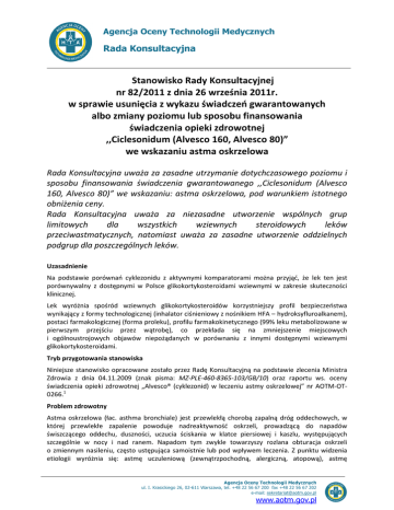 Agencja Oceny Technologii Medycznych Rada Konsultacyjna Stanowisko Rady Konsultacyjnej nr 82/2011 z dnia 26 września 2011r. w sprawie usunięcia z wykazu świadczeń gwarantowanych albo zmiany poziomu lub sposobu finansowania świadczenia opieki zdrowotnej ,,Ciclesonidum (Alvesco 160, Alvesco 80)” we wskazaniu astma oskrzelowa Rada Konsultacyjna uważa za zasadne utrzymanie dotychczasowego poziomu i sposobu finansowania świadczenia gwarantowanego ,,Ciclesonidum (Alvesco 160, Alvesco 80)” we wskazaniu: astma oskrzelowa, pod warunkiem istotnego obniżenia ceny. Rada Konsultacyjna uważa za niezasadne utworzenie wspólnych grup limitowych dla wszystkich wziewnych steroidowych leków przeciwastmatycznych, natomiast uważa za zasadne utworzenie oddzielnych podgrup dla poszczególnych leków. Uzasadnienie Na podstawie porównań cyklezonidu z aktywnymi komparatorami można przyjąć, że lek ten jest porównywalny z dostępnymi w Polsce glikokortykosteroidami wziewnymi w zakresie skuteczności klinicznej. Lek wyróżnia spośród wziewnych glikokortykosteroidów korzystniejszy profil bezpieczeństwa wynikający z formy technologicznej (inhalator ciśnieniowy z nośnikiem HFA – hydroksyfluroalkanem), postaci farmakologicznej (forma proleku), profilu farmakokinetycznego (99% leku metabolizowane w pierwszym przejściu przez wątrobę), co przekłada się na zmniejszenie miejscowych i ogólnoustrojowych objawów niepożądanych w porównaniu z innymi dostępnymi wziewnymi glikokortykosteroidami. Tryb przygotowania stanowiska Niniejsze stanowisko opracowane zostało przez Radę Konsultacyjną na podstawie zlecenia Ministra Zdrowia z dnia 04.11.2009 (znak pisma: MZ-PLE-460-8365-103/GB/10) oraz raportu ws. oceny świadczenia opieki zdrowotnej „Alvesco® (cyklezonid) w leczeniu astmy oskrzelowej” nr AOTM-OT0266.1 Problem zdrowotny Astma oskrzelowa (łac. asthma bronchiale) jest przewlekłą chorobą zapalną dróg oddechowych, w której przewlekłe zapalenie powoduje nadreaktywność oskrzeli, prowadzącą do napadów świszczącego oddechu, duszności, uczucia ściskania w klatce piersiowej i kaszlu, występujących szczególnie w nocy i nad ranem. Napadom tym zwykle towarzyszy rozlana obturacja oskrzeli o zmiennym nasileniu, często ustępująca samoistnie lub pod wpływem leczenia. Z punktu widzenia etiologii wyróżnia się: astmę uczuleniową (zewnątrzpochodną, alergiczną, atopową), astmę Agencja Oceny Technologii Medycznych ul. I. Krasickiego 26, 02-611 Warszawa, tel. +48 22 56 67 200 fax +48 22 56 67 202 e-mail: [email protected] www.aotm.gov.pl Stanowisko Rady Konsultacyjnej AOTM nr 82/2011 z dnia 26 września 2011 r. nieuczuleniową (wewnątrzpochodną, niealergiczną, nieatopową), postaci mieszane z komponentą zarówno uczuleniową, jak i niealergiczną.2,3 Czynniki ryzyka astmy można podzielić na osobnicze (wytwarzanie nadmiernej ilości przeciwciał klasy IgE, nadreaktywność oskrzeli, rasa czarna, płeć żeńska u dorosłych i męska u dzieci) oraz środowiskowe (alergeny, dieta, dym tytoniowy, status społeczny i ekonomiczny, zakażenia wirusowe i bakteryjne).2,3 Objawy kliniczne mają zmienny charakter i są to: duszność głównie wydechowa o charakterze napadowym, najczęściej nad ranem, duszność odczuwana jako ucisk w klatce piersiowej, świszczący oddech, suchy kaszel. W okresie objawowym stwierdza się: świsty (rozlane, obustronne, głównie wydechowe), furczenia, wydłużony wydech.2,3 W przebiegu astmy dochodzi do zaostrzeń, które mogą się rozwijać stopniowo lub gwałtownie. Przyczyną jest najczęściej zakażenie układu oddechowego lub niepowodzenie dotychczasowej terapii, a odpowiedź na leczenie jest powolna. W drugim przypadku objawy rozwijają się szybko (napady astmy), a odpowiedź na leczenie jest zwykle szybsza. Zaostrzenie może mieć charakter łagodny, umiarkowany lub ciężki, a nieleczone może doprowadzić do śmierci. Wieloletnia źle leczona astma z czasem prowadzi do postępującego, nieodwracalnego ograniczenia przepływu powietrza. Astma jest jedną z najczęstszych przewlekłych chorób układu oddechowego. Chorobowość w dorosłej populacji Polski szacuje się na 5,4%. Częściej chorują kobiety. Każdego roku z powodu astmy umiera w Polsce około 1500 osób.2 Obecna standardowa terapia Astmy nie można wyleczyć, ale prawidłowe leczenie na ogół pozwala kontrolować chorobę. W leczeniu astmy ważną rolę odgrywa edukacja chorego, która powinna obejmować informacje dotyczące: rozpoznania i istoty choroby; dostępnych metod leczenia, z uwzględnieniem podziału na leki kontrolujące przebieg choroby i przyjmowane doraźnie, techniki przyjmowania leków wziewnych, możliwych skutków ubocznych leczenia; metod zmniejszenia narażenia na czynniki powodujące napady astmy; monitorowania kontroli choroby, metod postepowania w razie pogorszenia kontroli astmy i zaostrzeń choroby (w tym informacje, kiedy należy szukać pomocy medycznej).2 W przewlekłym leczeniu astmy stosuje się:2,3 • Leki kontrolujące astmę - leki przyjmowane regularnie, codziennie, pozwalające uzyskać i utrzymywać kontrolę astmy przewlekłej głównie dzięki działaniu przeciwzapalnemu. Do tej kategorii zaliczane są glikokortykosteroidy podawane wziewnie lub ogólnoustrojowo, leki przeciwleukotrienowe, długo działające β2-mimetyki wziewne w połączeniu z glikokortykosteroidami wziewnymi, teofilina o przedłużonym uwalnianiu, kromony oraz przeciwciała anty-IgE. Najskuteczniejsze w tej grupie są glikokortykosteroidy wziewne. • Leki przyjmowane doraźnie (objawowe), tak zwane terapie ratunkowe astmy – stosowane w razie potrzeby, w celu szybkiego zniesienia skurczu oskrzeli i jego objawów podmiotowych. Są to: szybko działające beta2-mimetyki wziewne lub doustne, wziewne leki przeciwcholinergiczne, krótko działające preparaty teofiliny. Większość podstawowych leków stosuje się wziewnie za pomocą różnego typu inhalato
