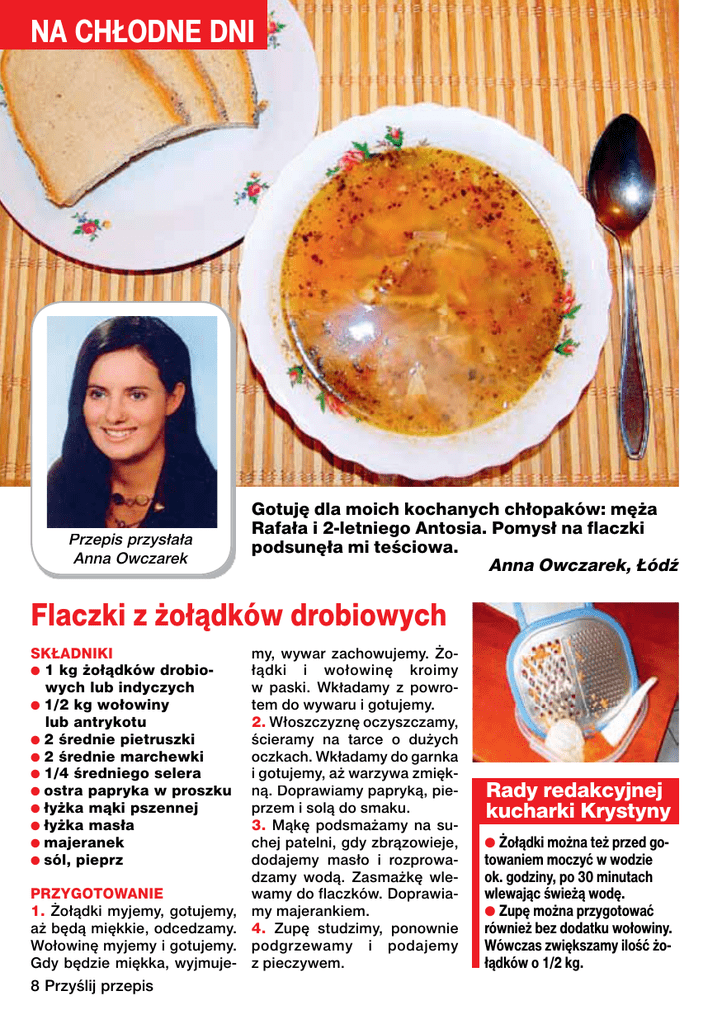 NA CHŁODNE DNI Przepis przysłała Anna Owczarek Gotuję dla moich kochanych chłopaków: męża Rafała i 2-letniego Antosia. Pomysł na flaczki podsunęła mi teściowa. Anna Owczarek, Łódź Flaczki z żołądków drobiowych my, wywar zachowujemy. Żołądki i wołowinę kroimy w paski. Wkładamy z powrotem do wywaru i gotujemy. 2. Włoszczyznę oczyszczamy, ścieramy na tarce o dużych oczkach. Wkładamy do garnka i gotujemy, aż warzywa zmiękną. Doprawiamy papryką, pieprzem i solą do smaku. 3. Mąkę podsmażamy na suchej patelni, gdy zbrązowieje, dodajemy masło i rozprowadzamy wodą. Zasmażkę wlePRZYGOTOWANIE wamy do flaczków. Doprawia1. Żołądki myjemy, gotujemy, my majerankiem. aż będą miękkie, odcedzamy. 4. Zupę studzimy, ponownie Wołowinę myjemy i gotujemy. podgrzewamy i podajemy Gdy będzie miękka, wyjmuje- z pieczywem. SKŁADNIKI ● 1 kg żołądków drobiowych lub indyczych ● 1/2 kg wołowiny lub antrykotu ● 2 średnie pietruszki ● 2 średnie marchewki ● 1/4 średniego selera ● ostra papryka w proszku ● łyżka mąki pszennej ● łyżka masła ● majeranek ● sól, pieprz 8 Przyślij przepis Rady redakcyjnej kucharki Krystyny ● Żołądki można też przed go- towaniem moczyć w wodzie ok. godziny, po 30 minutach wlewając świeżą wodę. ● Zupę można przygotować również bez dodatku wołowiny. Wówczas zwiększamy ilość żołądków o 1/2 kg.
