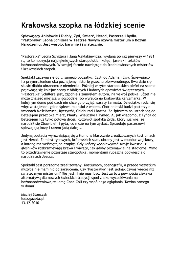 Krakowska szopka na łódzkiej scenie Śpiewający Aniołowie i Diabły, Żyd, Śmierć, Herod, Pasterze i Bydło. "Pastorałka" Leona Schillera w Teatrze Nowym ożywia misterium o Bożym Narodzeniu. Jest wesoło, barwnie i świątecznie. "Pastorałka" Leona Schillera i Jana Maklakiewicza, wydana po raz pierwszy w 1931 r., to kompozycja najpiękniejszych staropolskich kolęd, jasełek i tekstów bożonarodzeniowych. W swojej formie nawiązuje do średniowiecznych misteriów i krakowskich szopek. Spektakl zaczyna się od... samego początku. Czyli od Adama i Ewy. Śpiewająco i z przymrużeniem oka poznajemy historię grzechu pierworodnego. Ewa daje się skusić diabłu ubranemu z niemiecka. Później w rytm staropolskich pieśni na scenie pojawiają się kolejne sceny z biblijnych i ludowych opowieści świątecznych. "Pastorałka" Schillera jest, zgodnie z zamysłem autora, na wskroś polska. Józef nie może znaleźć miejsca w gospodzie, bo wyrzuca go krakowska karczmarka. W kolejnym domu pod dach nie chce go przyjąć wąsaty Sarmata. Dzieciątko rodzi się więc w stajence, gdzie śpiewa mu osioł z wołem. Chór anielski budzi pasterzy o imionach Maścibrzuch, Ryczywół, Chleburad i Bartos. Ze śpiewem na ustach idą do Betelejem przez Skalmierz, Planty, Wieliczkę i Tyniec. A, jak wiadomo, z Tyńca do Betelejem już tylko połowa drogi. Ryczywół spotyka Żyda, który już wie, że narodził się Zbawiciel, i pyta, co może na tym zyskać. Sprzedaje pasterzowi śpiewającą kozę i razem jadą dalej... Jedyną postacią wyróżniającą się z tłumu w klasycznie zrealizowanych kostiumach jest Herod. Zamiast typowych, królewskich szat, ubrany jest w mundur wojskowy, a koronę ma wciśniętą na czapkę. Gdy kończy wyśpiewywać swoje kwestie, z głośników rozbrzmiewają brawa i wiwaty, jak gdyby przemawiał na stadionie. Mimo to przedstawienie pozostaje staropolską, momentami rubaszną opowieścią o narodzinach Jezusa. Spektakl jest porządnie zrealizowany. Kostiumom, scenografii, a przede wszystkim muzyce nie mam nic do zarzucenia. Czy "Pastorałka" jest jednak czymś więcej niż świątecznym misterium? Nie jest. I nie musi być. Jest za to z pewnością ciekawą alternatywą dla nowych świeckich tradycji spod znaku wyczekiwania na bożonarodzeniową reklamę Coca-Coli czy wspólnego oglądania "Kevina samego w domu". Maciej Stańczyk lodz.gazeta.pl 13.12.2010
