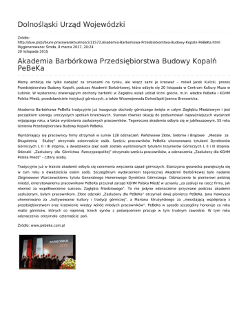 Dolnośląski Urząd Wojewódzki Źródło: http://duw.pl/pl/biuro-prasowe/aktualnosci/11572,Akademia-Barborkowa-Przedsiebiorstwa-Budowy-Kopaln-PeBeKa.html Wygenerowano: Środa, 8 marca 2017, 20:24 20 listopada 2015 Akademia Barbórkowa Przedsiębiorstwa Budowy Kopalń PeBeKa Mamy ambicję nie tylko nadążać za zmianami na rynku, ale wręcz sami je kreować – mówił Jacek Kulicki, prezes Przedsiębiorstwa Budowy Kopalń, podczas Akademii Barbórkowej, która odbyła się 20 listopada w Centrum Kultury Muza w Lubinie. W wydarzeniu otwierającym obchody barbórki w Zagłębiu wzięli udział liczni goście, m.in. władze PeBeKa i KGHM Polska Miedź, przedstawiciele instytucji górniczych, a także Wicewojewoda Dolnośląski Joanna Bronowicka. Akademia Barbórkowa PeBeKa tradycyjnie już inauguruje obchody górniczego święta w całym Zagłębiu Miedziowym i jest początkiem szeregu uroczystych spotkań branżowych. Stanowi również okazję do podsumowań najważniejszych wydarzeń mijającego roku, a także wyróżniania zasłużonych pracowników. Tegoroczna akademia odbyła się w jubileuszowym, 55 roku istnienia Przedsiębiorstwa Budowy Kopalń PeBeKa. Wyróżniający się pracownicy firmy otrzymali w sumie 128 odznaczeń. Państwowe Złote, Srebrne i Brązowe „Medale za Długoletnią Służbę” otrzymało osiemnaście osób. Sześciu pracowników PeBeKa uhonorowano tytułami Dyrektorów Górniczych I, II i III stopnia, a dwadzieścia pięć osób zostało wyróżnionych tytułami Inżynierów Górniczych I, II i III stopnia. Odznaki „Zasłużony dla Górnictwa Rzeczypospolitej” otrzymało sześciu pracowników, a odznaczenia „Zasłużony dla KGHM Polska Miedź” - cztery osoby. Tradycyjnie już w trakcie akademii odbyła się ceremonia wręczenia szpad górniczych. Starszyzna gwarecka powiększyła się w tym roku o dwadzieścia osiem osób. Szczególnym wydarzeniem tegorocznej Akademii Barbórkowej było nadanie Zbigniewowi Warczewskiemu tytułu Generalnego Honorowego Dyrektora Górniczego. Odznaczenie to pionierowi polskiej miedzi, emerytowanemu pracownikowi PeBeKa przyznał zarząd KGHM Polska Miedź w uznaniu „za zasługi na rzecz firmy, jak również za współtworzenie sukcesu Zagłębia Miedziowego”. To nie jedyne odznaczenie przyznane podczas akademii zasłużonym, byłym pracownikom. Złote odznaki „Zasłużony dla PeBeKa” otrzymali dwaj pionierzy PeBeKa. Jana Hawrysza uhonorowano za „kultywowanie kultury i tradycji górniczej”, a Mariana Strużyńskiego za „nieustającą współpracę z przedsiębiorstwem oraz krzewienie wiedzy wśród młodych pracowników”. PeBeKa w sposób szczególny honoruje co roku matki górników, których co najmniej trzech synów z poświęceniem pracuje w tym trudnym zawodzie. W tym roku odznaczenia otrzymało czternaście pań. Źródło: www.pebeka.com.pl Drukuj Generuj PDF Powiadom znajomego Wstecz liczba wejść: 650