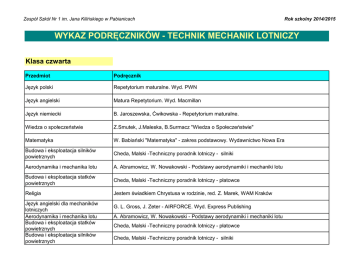 Zespół Szkół Nr 1 im. Jana Kilińskiego w Pabianicach Rok szkolny 2014/2015 WYKAZ PODRĘCZNIKÓW - TECHNIK MECHANIK LOTNICZY Klasa czwarta Przedmiot Podręcznik Język polski Repetytorium maturalne. Wyd. PWN Język angielski Matura Repetytorium. Wyd. Macmillan Język niemiecki B. Jaroszewska, Ćwikowska - Repetytorium maturalne. Wiedza o społeczeństwie Z.Smutek, J.Maleska, B.Surmacz "Wiedza o Społeczeństwie" Matematyka W. Babiański "Matematyka" - zakres podstawowy. Wydawnictwo Nowa Era Budowa i eksploatacja silników powietrznych Cheda, Malski -Techniczny poradnik lotniczy - silniki Aerodynamika i mechanika lotu A. Abramowicz, W. Nowakowski - Podstawy aerodynamiki i mechaniki lotu Budowa i eksploatacja statków powietrznych Cheda, Malski -Techniczny poradnik lotniczy - płatowce Religia Jestem świadkiem Chrystusa w rodzinie, red. Z. Marek, WAM Kraków Język angielski dla mechaników lotniczych Aerodynamika i mechanika lotu Budowa i eksploatacja statków powietrznych Budowa i eksploatacja silników powietrznych G. L. Gross, J. Zeter - AIRFORCE. Wyd. Express Publishing A. Abramowicz, W. Nowakowski - Podstawy aerodynamiki i mechaniki lotu Cheda, Malski -Techniczny poradnik lotniczy - płatowce Cheda, Malski -Techniczny poradnik lotniczy - silniki