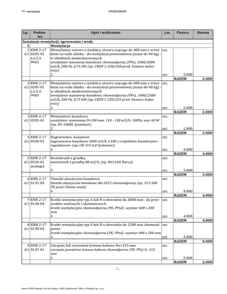 P1 wentylacja PRZEDMIAR Lp. PodstaOpis i wyliczenia j.m. wa Instalacje wentylacji, ogrzewania i wody 1 Wentylacja 1 KNR 2-17 Wentylatory osiowe o średnicy otworu ssącego do 400 mm z wirni- szt. d.1 0205-01 kiem na wale silnika - do wentylacji przewodowej (masa do 90 kg) z.o.3.3. w obiektach modernizowanych 9903 wentylator nawiewny kanałowy chemoodporny (PPs), 1000/2000 m3/h, 200 Pa, 0,75 kW (np. CRDV C-250/250 prod. Venture Industries) 2 szt. 2 KNR 2-17 d.1 0205-01 z.o.3.3. 9903 3 KNR 2-17 d.1 0205-01 4 KNR 2-17 d.1 0320-01 5 KNR 2-17 d.1 0320-01 analogia 6 KNR 2-17 d.1 0155-03 7 KNR 2-17 d.1 0138-04 8 KNR 2-17 d.1 0138-02 9 KNR 2-17 d.1 0147-01 Wentylatory osiowe o średnicy otworu ssącego do 400 mm z wirni- szt. kiem na wale silnika - do wentylacji przewodowej (masa do 90 kg) w obiektach modernizowanych wentylator wywiewny kanałowy chemoodporny (PPs), 1000/2500 m3/h, 200 Pa, 0,75 kW (np. CRDV C 250/225 prod. Venture Industries) 2 szt. Wentylatory kanałowe szt. wentylator wywiewny D=100 mm, 110 - 130 m3/h, 100Pa, moc 60 W (np. KV-100XL Systemair) 2 szt. Nagrzewnice kanałowe nagrzewnica kanałowa 1000 m3/h, 6 kW z czujnikiem kanałowym i regulatorem (np. CB-315-6,0 Systemair) 4 szt. szt. 3 szt. Tłumiki akustyczne kanałowe tłumiki akustyczne kanałowe dla d315 chemoodporny (np. 315-500 PE prod. Chemo-went) 4 szt. szt. Kratki wentylacyjne typ A lub N o obwodzie do 2000 mm - do prze- szt. wodów stalowych i aluminiowych kratki wentylacyjne chemoodporna (PE, PPsd) wymiar 600 x 200 mm 4 szt. Kratki wentylacyjne typ A lub N o obwodzie do 1200 mm chemood- szt. porne kratki wentylacyjne chemoodporne (PE, PPsd) wymiar 400 x 200 mm 4 szt. -1- Norma PRO Wersja 4.46 Nr seryjny: 8305 Użytkownik: PGK w Płońsku Sp. z o.o. Razem 2.000 RAZEM 2.000 2.000 RAZEM 2.000 2.000 RAZEM 2.000 4.000 RAZEM 4.000 3.000 RAZEM 3.000 4.000 RAZEM 4.000 4.000 RAZEM 4.000 4.000 RAZEM 4.000 2.000 RAZEM 2.000 szt. Nawietrzak z grzałką nawietrzak z grzałką 80 m3/h, (np. NG110A Darco) Czerpnie lub wyrzutnie ścienne kołowe Dn=315 mm czerpnie powietrza ścienne kołowe chemodporne (PE, PPs) śr. 315 mm 2 Poszcz. szt. szt. P1 wentylacja Podstawa 10 KNR 2-17 d.1 0147-01 PRZEDMIAR Lp. 11 KNR 2-17 d.1 0130-01 analogia Opis i wyliczenia Czerpnie lub wyrzutnie ścienne kołowe Dn=315 mm wyrzutnie powietrza ścienne kołowe chemodporne (PE, PPs) śr. 315 mm 2 j.m. Poszcz. Razem szt. szt. 2.000 RAZEM 2.000 3.000 RAZEM 3.000 7.000 RAZEM 7.000 3.000 RAZEM 3.000 36.000 RAZEM 36.000 24.000 RAZEM 24.000 32.000 RAZEM 32.000 Zawór wentylacyjny szt. zawór wentylacytjny 50-110 m3/h (np. CKK-100 Venture Industries) 3 szt. 12 KNR-W 2- Kanały wentylacyjne z rur PPs o śr. zewn. 315 mm d.1 18 0408- kanał wentyl. chemoodporny PPs o śr. zewn. 315 mm 05 analogia 7 m 13 KNR-W 2- Przewody wentylacyjne z blachy stalowej, kołowe, typ S (Spiro) o d.1 17 0122- śr. do 315 mm - udzial kształtek do 35 % 03 3 m2 14 KNR-W 2- Kanały wentylacyjne z rur PPs o śr. zewn. 250 mm d.1 18 0408- kanał wentyl. chemoodporny PPs o śr. zewn. 250 mm 04 36 m 15 KNR-W 2- Kształtki wentylacyjne chemoodporne PPs o śr. zewn. 315 mm d.1 18 0421- kolano wentylacyjne chemoodporne PPs o śr. zewn. 315 mm 05 zwężki wentylacyjne chemoodporne PPs o śr. zewn. 315 mm mufy wentylacyjne chemoodporne PPs o śr. zewn. 315 mm 24 szt 16 KNR-W 2- Kształtki wentylacyjne chemoodporne PPs o śr. zewn. 250 mm d.1 18 0421- kolano wentylacyjne chemoodporne PPs o śr. zewn. 250 mm 04 mufy wentylacyjne chemoodporne PPs o śr. zewn. 250 mm 32 szt -2- Norma PRO Wersja 4.46 Nr seryjny: 8305 Użytkownik: PGK w Płońsku Sp. z o.o. m m2 m szt szt