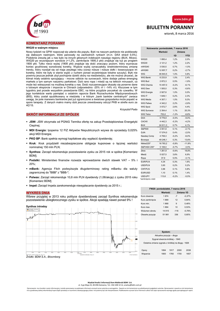 BIULETYN PORANNY wtorek, 8 marca 2016 KOMENTARZ PORANNY WIG20 w ważnym miejscu Notowania: poniedziałek, 7 marca 2016 Nowy tydzień na GPW rozpoczął się udanie dla popytu. Byki na naszym parkiecie nie poddawały się słabszym nastrojom, które panowały na zachodnich rynkach (m.in. DAX stracił 0,5%). Podobnie zresztą jak u nas było na innych głównych indeksach naszego regionu (BUX, Micex). WIG20 po wczorajszym wzroście (+1,2%, zamknięcie 1895,3 pkt) znajduje się tuż po progiem 1900 pkt. Tylko nieco wyżej (1908 pkt) znajduje się dość znaczący poziom, który wyznacza koniec grudniowej wzrostowej korekty. Wyjście wyżej oznaczałoby średnioterminową zmianę trendu, który rozwijał się od maja zeszłego roku (coraz niższe i niższe dołki i towarzyszące im korekty, które nie były w stanie wyjść z ruchem ponad wcześniejsze lokalne szczyty). Byki nie powinny jeszcze jednak zbyt pochopnie dzielić skóry na niedźwiedziu, ale nie można ukrywać, że klimat miały ostatnio sprzyjający - mocne odbicie na surowcach, które dodaje paliwa emerging markets a tym samym naszemu parkietowi. Dziś rano ropa i miedź są na lekkich minusach, co może też wskazywać na możliwą korektę u nas. Dość rozczarowujące okazały się poranne dane o lutowym eksporcie i imporcie w Chinach (odpowiednio -25% r/r i -14% r/r). Kluczowe w tym tygodniu jest przede wszystkim posiedzenie EBC, na które przyjdzie poczekać do czwartku. W jego kontekście warto pamiętać o ostatnim raporcie Bank Rozrachunków Międzynarodowych (BIS), który został opublikowany w niedzielę i w którym „bank banków centralnych” zwraca uwagę, że pole manewru bankierów jest już ograniczone a światowa gospodarka może popaść w spore tarapaty. Z danych makro mamy dziś jeszcze zrewidowany odczyt PKB w strefie euro za 4Q’15. Krzysztof Pado SKRÓT INFORMACJI ZE SPÓŁEK Wartość Zmiana 1D YTD 2,0% WIG20 1 895,4 1,2% WIG30 2 121,2 1,2% 2,2% mWIG40 3 530,5 0,7% -1,0% sWIG80 12 857,7 0,2% -2,7% WIG 46 843,5 1,0% 0,8% WIG Banki 6 233,9 1,0% 2,4% WIG Bud 2 872,3 0,5% -1,8% WIG Chemia 15 457,0 -0,2% -6,1% WIG Dew 1 505,0 0,3% -0,6% WIG Energia 2 927,6 1,0% 0,0% WIG IT 1 649,1 0,2% 2,3% WIG Media 4 307,1 1,0% 9,3% WIG Paliwa 4 342,2 2,2% -2,8% WIG Spoż 3 572,7 2,6% 4,4% WIG Surowce 2 354,4 1,1% 20,3% 753,0 -1,2% -6,8% DAX 9 778,9 -0,5% -9,0% JSW: JSW otrzymała od PGNiG Termika ofertę na zakup Przedsiębiorstwa Energetyki Cieplnej; CAC40 4 442,3 -0,3% -4,2% BUX 24 911,3 0,7% 4,1% MDI Energia: Ipopema 12 FIZ Aktywów Niepublicznych wzywa do sprzedaży 0,025% akcji MDI Energia; S&P500 2 001,8 0,1% -2,1% DJIA 17 074,0 0,4% -2,0% Nasdaq Comp 4 708,3 -0,2% -6,0% Bovespa 49 246,1 0,3% 13,6% Kruk: Kruk przydzielił niezabezpieczone obligacje kuponowe o łącznej wartości nominalnej 150 mln PLN; Nikkei225* 16 783,2 -0,8% -11,8% S&P/ASX 200* 5 108,0 -0,7% -3,5% Synthos: Zarząd rekomenduje pozostawienie zysku za 2015 rok w spółce [Komentarz BDM]; Złoto 1 261,9 -0,6% 18,8% Miedź 5 027,5 3,6% 6,9% Ropa 37,9 5,5% -3,1% EUR/PLN 4,34 0,3% 1,6% USD/PLN 3,93 0,2% 0,2% CHF/PLN 3,96 0,1% 0,8% EUR/USD 1,10 0,1% 1,4% USD/JPY 113,6 -0,2% -5,5% PKO BP: Bank spełnia wymogi kapitałowe aby wypłacić dywidendę; Podatki: Ministerstwo finansów rozważa wprowadzenie dwóch stawek VAT – 5% i 20%; mBank: Agencja Fitch podwyższyła długoterminowy rating mBanku dla waluty zagranicznej do "BBB" z "BBB-"; Polwax: Zarząd rekomenduje 10,8 mln PLN dywidendy (1,06/akcję) z zysku 2015 roku [Komentarz BDM]; WIG Telco *zamknięcie z dziś Impel: Zarząd Impela zarekomenduje niewypłacanie dywidendy za 2015 r.; FW20: poniedziałek, 7 marca 2016 Wartość WYKRES DNIA Wbrew przyjętej w 2013 roku polityce dywidendowej zarząd Synthos rekomenduje pozostawienie ubiegłorocznego zysku w spółce. Akcje spadają nawet ponad 9% ! Synthos intraday Zmiana 1D Kurs otwarcia 1 874 -7 -0,37% Kurs zamknięcia 1 889 12 0,64% Kurs min. 1 868 9 0,48% Kurs max. 1 894 10 0,53% Wolumen obrotu 14 815 -116 -0,78% Otwarte pozycje 51 981 336 0,65% System: Aktualna pozycja – długa Sygnał otwarcia krótkiej – 1840 Ostatnia zmiana sygnału z krótkiej na długą - 1826 Opory 1894 1917 2000 2038 Wsparcia 1800 1760 1700 1657 Źródło: BDM S.A., Bloomberg Wydział Analiz i Informacji Dom Maklerski BDM S.A. ul. 3-go Maja 23, 40-096 Katowice, Tel.: 032 208 14 12, [email protected] Opracowanie ma charakter czysto informacyjny i zostało opracowany na podstawie informacji uznanych przez autorów za wiarygodne . Zawarte w nim komentarze są subiektywnymi poglądami autorów. Opracowanie i zawarte w nim komentarze nie są podstawą żadnej rekomendacji kupna bądź sprzedaży w rozumieniu obowiązującego prawa i nie powinny być tak interpretowane. Publikowanie w prasie lub w Internecie całości lub części opracowania wymaga zgody sporządzających raport. BIULETYN PORANNY wtorek, 8 marca 2016 GPW PODSUMOWANIE FW20 (1,874.00, 1,894.00, 1,868.00, 1,889.00, +12.0000) Indeksy GPW 2200 2150 2100 2050 2000 1950 1900 1850 1800 1750 1700 1650 24 31 7 14 September 21 28 5 12 October 19 26 2 9 16 November 23 30 7 14 December 21 4 11 2016 18 25 1 8 15 February 22 29 7 March 14 21 WIG20 (1,874.03, 1,895.41, 1,868.64, 1,895.41, +21.9000) 2200 2150 2100 Open Low High Close WIG20 1 874,0 1 868,6 1 895,4 1 895,4 1,2% 552 WIG30 2 097,5 2 093,0 2 121,2 2 121,2 1,3% 608 mWIG40 3 515,8 12 817,2 12 890,6 3 530,5 0,7% 119 sWIG80 12 857,7 3 515,8 3 534,6 12 857,7 0,2% 42 WIG-PL 47 658,9 47 501,2 47 765,7 47 765,7 0,9% 682 WIG 46 468,0 46 399,3 46 843,5 46 843,5 1,0% 702 WIG20 Cena Mkt Cap Alior 63,14 1950 1900 1850 1800 1750 1700 1650 31 7 14 September 21 28 5 12 October 19 26 2 9 16 November 23 30 7 14 December 21 4 11 2016 18 25 1 8 15 February 22 29 7 March 14 21 KOMENTARZ POPOŁUDNIOWY 1900 coraz bliżej Nowy tydzień na GPW zaczęliśmy od wzrostów. WIG20 zyskał na wartości 1,1%, co było sporym osiągnięciem biorąc pod uwagę spadki w Europie Zachodniej. Obroty