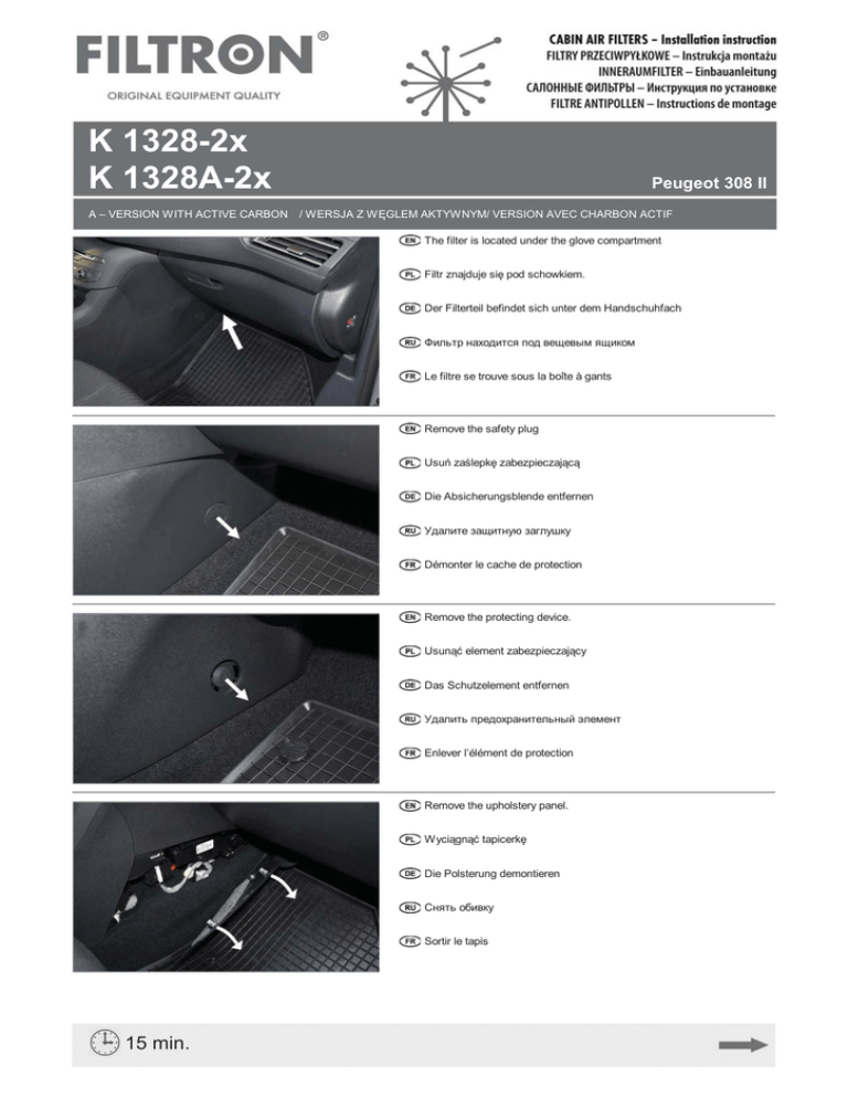 K 1328-2x K 1328A-2x A – VERSION WITH ACTIVE CARBON Peugeot 308 II / WERSJA Z W ĉGLEM AKTYWNYM/ VERSION AVEC CHARBON ACTIF The filter is located under the glove compartment Filtr znajduje siĊ pod schowkiem. Der Filterteil befindet sich unter dem Handschuhfach Ɏɢɥɶɬɪ ɧɚɯɨɞɢɬɫɹ ɩɨɞ ɜɟɳɟɜɵɦ ɹɳɢɤɨɦ Le filtre se trouve sous la boîte à gants Remove the safety plug UsuĔ zaĞlepkĊ zabezpieczającą Die Absicherungsblende entfernen ɍɞɚɥɢɬɟ ɡɚɳɢɬɧɭɸ ɡɚɝɥɭɲɤɭ Démonter le cache de protection Remove the protecting device. Usunąü element zabezpieczający Das Schutzelement entfernen ɍɞɚɥɢɬɶ ɩɪɟɞɨɯɪɚɧɢɬɟɥɶɧɵɣ ɷɥɟɦɟɧɬ Enlever l’élément de protection Remove the upholstery panel. Wyciągnąü tapicerkĊ Die Polsterung demontieren ɋɧɹɬɶ ɨɛɢɜɤɭ Sortir le tapis 15 min. K 1328-2x K 1328A-2x Detach the cover of the filter chamber Wypiąü pokrywĊ komory filtra Die Filterteilabdeckung abtrennen Oɬɫɬɟɝɧɭɬɶ ɤɪɵɲɤɭ ɤɚɦɟɪɵ ɮɢɥɶɬɪɚ Détacher le couvercle du compartiment du filtre Carefully remove the first filter, the second one will slide downwards. OstroĪnie usunąü pierwszy filtr, drugi filtr przesunie siĊ w dóá. Den ersten Filter vorsichtig entfernen, der andere wird sich nach unten schieben Ɉɫɬɨɪɨɠɧɨ ɭɞɚɥɢɬɶ ɩɟɪɜɵɣ ɮɢɥɶɬɪ, ɬɨɝɞɚ ɜɬɨɪɨɣ ɮɢɥɶɬɪ ɩɟɪɟɦɟɫɬɢɬɫɹ ɜɧɢɡ. Sortir doucement le premier filtre, le second filtre glissera vers le bas. Carefully remove the old filters, put in the new ones and perform the opposite to all the previous steps in the reversed order OstroĪnie usunąü zabrudzone filtry, nastĊpnie zamontowaü nowe oraz wykonaü powyĪsze czynnoĞci w kolejnoĞci odwrotnej Die verschmutzten Filter vorsichtig entfernen, die neue einlegen und die oben genannten Arbeitsschritte in umgekehrter Reihenfolge durchführen Ɉɫɬɨɪɨɠɧɨ ɫɧɢɦɢɬɟ ɝɪɹɡɧɵɣ ɮɢɥɶɬɪ, ɚ ɡɚɬɟɦ ɭɫɬɚɧɨɜɢɬɶ ɧɨɜɵɣ ɢ ɜɵɩɨɥɧɹɬɶ ɜɵɲɟɭɤɚɡɚɧɧɵɟ ɞɟɣɫɬɜɢɹ ɜ ɨɛɪɚɬɧɨɦ ɩɨɪɹɞɤɟ Enlever soigneusement les filtres usagés, y mettre de nouveaux filtres et effectuer les opérations mentionnées ci-dessus dans l'ordre inverse