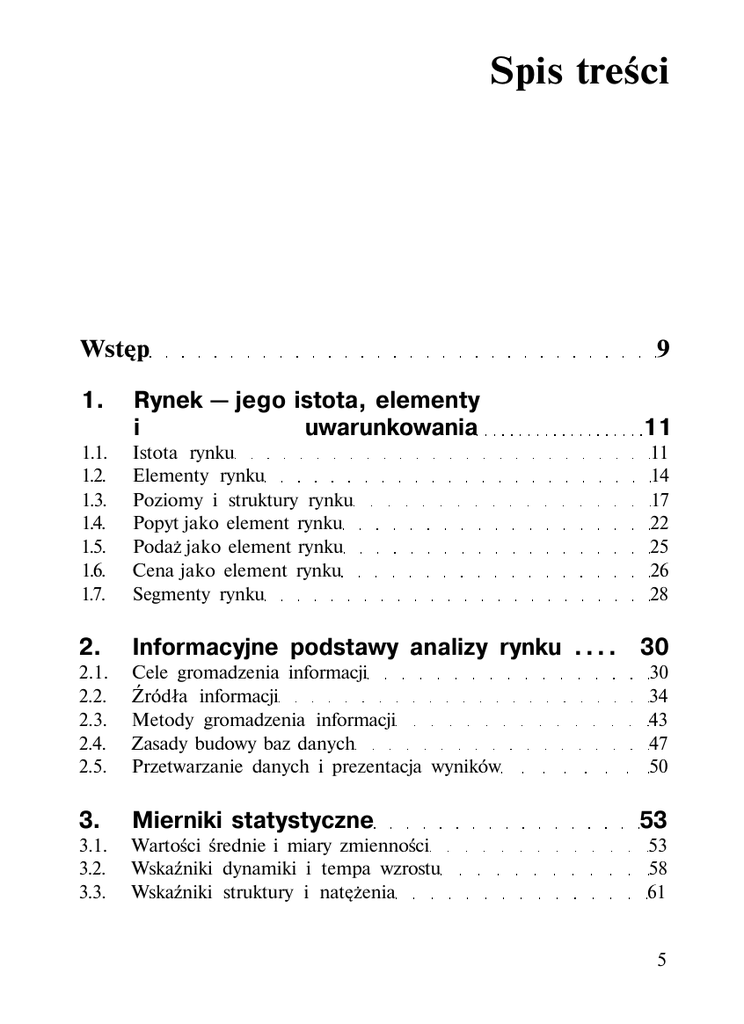 Spis treści Wstęp 1. 1.1. 1.2. 1.3. 1.4. 1.5. 1.6. 1.7. 2. 2.1. 2.2. 2.3. 2.4. 2.5. 3. 3.1. 3.2. 3.3. Rynek — jego istota, elementy i uwarunkowania Istota rynku Elementy rynku Poziomy i struktury rynku Popyt jako element rynku Podaż jako element rynku Cena jako element rynku Segmenty rynku 9 11 11 14 17 22 25 26 28 Informacyjne podstawy analizy rynku . . . . 30 Cele gromadzenia informacji Źródła informacji Metody gromadzenia informacji Zasady budowy baz danych Przetwarzanie danych i prezentacja wyników Mierniki statystyczne Wartości średnie i miary zmienności Wskaźniki dynamiki i tempa wzrostu Wskaźniki struktury i natężenia 30 34 43 47 50 53 53 58 61 5 4. 4.1. 4.2. 4.3. 4.3.1. 4.3.2. 4.3.3. 4.4. 4.5. 4.5.1. Analiza zjawisk rynkowych w c z a s i e Składniki procesów rozwojowych Metody wyodrębniania tendencji rozwojowych (trendów) Postaci funkcji trendu Funkcja liniowa Funkcje krzywoliniowe Trend (funkcja) segmentowy Ocena dopasowania trendu do wartości empirycznych . . . Prognozowanie Prognozowanie przy wykorzystaniu metody średnich ruchomych 4.5.2. Prognozowanie na podstawie funkcji trendu 4.5.3. Możliwości zastosowania metody ekstrapolacji trendu do prognozowania zjawisk rynkowych 5. Analiza sezonowości 6. Analiza związków przyczynowo-skutkowych 68 68 71 82 82 83 98 100 103 104 107 116 116 5.1. Istota wahań sezonowych 118 5.2. Metody wyodrębniania wahań sezonowych 119 5.3. Prognozowanie z uwzględnieniem wahań sezonowych . . . 130 5.4. Wykorzystanie arkusza kalkulacyjnego Microsoft Excel do analizy i prognozowania rozwoju zjawisk rynkowych w czasie 136 5.4.1. Wyznaczanie funkcji trendu 136 5.4.2. Analiza wahań sezonowych 143 6.1. 6.2. 6.3. 6.4. Istota związków przyczynowo-skutkowych Związki korelacyjne i analiza regresji Modele przyczynowo-skutkowe Prognozowanie zjawisk rynkowych na podstawie modeli przyczynowo-skutkowych 6.4.1. Prognozowanie na podstawie metod ilościowych 6.4.2. Prognozowanie na podstawie metod jakościowych 6.5. Analiza czynnikowa 6 145 145 146 153 160 160 162 165 7. 7.1. 7.2. 7.3. 7.4. 7.5. 7.6. Istota elastyczności Elastyczność dochodowa popytu Elastyczność cenowa popytu Nietypowe zależności między ceną a popytem Elastyczność mieszana popytu Elastyczność popytu a możliwości predykcji Elastyczność popytu 167 8. Analiza rynku w przestrzeni 198 8.1. 8.2. 8.3. 8.4. 8.4.1. 8.4.2. 8.5. 8.5.1. 8.5.2. Przestrzenne aspekty zjawisk rynkowych Prawo grawitacji detalu Reilly'ego Metody taksonomiczne Współczynniki zróżnicowania i koncentracji Współczynnik rozmieszczenia Florence'a Współczynnik koncentracji Lorenza Metoda standaryzacji cech (punktowa) i metoda rang . . . . Metoda standaryzacji cech (punktowa) Metoda rang 9. Metody analizy udziałów rynkowych i grup strategicznych 9.1. 9.2. 9.2.1. 9.2.2. 9.3. 9.4. 167 170 179 190 193 195 198 201 203 212 212 214 218 218 223 226 Analiza pojemności rynku 226 Analiza chłonności rynku 233 Analiza braków towarowych i popytu niezaspokojonego 233 Analiza popytu kształtującego się 237 Analiza udziałów rynkowych 239 Mapa grup strategicznych i analiza grupy strategicznej . . . 247 10. Metody analizy dystrybucji oraz intensywności reklamy 259 Zakończenie 276 Bibliografia 278 10.1. Numeryczne i ważone wskaźniki dystrybucji 10.2. Wskaźniki rotacji produktów 10.3. Metody badań intensywności reklamy 259 267 269