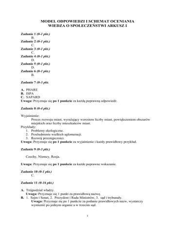 MODEL ODPOWIEDZI I SCHEMAT OCENIANIA WIEDZA O SPOŁECZEŃSTWI ARKUSZ I Zadanie 1 (0-1 pkt.) B. Zadanie 2 (0-1 pkt.) C. Zadanie 3 (0-1 pkt.) C. Zadanie 4 (0-1 pkt.) D. Zadanie 5 (0-1 pkt.) D. Zadanie 6 (0-1 pkt.) B. Zadanie 7 (0-3 pkt. A. PHARE B. ISPA C. SAPARD Uwaga: Przyznaje się po 1 punkcie za każdą poprawną odpowiedź. Zadanie 8 (0-4 pkt.) Wyjaśnienie: Proces rozwoju miast, wyrażający wzrostem liczby miast, powiększeniem obszarów miejskich oraz liczby mieszkańców miast. Przykłady: 1. Problemy ekologiczne. 2. Przeludnienie wielkich aglomeracji. 3. Rozwój przestępczości. Uwaga: Przyznaje się po 1 punkcie za wyjaśnienie i każdy prawidłowy przykład. Zadanie 9 (0-3 pkt.) Czechy, Niemcy, Rosja. Uwaga: Przyznaje się po 1 punkcie za każde poprawne wskazanie. Zadanie 10 (0-1 pkt.) C. Zadanie 11 (0-16 pkt.) A. Trójpodział władzy. Uwaga: Przyznaje się 1 punkt za prawidłową nazwę. B. 1. Sejm i Senat, 2. Prezydent i Rada Ministrów, 3. sąd i trybunały. Uwaga: Przyznaje się po 1 punkcie za podanie prawidłowych nazw, wystarczy wymienić po jednym organie a w trzecim sąd. 1 C. 1. Warunek (zasada) dobrowolności i równości. 2. Warunek (zasada) demokratycznego charakteru partii. Uwaga: Przyznaje się po 1 punkcie za podanie prawidłowych warunków. D. Np.: W demokratycznym kraju pracownicy mają prawo zakładania związków zawodowych, gwarantuje to konstytucja. Uwaga: Przyznaje się 1 punkt za prawidłowe wyjaśnienie. E. Np.: 1. Odwoływanie się do zasad nazizmu. 2. Odwoływanie się do zasad faszyzmu. 3. Odwoływanie się do zasad komunizmu. 4. Odwoływanie się do nienawiści rasowej. 5. Propagowanie przemocy w zdobyciu władzy. 6. Utajnienie działalności. Uwaga: Przyznaje się po 1 punkcie za podanie prawidłowych przypadków. F. Np.: Decentralizacja władzy publicznej - to przeniesienie części uprawnień władzy centralnej na organy niższych szczebli w określonych dziedzinach życia publicznego, ograniczenie lub zniesienie centralizacji. Uwaga: Przyznaje się 1 punkt za podanie poprawnej definicji. G. Np.: 1. Uwzględnienie więzi społecznych. 2. Zapewnienie zdolności wykonywania zadań jednostkom terytorialnym. Uwaga: Przyznaje się po 1 punkcie za podanie każdego z warunków. Zadanie 12 (0-10 pkt.) A. 1. Litwa. 2. Słowacja. 3. Czechy. Uwaga: Przyznaje się po 1 punkcie za podanie prawidłowej nazwy każdego z państw. B. 1. Rosja. 2. Białoruś. 3. Ukraina. Uwaga: Przyznaje się po 1 punkcie za podanie prawidłowej nazwy każdego z państw. C. – Np.: Rozbudowa sieci autostrad zwiększy: - atrakcyjność komunikacyjną Polski, - ruchu turystyczny, - zaktywizuje kontakty gospodarcze. Uwaga: Przyznaje się po 1 punkcie za każdy logiczny argument (max 3 pkt.).. D. Zdający powinien podać argument uzasadniający rozwój polskiej gospodarki pod wpływem rozbudowy sieci autostrad w kraju. Uwaga: Przyznaje się 1 punkt. 2 Zadanie 13 (0-5 pkt.) Prawidłowo uzupełniony tekst. Prezydent Rosji Władymir Putin po zamachu terrorystycznym w Biesłanie 1 września 2004 roku, zapowiedział wzmocnienie władzy w państwie. Może to oznaczać ograniczenie lub zahamowanie demokratycznych reform w Rosji. Do zorganizowania zamachu przyznał się przywódca czeczeńskich terrorystów Szamil Basajew, który akt terroru uzasadnił walką o niepodległość Kaukazu (Czeczenii). Zamach został potępiony przez międzynarodową opinię publiczną, głównie za to, że jego ofiarami były dzieci, a obiektem szkoła, w której doszło do masakry. Uwaga: Przyznaje się 1 punkt za trzy prawidłowe uzupełnienia zdań w tekście, 2 punkty za cztery, 3 punkty za pięć, 4 punkty za sześć, 5 punktów za prawidłowe uzupełnienie tekstu. Zadanie 14 (0-2 pkt.) A. Ponieważ większość społeczeństwa posiada zbyt niskie dochody, a dochodzenie do bogactwa w Polsce jest wynikiem układów i często łamania prawa, a nie efektem uczciwej ciężkiej pracy i posiadanych umiejętności. B. W społeczeństwie obywatelski i państwie prawa praca i umiejętności powinny decydować o bogactwie i poziomie życia, ponieważ ta droga zapewniałaby stabilizację obywatelowi i systematyczny rozwój państwu. Uwaga: Przyznaje się po 1 punkcie za prawidłowe wyjaśnienia. Zadanie 15 (0-15 pkt.) A. PKB w latach 2003 i 2004 systematycznie rósł. W I i II kwartale 2004 roku osiągnął bardzo wysoki poziom, ponad 6%, co świadczy o dynamicznym rozwoju polskiej gospodarki. Uwaga: Przyznaje się 1 punkt za prawidłowe wyjaśnienie. B. Dynamiczny okres rozwoju nastąpił od marca (III) do czerwca (VI) 2004 roku. Uwaga: Przyznaje się 1 punkt za prawidłowe wskazanie. C. Wzrastający współczynnik inwestycji, informuje o pojawieniu się nowych miejsc pracy, to w konsekwencji może doprowadzić do zmniejszenia bezrobocia w Polsce. gdy wzrasta, może w istotny sposób wpłynąć na spadek bezrobocia w Polsce. Uwaga: Przyznaje się 1 punkt za prawidłowe wskazanie współczynnika i 1 punkt za wyjaśnienie jego wpływu na bezrobocie w Polsce. D. Np.: 1. Wzrastający PKB świadczy o dobrej koniunkturze w gospodarce. 2. Wzrastająca konsumpcja podkreśla dobrą sytuację materialną obywateli. 3. Inwestycje potwierdzają rozwój i stabilizację gospodarczą. 4. Eksport wzmacnia budżet. Uwaga: Przyznaje się 1 punkt za każdy prawidłowy wniosek. 3 E. 1. PKB. 2. Wzrost inwestycji. 3. Wzrost eksportu. 4. Konsumpcja indywidualna. Uwaga: Przyznaje się po 1 punkcie za prawidłowe mieszczenie wskaźników. F. W I kwartale 2003 roku. Uwaga: Przyznaje się 1 punkt za prawidłowe wskazanie. G. PKB wzrósł o 6,3% Uwaga: Przyznaje się 1 punkt za prawidłowe wskazanie. H. Np.: PKB - to jeden z wskaźników ilustrujących stan gospodarki danego kraju. Uwaga: Przyznaje się 1 punkt za prawidłową definicję. Zadanie 16 (0-15 pkt.) Do oceny listu należy zastosować następujące kryteria: 1. 2. 3. 4. 5. 6. 7. Zastosowanie formalnych wyróżników listu (data, zwrot do adresata, podpis) Jasno sformułowane sta