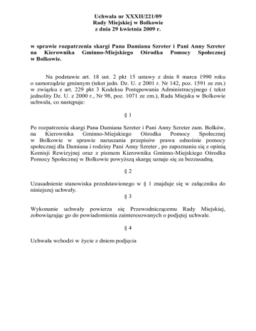 Uchwała nr XXXII/221/09 Rady Miejskiej w Bolkowie z dnia 29 kwietnia 2009 r. w sprawie rozpatrzenia skargi Pana Damiana Szreter i Pani Anny Szreter na Kierownika Gminno-Miejskiego Ośrodka Pomocy Społecznej w Bolkowie. Na podstawie art. 18 ust. 2 pkt 15 ustawy z dnia 8 marca 1990 roku o samorządzie gminnym (tekst jedn. Dz. U. z 2001 r. Nr 142, poz. 1591 ze zm.) w związku z art. 229 pkt 3 Kodeksu Postępowania Administracyjnego ( tekst jednolity Dz. U. z 2000 r., Nr 98, poz. 1071 ze zm.), Rada Miejska w Bolkowie uchwala, co następuje: §1 Po rozpatrzeniu skargi Pana Damiana Szreter i Pani Anny Szreter zam. Bolków, na Kierownika Gminno-Miejskiego Ośrodka Pomocy Społecznej w Bolkowie w sprawie naruszania przepisów prawa odnośnie pomocy społecznej dla Damiana i rodziny Pani Anny Szreter , po zapoznaniu się z opinią Komisji Rewizyjnej oraz z pismem Kierownika Gminno-Miejskiego Ośrodka Pomocy Społecznej w Bolkowie powyższą skargę uznaje się za bezzasadną. §2 Uzasadnienie stanowiska przedstawionego w § 1 znajduje się w załączniku do niniejszej uchwały. §3 Wykonanie uchwały powierza się Przewodniczącemu Rady Miejskiej, zobowiązując go do powiadomienia zainteresowanych o podjętej uchwale. §4 Uchwała wchodzi w życie z dniem podjęcia Załącznik do Uchwały nr XXXII/221/09 Rady Miejskiej w Bolkowie z dnia 29 kwietnia 2009 r. UZASADNIENIE W dniu 23 marca 2009 r. do Rady Miejskiej w Bolkowie Burmistrza Bolkowa pismem SGM.0561-03/09 z dnia 19 marca 2009 r. przekazał skargę Pana Damiana Szreter i Pani Anny Szreter z dnia 18 marca 2009 r. na Kierownika Gminno-Miejskiego Ośrodka Pomocy Społecznej w Bolkowie w sprawie naruszania przepisów prawa odnośnie pomocy społecznej dla Damiana i rodziny Pani Anny Szreter. Zgodnie z art. 229 pkt. 3 ustawy z dnia 14 czerwca 1960 r. kodeksu postępowania administracyjnego organem właściwym do rozpatrzenia skargi na kierownika gminnej jednostki organizacyjnej jest rada gminy, dlatego też pismem RM.0561-2/09 z dnia 23 marca 2009 r. wystąpiono do Kierownika Gminno-Miejskiego Ośrodka Pomocy Społecznej w Bolkowie o złożenie wyjaśnienia na sprawy w skardze zawarte. Komisja Rewizyjna zgodnie z § 20 pkt. 4 statutu Gminy Bolków uchwalonym Uchwałą nr XI/51/03 z dnia 27 czerwca 2003 r. na posiedzeniu w dniu 10 kwietnia 2009 r. zapoznała się z treścią skargi i udzielonymi wyjaśnieniami przez Kierownika GminnoMiejskiego Ośrodka Pomocy Społecznej w Bolkowie w piśmie GMOPS-11101/03/09 z dnia 26 marca 2009 r. Komisja przeprowadziła analizę zgromadzonych w sprawie dokumentów oraz dokumentów udostępnionych przez Panią Wiesławę Graszkiewicz, tj. - wniosek Damiana Szretera z dnia 9 marca 2009 r. złożony do Ośrodka Pomocy Społecznej w Bolkowie o zasiłek stały z orzeczeniem o stopniu niepełnosprawności, - odpowiedź na wniosek udzieloną pismem z dnia 16 marca 2009 r. wraz ze zwrotem wniosku, orzeczeniem o stopniu niepełnosprawności i zaświadczeniem z Powiatowego Urzędu Pracy. Ponadto Damian Szreter w w/w piśmie został poinformowany o złożeniu przedmiotowego wniosku do Zakładu Ubezpieczeń Społecznych w Jaworze z uwagi na orzeczenie niepełnosprawności od wczesnego dzieciństwa. Komisja ustaliła, że zgodnie z art. 2 ustawy z dnia 12 marca 2004 r. o pomocy społecznej ( tekst jednolity Dz. U. nr 115 z 2008 r. poz. 728) pomoc społeczna ma na celu umożliwienie osobom i rodzinom przezwyciężenie trudnych sytuacji życiowych wykorzystując w pierwszej kolejności własne uprawnienia, zasoby i możliwości. Uprawnieniem takim jest orzeczenie o niepełnosprawności Damiana od wczesnego dzieciństwa, na podstawie którego powinien ubiegać się o rentę socjalną w Zakładzie Ubezpieczeń Społecznych w Jaworze, w wyższej wysokości niż zasiłek stały, o który wnioskował. Kierownik udostępniła również Decyzję 000132/ZP/03/2009 z dnia 31 marca 2009 r. wydaną na wniosek Pana Damiana Szreter z dnia 13 marca 2009 r. o przyznaniu zasiłku pielęgnacyjnego na okres od 1 stycznia 2009 r. do 31 marca 2009 r., tj. na czas orzeczonej niepełnosprawności przez Powiatowy Zespół ds. Orzekania o Niepełnosprawności w Legnicy, Decyzję 01-000539/02/09 z dnia 20 lutego 2009 r. wydaną na wniosek Pani Anny Szreter z dnia 18 lutego 2009 r. o przyznaniu świadczeń z pomocy społecznej w formie zasiłku okresowego z powodu bezrobocia, na okres od 1 lutego do 30 kwietnia br. Komisja po zapoznaniu się z odpowiedzią Kierownika Gminno-Miejskiego Ośrodka Pomocy Społecznej udzieloną pismem GMOPS-1101/03/09 z dnia 26 marca 2009 r. oraz po wysłuchaniu wyjaśnień złożonych przez Kierownika Ośrodka Pomocy i po wysłuchaniu wyjaśnień Pani Anny Szreter stwierdziła, że Pani Anna Szreter i jej mąż Joachim Szreter są osobami w wieku aktywności zawodowej, bezrobotni bez prawa do zasiłku, ale w sposób nieuzasadniony odmawiają podjęcia prac społecznie użytecznych. Zgodnie z art. 11 ustawy o pomocy społecznej odmowa podjęcia pracy i braku współpracy z pracownikiem socjalnym w rozwiązaniu trudnej sytuacji życiowej może być podstawą do odmowy przyznania świadczeń pieniężnych z pomocy społecznej. W związku z powyższym Komisja jednogłośnie przy 5 głosach za, uznała skargę Pana Damiana Szreter i Pani Anny Szreter na Kierownika Gminno-Miejskiego Ośrodka Pomocy Społecznej w Bolkowie w sprawie naruszania przepisów prawa odnośnie pomocy społecznej dla Damiana i rodziny Pani Anny Szreter za bezzasadną. Rada Miejska po zapoznaniu się z pismem Kierownika Gminno-Miejskiego Ośrodka Pomocy Społecznej w Bolkowie GMOP-1101/03/09 z dnia 26 marca 2009 r., oraz ze stanowiskiem Komisji Rewizyjnej uznała skargę na Kierownika Gminno-Miejskiego Ośrodka Pomocy Społecznej w Bolkowie w sprawie naruszania przepisów prawa odnośnie pomocy społecznej dla Damiana i rodziny Pani Anny Szreter za bezzasadną.