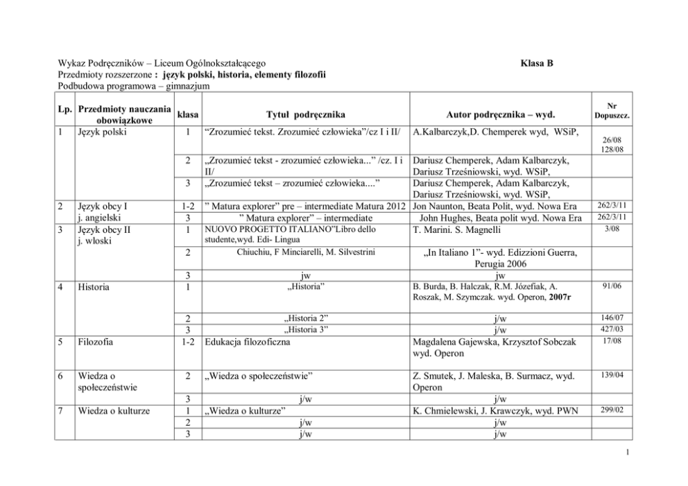 Wykaz Podręczników – Liceum Ogólnokształcącego Przedmioty rozszerzone : język polski, historia, elementy filozofii Podbudowa programowa – gimnazjum Lp. Przedmioty nauczania klasa Tytuł podręcznika obowiązkowe 1 Język polski 1 “Zrozumieć tekst. Zrozumieć człowieka”/cz I i II/ 2 3 2 3 Język obcy I j. angielski Język obcy II j. wloski 1-2 3 1 2 Historia 3 1 5 Filozofia 2 3 1-2 6 Wiedza o społeczeństwie 7 Wiedza o kulturze 4 2 3 1 2 3 Klasa B Autor podręcznika – wyd. A.Kalbarczyk,D. Chemperek wyd, WSiP, Dariusz Chemperek, Adam Kalbarczyk, Dariusz Trześniowski, wyd. WSiP, Dariusz Chemperek, Adam Kalbarczyk, Dariusz Trześniowski, wyd. WSiP, ” Matura explorer” pre – intermediate Matura 2012 Jon Naunton, Beata Polit, wyd. Nowa Era ” Matura explorer” – intermediate John Hughes, Beata polit wyd. Nowa Era NUOVO PROGETTO ITALIANO”Libro dello T. Marini. S. Magnelli Nr Dopuszcz. 26/08 128/08 „Zrozumieć tekst - zrozumieć człowieka...” /cz. I i II/ „Zrozumieć tekst – zrozumieć człowieka....” studente,wyd. Edi- Lingua Chiuchiu, F Minciarelli, M. Silvestrini jw 262/3/11 262/3/11 3/08 „In Italiano 1”- wyd. Edizzioni Guerra, Perugia 2006 jw „Historia” B. Burda, B. Halczak, R.M. Józefiak, A. Roszak, M. Szymczak. wyd. Operon, 2007r 91/06 „Historia 2” „Historia 3” j/w j/w Magdalena Gajewska, Krzysztof Sobczak wyd. Operon 146/07 427/03 17/08 Z. Smutek, J. Maleska, B. Surmacz, wyd. Operon j/w K. Chmielewski, J. Krawczyk, wyd. PWN j/w j/w 139/04 Edukacja filozoficzna „Wiedza o społeczeństwie” j/w „Wiedza o kulturze” j/w j/w 299/02 1 Matematyka 1-2 8 3 Podręcznik "Matematyka w otaczającym nas świecie". zakres podstawowy. "Zbiór zadań dla klasy.” Matematyka w otaczającym nas świecie. Kształcenie w zakresie podstawowym ”Matematyka Krok po kroku Podręcznik dla klasy II, liceum ogólnokształcącego , liceum profilowanego, technikum [ zakres podstawowy] ”Matematyka krok po kroku Zbiór zadań dla klasy II, liceum ogólnokształcącego, liceum profilowanego, technikum [zakres podstawowy]„ 9 10 11 Fizyka i astronomia Chemia Biologia 1 2 3 1 Alicja Cewe, Małgorzata Krawczyk, Maria Kruk, Halina Nahorska, Irena Pancer, Renata Ropela; Wydawnictwo Podkowa j/w R. Pawlak, H. Pawlak, A. Rychlewicz, A. Rychlewicz, K. Żylak – wyd. RES POLONA M. Fiałkowska, K. Fiałkowski, B. Sagnowska, wyd. ZamKor „Chemia. Kształcenie w zakresie podstawowym. Podręcznik dla liceum ogólnokształcącego, liceum profilowanego i technikum” „Zbiór zadań z chemii. Zakres podstawowy” M. Późniaczek, Z. Kluz wydawnictwo – wyd. WSIP j/w j/w „Biologia część I. Zakres podstawowy” 2 „Biologia część II. Zakres podstawowy” 90/80 211/03 j/w ”Fizyka dla szkół ponadgimnazjalnych - zakres podstawowy” j/w j/w 2 3 1 90/80 46/02 j/w j/w Pazdro wydawnictwo WYDAWNICTWO PAZDRO 16/05 j/w j/w A. Kornaś, wydawnictwo NOWA ERA 225/02 j/w 25/03 3 12 Geografia j/w 2 ”Geografia część I. Zakres podstawowy 3 ”Geografia część II. Zakres podstawowy j/w J. Kop, M. Kucharska, E. Szkurłat wydawnictwo PWN j/w 37/06 53/03 2 13 Podstawy przedsiębiorczości 1 „Przedsiębiorczość bez tajemnic” Zeszyt ćwiczeń 14 15 16 Technologia informacyjna Wychowanie fiz Przysposobienie obronne 17 18 Godz. z wychowawcą Religia 19 Wych. do życia w rodz. 1 „Technologia informacyjna” 1 1 -„Przysposobienie obronne” Sylwester Gregorczyk, Maria Romanowska, Agnieszka Sopińska, Piotr Wachowiak wyd.WSiP Warszawa 2008 Sylwester Gregorczyk, Maria Romanowska, Agnieszka Sopińska, Piotr Wachowiak wyd.WSiP Warszawa 2008 96/07 96/07 Podręcznik do uzgodnienia z nauczycielem w m-cu wrześniu -Breitkopf, Warwa, Marciniak – wyd.. WSiP 23/07 2 1 1 2 3 1-3 j/w -„Jestem Świadkiem Chrystusa w Kościele” „Jestem Świadkiem Chrystusa w Świecie” „Jestem Świadkiem Chrystusa w rodzinie” „Wędrując ku dorosłości” j/w -Wyd. WAM Kraków 2004 Wyd. WAM Kraków 2004 Wyd. WAM Kraków 2004 M. Ryś - wyd. Rubikon 1372/02 911/03 3900/03 270/01 3