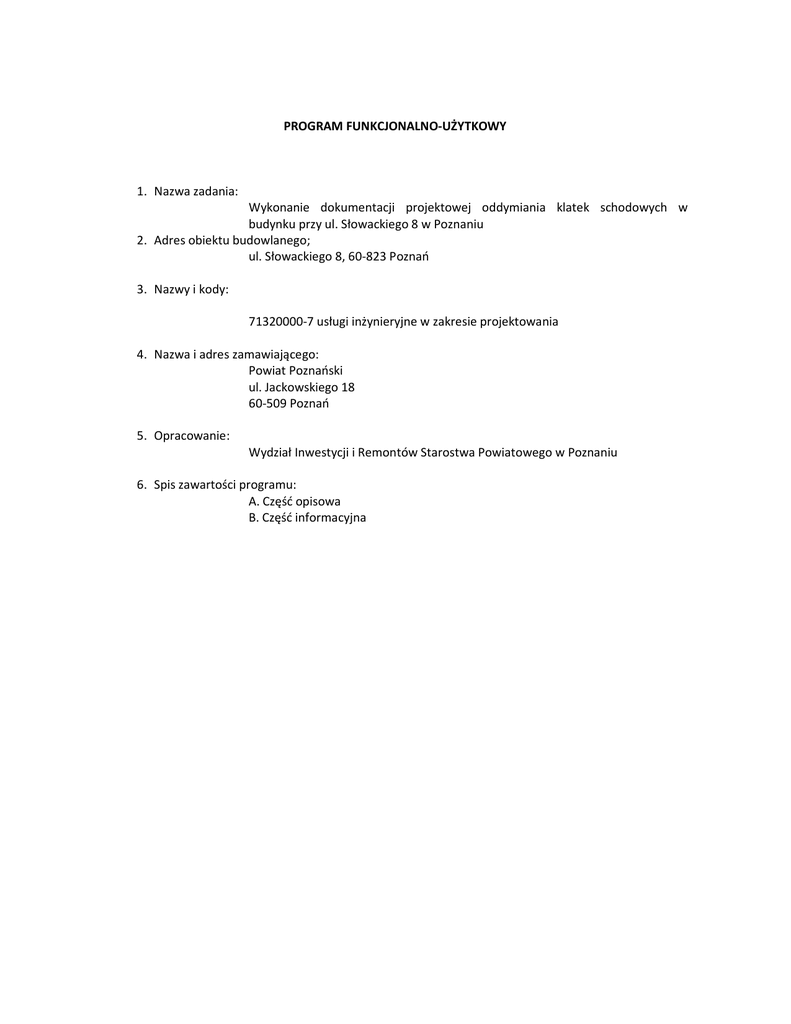 PROGRAM FUNKCJONALNO-UŻYTKOWY 1. Nazwa zadania: Wykonanie dokumentacji projektowej oddymiania klatek schodowych w budynku przy ul. Słowackiego 8 w Poznaniu 2. Adres obiektu budowlanego; ul. Słowackiego 8, 60-823 Poznań 3. Nazwy i kody: 71320000-7 usługi inżynieryjne w zakresie projektowania 4. Nazwa i adres zamawiającego: Powiat Poznański ul. Jackowskiego 18 60-509 Poznań 5. Opracowanie: Wydział Inwestycji i Remontów Starostwa Powiatowego w Poznaniu 6. Spis zawartości programu: A. Część opisowa B. Część informacyjna A. CZĘŚĆ OPISOWA I. Opis przedmiotu zamówienia Przedmiotem zamówienia jest wykonanie pełnobranżowej dokumentacji projektowej instalacji oddymiania dwóch klatek schodowych w budynku przy ul. Słowackiego 8 w Poznaniu. Budynek posiada dwie klatki schodowe do ewakuacji ludzi, usytuowane w lewym i prawym skrzydle budynku. Wszystkie drzwi prowadzące z klatek schodowych na poszczególne kondygnacje są drzwiami aluminiowymi, przeciwpożarowymi o odporności ogniowej EI30. Zakres prac obejmuje wykonanie pełnobranżowej dokumentacji projektowej wraz z wymaganymi prawem uzgodnieniami, w tym: a) projektów budowlano-wykonawczych w branżach: • konstrukcyjnej, • instalacyjnej w zakresie instalacji i urządzeń wentylacji nawiewno-wyciągowej, • instalacyjnej w zakresie sieci, instalacji, urządzeń elektrycznych i elektroenergetycznych, b) specyfikacji technicznych wykonania i odbioru robót, c) przedmiarów robót, d) kosztorysów inwestorskich. II. Opis wymagań zamawiającego w stosunku do przedmiotu zamówienia 1. Instalacja oddymiania Instalacje oddymiania klatek schodowych poprzez system oddymiania grawitacyjnego lub z zastosowaniem wentylacji mechanicznej. 2. Instalacja elektryczna. W zakresie zaprojektowania oddzielnej instalacji elektrycznej: • zasilanie z istniejącej głównej rozdzielni elektroenergetycznej znajdującej się na parterze budynku, • instalacje elektryczne i teletechniczne należy prowadzić na ścianach w bruzdach oraz pod sufitami podwieszanymi korytarzy, • system oddymiania należy podłączyć do istniejącej centrali sygnalizacji pożaru, która znajduje się na parterze budynku, w pomieszczeniu ochrony, • dane dotyczące przyłącza elektroenergetycznego dla budynku: - moc umowna – 140 kW, - średniomiesięczne zużycie energii elektrycznej – 26 000 kWh. 3. Konstrukcyjnej W zakresie mocowania konstrukcji wsporczych urządzeń, wykonania przejść przez stropy i ściany. 4. Inne ustalenia Rozwiązania projektowe muszą być na bieżąco konsultowane i akceptowane przez zamawiającego. Proponowane rozwiązanie muszą jak najmniej ingerować w konstrukcję budynku, oraz spełniać warunki przeciw pożarowe dla budynków użyteczności publicznej. Dokumentacja projektowa, wraz z Specyfikacjami Technicznymi Wykonania i Odbioru Robót, kosztorysami inwestorskimi, przedmiarami robót, musi obejmować całość prac i kosztów niezbędnych do prawidłowej realizacji inwestycji, w tym w szczególności uwzględniać wszystkie prace tymczasowe i towarzyszące niezbędne do wykonania inwestycji, a więc między innymi: wykonanie przekuć w ścianach i stropach, ich zamurowanie po wykonaniu instalacji, prowadzenie przewodów zasilających w bruzdach i sufitach podwieszanych, wykonanie wyprawek tynkarskich i malarskich. Zastosowane materiały muszą posiadać wymagane prawem dopuszczenia do stosowania w budownictwie. W tytułach i opisach poszczególnych opracowań należy używać nazw podanych przez Zamawiającego. Prace należy wykonać zgodnie z obowiązującymi przepisami prawa budowlanego, warunkami technicznymi jakim powinny odpowiadać budynki i ich usytuowanie, normami i przepisami oraz warunkami umowy. Dla opracowanej dokumentacji Projektant zobowiązany jest do uzyskania pozytywnej opinii Rzeczoznawcy do spraw zabezpieczeń przeciwpożarowych, oraz innych opinii, uzgodnień lub odstępstw niezbędnych dla uzyskania pozwolenia na budowę. Załącznikami do niniejszego programu są: • Rzuty i przekroje budynku. Uwaga: Projektant zobowiązany jest do weryfikacji stanu istniejącego w zakresie wymiarów, konstrukcji i materiałów. Maksymalny termin realizacji: do 14 tygodni od dnia podpisania umowy. III. Zakres dokumentacji: 1. Dokumentacja projektowa: a. Dokumentacja projektowa winna zawierać pełnobranżowy projekt budowlanowykonawczy systemu oddymiania klatek schodowych wraz z opisem technologii. b. Specyfikacje Techniczne Wykonania i Odbioru Robót dla wszystkich branż, winny w sposób szczegółowy opisywać technologię wykonania poszczególnych prac koniecznych do prawidłowej realizacji inwestycji, wraz z określeniem parametrów technicznych zastosowanych w projekcie materiałów i urządzeń, umożliwiając zastosowanie równoważnych rozwiązań. c. Przedmiary robót dla wszystkich branż, winny uwzględniać wszelkie prace niezbędne do prawidłowej realizacji inwestycji, tj. wykonanie instalacji elektrycznych, wentylacyjnych, wraz z montażem urządzeń dla wentylacji oraz wszelkie roboty budowlane i wykończeniowe niezbędne do prawidłowej realizacji zadania. Przedmiary robót, powinny zostać sporządzone w sposób umożliwiający prawidłowe oszacowanie kosztów realizacji prac przez Wykonawcę robót. d. Kosztorysy inwestorskie dla wszystkich branż, winny zostać sporządzone na podstawie przedmiarów robót oraz danych wyjściowych do kosztorysowania spisanych z Zamawiającym. B. CZĘŚĆ INFORMACYJNA I. Lokalizacja obiektu Budynek usytuowany jest przy ul. Słowackiego 8 w Poznaniu, w strefie objętej ochroną konserwatorską. Posiada pięć kondygnacji nadziemnych i częściowe podpiwniczenie. Wykonany w układzie konstrukcyjnym mieszanym, częściowo żelbetowym, częściowo tradycyjnym, ze ścianami zewnętrznymi szczytowymi i wewnętrznymi z cegły pełnej o zróżnicowanej grubości, stropy gęstożebrowe, ceramiczno-żelbetowe, stropodach wentylowany. Wykonawca otrzyma podkłady projek